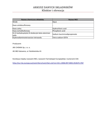 ARKUSZ DANYCH SKŁADNIKÓW Klinkier i elewacja Nazwa chemiczna składnika Nazwa INCI Woda Aqua Kwas amidosulfonowy - Kwas solny Kwas (orto)fosforowy N-(2-karboksyetylo)-N-dodecylo-beta-alaninian sodu Etylenodiaminotetraoctan tetrasodu Hydrochloric acid Phosphoric acid Sodium lauriminodipropionate Tetra sodium EDTA Producent: JKK CHEMIA Sp. z o. o. 40-382 Katowice, ul. Roździeńska 41 Korelacja między nazwami INCI, nazwami Farmakopei Europejskiej i numerami CAS http://eur-lex.europa.eu/LexUriServ/LexUriServ.do?uri=OJ:L:2006:097:0001:0528:PL:PDF
