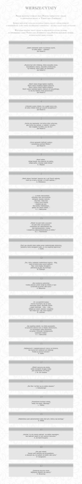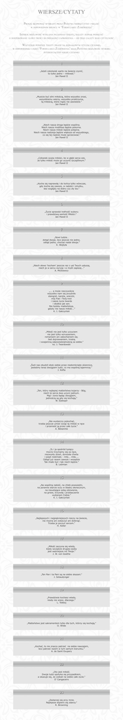 WIERSZE/CYTATY PROSZĘ SKOPIOWAĆ WYBRANY PRZEZ PAŃSTWA WIERSZ/CYTAT I WKLEIĆ W ODPOWIEDNIM MIEJSCU W ‘FORMULARZU ZAMÓWIENIA’ ISTNIEJE MOŻLIWOŚĆ WYSŁANIA WŁASNEGO TEKSTU, NALEŻY JEDNAK PAMIĘTAĆ O DOSTOSOWANIU ILOŚCI TREŚCI DO WIELKOŚCI ZAPROSZENIA – OD TEGO ZALEŻY JEGO CZYTELNOŚĆ WSZYSTKIE PONIŻSZE TEKSTY PISANE SĄ JEDNAKOWYM STYLEM CZCIONKI, W ODPOWIEDNIEJ CZĘŚCI ‘FORMULARZA ZAMÓWIENIA’ MAJĄ PAŃSTWO MOŻLIWOŚĆ WYBORU INTERESUJĄCEGO KROJU CZCIONKI 1 „Jeżeli cokolwiek warto na świecie czynić, to tylko jedno – miłować.” Jan Paweł II 2 „Musicie być silni miłością, która wszystko znosi, wszystkiemu wierzy, wszystko przetrzyma, tą miłością, która nigdy nie zawiedzie.” Jan Paweł II 3 „Niech nasza droga będzie wspólna. Niech nasza modlitwa będzie pokorna. Niech nasza miłość będzie potężna. Niech nasza nadzieja będzie większa od wszystkiego, co się tej nadziei może sprzeciwiać.” Jan Paweł II 4 „Człowiek szuka miłości, bo w głębi serca wie, że tylko miłość może go uczynić szczęśliwym.” Jan Paweł II 5 „Kocha się naprawdę i do końca tylko wówczas, gdy kocha się zawsze, w radości i smutku, bez względu na dobry czy zły los.” Jan Paweł II 6 „Życie sprawdzi trafność wyboru i prawdziwą wartość Miłości.” Jan Paweł II 7 „Nowi ludzie… dotąd dwoje, lecz jeszcze nie jedno, odtąd jedno, chociaż nadal dwoje.” K. Wojtyła 8 „Niech słowo 'kocham' jeszcze raz z ust Twych usłyszę, niech je w sercu wyryję i w myśli zapiszę...” A. Mickiewicz 9 „... a może rzeczywiście wszystko nam się przyśniło stangret, kareta, wieczór, mój frak i Twój tren i nasze życie twarde i słodkie jak sen. Nie byłoby małżeństwa, gdyby nie nasza miłość...” K. I. Gałczyński 10 „Miłość nie jest tylko uczuciem nie jest tylko wzruszeniem, romansem ani zakochaniem się. Jest dojrzewaniem, troską i wzajemną odpowiedzialnością za siebie.” ks. J. Twardowski 11 „Świt nas obudził obok siebie przez niedomknięte okiennice, jesteśmy teraz dwojgiem ludzi, co ma wspólną tajemnicę.” J. Kofta 12 „Ten, który najlepiej małżeństwa kojarzy - Bóg, niech te serca dwa uczyni jednym. Mąż i żona będąc dwojgiem, jednością są gdy się kochają.” W. Szekspir 13 „Nie wystarczy pokochać, trzeba jeszcze umieć wziąć tę miłość w ręce i przenieść ją przez całe życie.” A. Bekannte 14 „Ty i ja spośród tysięcy mocno trzymamy się za ręce, niezwykły dzień, doniosła chwila i szept nieśmiały : miły... miła.... Odtąd już razem zawsze i wszędzie Tak miało być i tak niech będzie.” B. Leśmian 15 „Na wspólną radość, na chleb powszedni, na poranne otarcie oczu w blasku słonecznym, na nieustające sobą zdziwienie, na gniew, krzywdę i przebaczenie wybieram Ciebie.” K. I. Gałczyński 16 „Najlepszych i najpiękniejszych rzeczy na świecie, nie można ani zobaczyć ani dotknąć. Trzeba je poczuć sercem.” H. Keller 17 „Miłość zaczyna się wtedy, kiedy szczęście drugiej osoby jest ważniejsze niż Twoje.” J. W. von Goethe 18 „Ten Pan i ta Pani są na siebie skazani.” J. Sztaudynger 19 „Prawdziwie kochasz wtedy, kiedy nie wiesz, dlaczego.” L. Tołstoj 20 „Małżeństwo jest sakramentem tylko dla tych, którzy się kochają.” O. Wilde 21 „Kochać, to nie znaczy patrzeć na siebie nawzajem, lecz patrzeć razem w tym samym kierunku.” A. de Saint Exupery 22 „Oto jest miłość. Dwoje ludzi spotyka się przypadkiem, a okazuje się, że czekali na siebie całe życie.” O' Cangaceiro 23 „Zestarzej się przy mnie. Najlepsze dopiero się zdarzy.” R. Browning