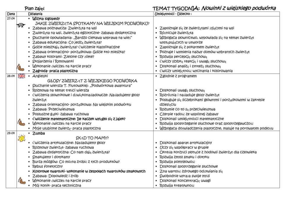 Plan zajęć Data 27.04 28.04 29.04 TEMAT TYGODNIA: Nowinki z wiejskiego podwórka Działania Umiejętności - Dziecko : Wizyta logopedy JAKIE ZWIERZĘTA SPOTKAMY NA WIEJSKIM PODWÓRKU? Zabawa poznawcza: Zwierzęta na wsi Zwierzęta na wsi, zwierzęta egzotyczne- zabawa dydaktyczna Słuchanie opowiadania: „Bardzo ciekawa wyprawa na wieś” Zabawa edukacyjna: Co jedzą zwierzęta? Gdzie mieszkają zwierzęta? Ćwiczenie klasyfikacyjne Zabawa orientacyjno- porządkowa: Gdzie kto mieszka? Zabawy kolorami: Zielone czy żółte? Skojarzenia i Rymowanki Wykonanie ćwiczeń na karcie pracy Zagroda- praca plastyczna Zapoznaje się ze zwierzętami żyjącymi na wsi Różnicuje zwierzęta Wzbogaca słownictwo, wypowiada się na temat zwierząt występujących w utworze Zapoznaje się z pokarmem zwierząt Poznaje i wymienia nazwy domów wybranych zwierząt Rozwija percepcję słuchową Ćwiczy szybką reakcję i uwagę słuchową Doskonali analizę i syntezę słuchową Ćwiczy umiejętność wycinania i kolorowania Angielski GŁOSY ZWIERZĄT Z WIEJSKIEGO PODWÓRKA Słuchanie wiersza T. Fiutowskiej: „Podwórkowa awantura” Rozmowa na temat treści wiersza Ćwiczenia słownikowe i dźwiękonaśladowcze: Naśladujemy głosy zwierząt Zabawa orientacyjno- porządkowa: Na wiejskim podwórku Zabawa: Przeciwieństwa Posłuszne gąski- zabawa ruchowa Ćwiczenie matematyczne: Ile kaczek wylęgło się z jajek? Wykonanie ćwiczeń na karcie pracy Moje ulubione zwierzę- praca plastyczna Zumba SKĄD TO MAMY? Ćwiczenia artykulacyjne: Naśladujemy głosy Rozmowy zwierząt- zabawa ruchowa Zabawa dydaktyczna: Co nam dają zwierzęta? Smakujemy i dotykamy Burza mózgów: Co można zrobić z tych produktów? Rebus fonetyczny Kolorowe twarożki- wykonanie w zespołach twarożków smakowych Zabawa: Dopowiedz i zrób Wykonanie ćwiczeń na karcie pracy Mój konik- praca techniczna Zgodnie z programem Doskonali uwagę słuchową Rozróżnia i naśladuje głosy zwierząt Posługuje się liczebnikami głównymi i porządkowymi w zakresie dziesięciu Rozumie co to są przeciwieństwa Czerpie radość ze wspólnej zabawy Doskonali umiejętności matematyczne Rozwija spostrzeganie słuchowe oraz spostrzegawczość Wzbogaca doświadczenia plastyczne, maluje na porowatym podłożu Doskonali aparat artykulacyjny Uczy się współpracy w grupie Określa korzyści płynące z hodowli zwierząt dla człowieka Rozwija zmysł smaku i dotyku Rozwija pomysłowość Doskonali spostrzeganie słuchowe Zna wartość zdrowego odżywiania się Swobodnie wyraża swoje myśli Doskonali koncentrację uwagi Rozwija kreatywność 30.04 Angielski Rytmika Zgodnie z programem RODZICE I ICH DZIECI Zabawa: Przysłowia Słuchania opowiadania J. Jasny: „Gdzie jest wieś?” Dorosłe i młode zwierzęta- Ćwiczenie klasyfikacyjne Zabawa inhibicyjno-incytacyjna: Słuchamy sygnałów Zabawy przy piosence: „Gąski i lis” Gąski i lis- zabawa ruchowa Wykonanie ćwiczeń na karcie pracy Praca plastyczna: Zwierzęta z wiejskiego podwórka 01.05 ŚWIĘTO PRACY Zapoznaje się z wybranymi przysłowiami, których bohaterami są zwierzęta Rozwija umiejętność opowiadania i myślenia Poznaje rodziny zwierząt Rozwija poczucie rytmu i muzykalności Aktywnie uczestniczy w zabawie ruchowej Rozwija szybką reakcję na sygnał Utrwala zdobyte wiadomości Doskonali motorykę małą