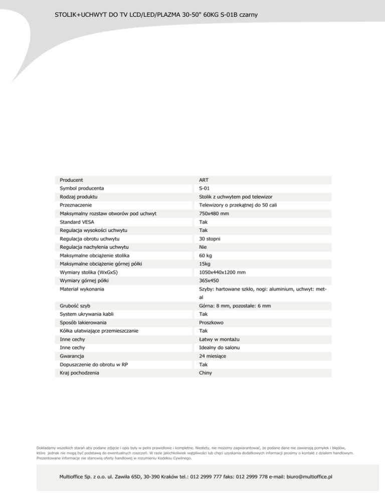 STOLIK+UCHWYT DO TV LCD/LED/PLAZMA 30-50" 60KG S-01B czarny Producent ART Symbol producenta S-01 Rodzaj produktu Stolik z uchwytem pod telewizor Przeznaczenie Telewizory o przekątnej do 50 cali Maksymalny rozstaw otworów pod uchwyt 750x480 mm Standard VESA Tak Regulacja wysokości uchwytu Tak Regulacja obrotu uchwytu 30 stopni Regulacja nachylenia uchwytu Nie Maksymalne obciążenie stolika 60 kg Maksymalne obciążenie górnej półki 15kg Wymiary stolika (WxGxS) 1050x440x1200 mm Wymiary górnej półki 365x450 Materiał wykonania Szyby: hartowane szkło, nogi: aluminium, uchwyt: metal Grubość szyb Górna: 8 mm, pozostałe: 6 mm System ukrywania kabli Tak Sposób lakierowania Proszkowo Kółka ułatwiające przemieszczanie Tak Inne cechy Łatwy w montażu Inne cechy Idealny do salonu Gwarancja 24 miesiące Dopuszczenie do obrotu w RP Tak Kraj pochodzenia Chiny Dokładamy wszelkich starań aby podane zdjęcie i opis były w pełni prawidłowe i kompletne. Niestety, nie możemy zagwarantować, że podane dane nie zawierają pomyłek i błędów, które jednak nie mogą być podstawą do ewentualnych roszczeń. W razie jakichkolwiek wątpliwości lub chęci uzyskania dodatkowych informacji prosimy o kontakt z działem handlowym. Prezentowane informacje nie stanowią oferty handlowej w rozumieniu Kodeksu Cywilnego. Multioffice Sp. z o.o. ul. Zawiła 65D, 30-390 Kraków tel.: 012 2999 777 faks: 012 2999 778 e-mail: [email protected]