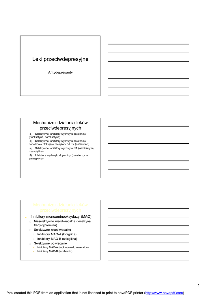 Leki przeciwdepresyjne Antydepresanty Mechanizm działania leków przeciwdepresyjnych –c) Selektywne inhibitory wychwytu serotoniny (fluoksetyna, paroksetyna) –d) Selektywne inhibitory wychwytu serotoniny dodatkowo blokujące receptory 5-HT2 (nefazodon) –e) Selektywne inhibitory wychwytu NA (reboksetyna, maprotylina) –f) Inhibitory wychwytu dopaminy (nomifenzyna, amineptyna) Mechanizm działania leków przeciwdepresyjnych 2. Inhibitory monoaminooksydazy (MAO) a) b) c) Nieselektywne nieodwracalne (fenelzyna, tranylcypromina) Selektywne nieodwracalne i. Inhibitory MAO-A (klorgilina) ii. Inhibitory MAO-B (selegilina) Selektywne odwracalne iii. iv. Inhibitory MAO-A (moklobemid, toloksaton) Inhibitory MAO-B (lazabemid) 1 You created this PDF from an application that is not licensed to print to novaPDF printer (http://www.novapdf.com) Mechanizm działania leków przeciwdepresyjnych 3. 4. Leki o przeważającym działaniu blokujacym receptory α2-adrenergiczne (zlokalizowane presynaptycznie na neuronach serotoninergicznych) (mirtazapina, mianseryna) Leki o innym działaniu (tianeptyna) Zastosowanie terapeutyczne • Depresja • Stany lękowe, napady lęku, fobia społeczna, nerwica natręctw • Przewlekłe zaburzenia bólowe, leczenie bólu neuropatycznego (zespoły neuropatii cukrzycowej, związany z półpaśćcem) • Przedmiesiączkowe zaburzenia dysforyczne (PMS)(terapia 2-tygodniowa) Zastosowanie terapeutyczne • Rzucanie palenia - bupropion • Moczenie nocne u dzieci i dorosłych • W zaburzeniach z deficytem uwagi i nadmierną aktywnością 2 You created this PDF from an application that is not licensed to print to novaPDF printer (http://www.novapdf.com) Zastosowanie terapeutyczne • • • • • • • Zespół jelita drażliwego Uderzenia gorąca w przebiegu menopauzy Chroniczne zmęczenie Tiki Migrena Zespół bezdechu sennego Zaburzenia jedzenia, w bulimii – fluoksetyna; w leczeniu otyłości - bupropion Trójpierścieniowe leki przeciwdepresyjne Imipramina Dezypramina (Petylyl) Klomipramina (Anafranil) Amitryptylina (Amitryptylinum) Doksepina (Doxepin) Inne zastosowania: Leczenie migreny W leczeniu bólu przewlekłego, którego pochodzenie jest niejasne W bólu neuropatycznym 3 You created this PDF from an application that is not licensed to print to novaPDF printer (http://www.novapdf.com) Leki selektywnie blokujące wychwyt NA i 5HT, czyli leki o „podwójnym” działaniu (SNRI) Wenlafaksyna (Alventa, Efectin, Jarvis, Symfaxin, Velafax, Velaxin, Venlectine) Milnacipran (Ixel) Duloksetyna Leki selektywnie blokujące wychwyt NA i 5HT, czyli leki o „podwójnym” działaniu (SNRI) • Działania niepożądane: – Nudności – Zawroty głowy – Uczucie zmęczenia – Bezsenność, nadmierna nerwowość – Zaparcia – Zwiększone pocenie się – Zaburzenia czynności seksualnych – Nadciśnienie tętnicze, tachykardia Zastosowanie Leki przeciwdepresyjne (w przypadku braku aktywności SSRIs) Depresja związana z chronicznym bólem (ból pleców) W symptomach bólu neuropatycznego (neuropatii cukrzycowej) 4 You created this PDF from an application that is not licensed to print to novaPDF printer (http://www.novapdf.com) Selektywne inhibitory wychwytu serotoniny (SSRI) Fluoksetyna Paroksetyna Fluwoksamina Sertalina Citalopram SSRI – selective serotonin reuptuke inhibitors Selektywne inhibitory wychwytu serotoniny dodatkowo blokujące receptory 5-HT2 Nefazodon (ryzyko hepatotoksyczności) Trazodon (Trittico) Blokuje receptory 5-HT2 Wykazują działanie sedatywne, prawdopodobnie związane z blokowaniem H1 Blokuje receptory α1 i α2-adrenergiczne Działania niepożądane: uczucie zmęczenia, bóle i zawroty głowy, drgawki, hipotonia ortostatyczna, priapizm Selektywne inhibitory wychwytu NA NRI Reboksetyna (Edronax) Stosowana u pacjentów z depresją i zahamowaniem psychoruchowym Maprotylina (Ludiomil) –zaliczana przez niektórych do TLPD (bez wpływu na wychwyt 5-HT) 5 You created this PDF from an application that is not licensed to print to novaPDF printer (http://www.novapdf.com) Inhibitory monoaminooksydazy MAO-I a) b) c) Nieselektywne nieodwracalne (fenelzyna) Selektywne nieodwracalne i. Inhibitory MAO-A (klorgilina) ii. Inhibitory MAO-B (selegilina) Selektywne odwracalne iii. iv. Inhibitory MAO-A (moklobemid, toloksaton) Inhibitory MAO-B (lazabemid) Leki o przeważającym działaniu blokujacym receptory α2adrenergiczne • Mirtazapina (Remeron, Mirzaten) • Mianseryna (Lerivon, Mianserin) – Blokuje receptory α2-adrenergiczne presynaptyczne na neuronach serotoninergicznych – Blokuje receptory histaminowe H1 – Blokuje receptory 5-HT2 – Silne działanie sedatywne – Przyrost masy ciała w ostrej fazie leczenia 6 You created this PDF from an application that is not licensed to print to novaPDF printer (http://www.novapdf.com)