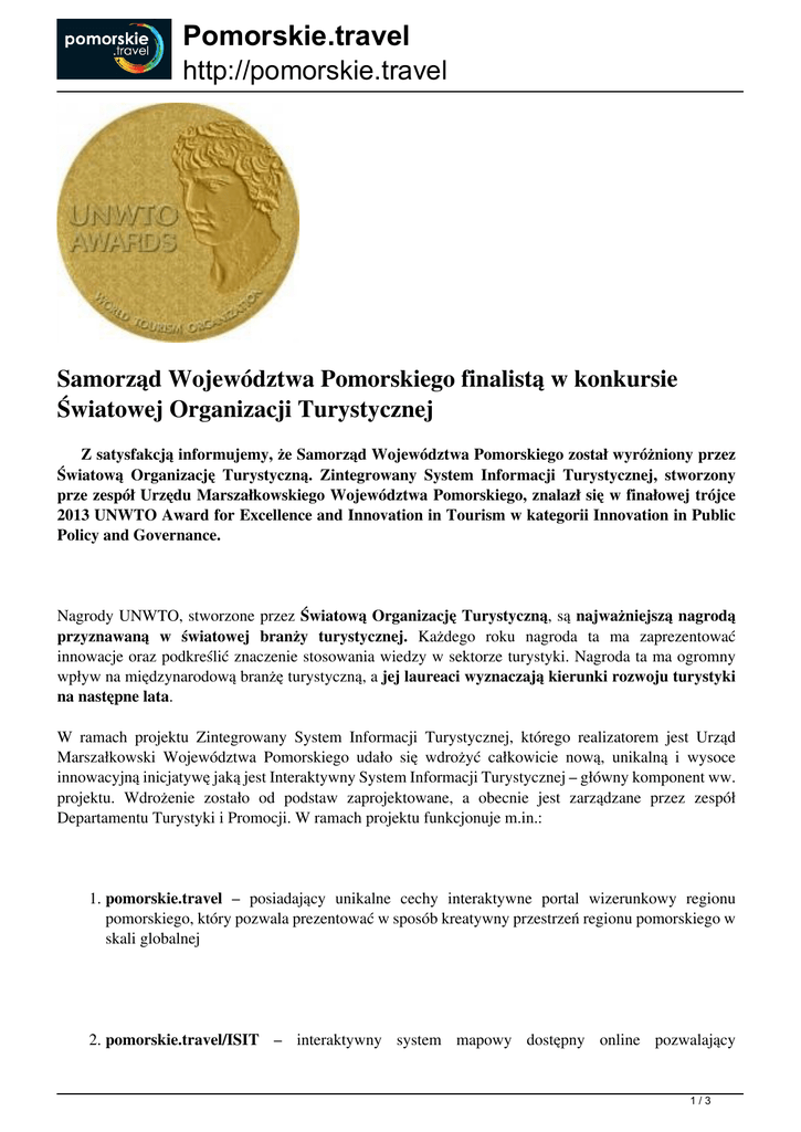 Pomorskie.travel http://pomorskie.travel Samorząd Województwa Pomorskiego finalistą w konkursie Światowej Organizacji Turystycznej Z satysfakcją informujemy, że Samorząd Województwa Pomorskiego został wyróżniony przez Światową Organizację Turystyczną. Zintegrowany System Informacji Turystycznej, stworzony prze zespół Urzędu Marszałkowskiego Województwa Pomorskiego, znalazł się w finałowej trójce 2013 UNWTO Award for Excellence and Innovation in Tourism w kategorii Innovation in Public Policy and Governance. Nagrody UNWTO, stworzone przez Światową Organizację Turystyczną, są najważniejszą nagrodą przyznawaną w światowej branży turystycznej. Każdego roku nagroda ta ma zaprezentować innowacje oraz podkreślić znaczenie stosowania wiedzy w sektorze turystyki. Nagroda ta ma ogromny wpływ na międzynarodową branżę turystyczną, a jej laureaci wyznaczają kierunki rozwoju turystyki na następne lata. W ramach projektu Zintegrowany System Informacji Turystycznej, którego realizatorem jest Urząd Marszałkowski Województwa Pomorskiego udało się wdrożyć całkowicie nową, unikalną i wysoce innowacyjną inicjatywę jaką jest Interaktywny System Informacji Turystycznej – główny komponent ww. projektu. Wdrożenie zostało od podstaw zaprojektowane, a obecnie jest zarządzane przez zespół Departamentu Turystyki i Promocji. W ramach projektu funkcjonuje m.in.: 1. pomorskie.travel – posiadający unikalne cechy interaktywne portal wizerunkowy regionu pomorskiego, który pozwala prezentować w sposób kreatywny przestrzeń regionu pomorskiego w skali globalnej 2. pomorskie.travel/ISIT – interaktywny system mapowy dostępny online pozwalający 1/3 Pomorskie.travel http://pomorskie.travel prezentować różne grupy i kategorie informacji bezpośrednio na mapie udostępniony dla użytkowników w dynamicznej i przystępnej formie 3. system ISIT w sieci 245 infomatów – innowacyjna i zaawansowana technologicznie infrastruktura dostępu do cyfrowej informacji w przestrzeni publicznej z rozwijanymi w ramach systemu usługami SMART np.: „żyjąca” mapa regionu i miast z przestrzenią interaktywnych informacji powiązanych z ich geolokalizacją i multimediami, synergia z rozkładami jazdy, bazą aktualnych wydarzeń, dystrybucją treści cyfrowych na urządzenia mobilne, możliwością tworzenia własnych scenariuszy pobytu w określonej lokalizacji, kampanie cyfrowe). Poniżej prezentujemy wszystkie wyróżnione projekty: 2013 UNWTO Award for Excellence and Innovation in Tourism (list in alphabetical order) UNWTO Ulysses Award for Innovation in Public Policy and Governance • Interactive System of Tourist Information, Office of the Marshal of the Pomorskie Voivodeship, Poland. • Kwita Izina, Rwanda Development Board, Rwanda • Responsible Tourism Project at Kumarakom, Department of Tourism, Government of Kerala, India UNWTO Ulysses Award for Innovation in Enterprises • Arromanches 1944, Biplan, France • Hotel ICON Ltd, ICON Hotel, Hong Kong SAR, China • International Quality Brand for Hospitality for All, Village for All, Italy • Talasoplaya Spa Project, Fundación Aqua Maris y Summum Design Global Projects, Spain UNWTO Ulysses Award for Innovation in Non-Governmental Organizations • Alqueva Dark Sky Programme, Genuineland, Portugal • Big Blog Exchange, Hostelling International, United Kingdom • From Charity to Social Entrepreneurship, Borneo Ecotourism Solutions and Technologies Society, Malaysia UNWTO Ulysses Award for Innovation in Research and Technology • 3D AR Virtual Portal, DSP Studio & Momentum Studio, Croatia • Smart Tour Guide, Korean Tourism Organization, Republic of Korea • V4A Inside, Village for All, Italy Ogłoszenie zwycięzców oraz wręczenie nagród odbędzie się podczas finał konkursu zaplanowanego na 22 stycznia 2014 roku w Madrycie. 2/3 Pomorskie.travel http://pomorskie.travel Opracowano na podstawie: http://know.unwto.org/en/content/unwto-awards-excellence-and-innovation-tourism Koncepcja ISIT, Rafał Baranowski, Departament Turystyki i Promocji UMWP Rafał Baranowski (rbaranowski) 3/3 Powered by TCPDF (www.tcpdf.org)