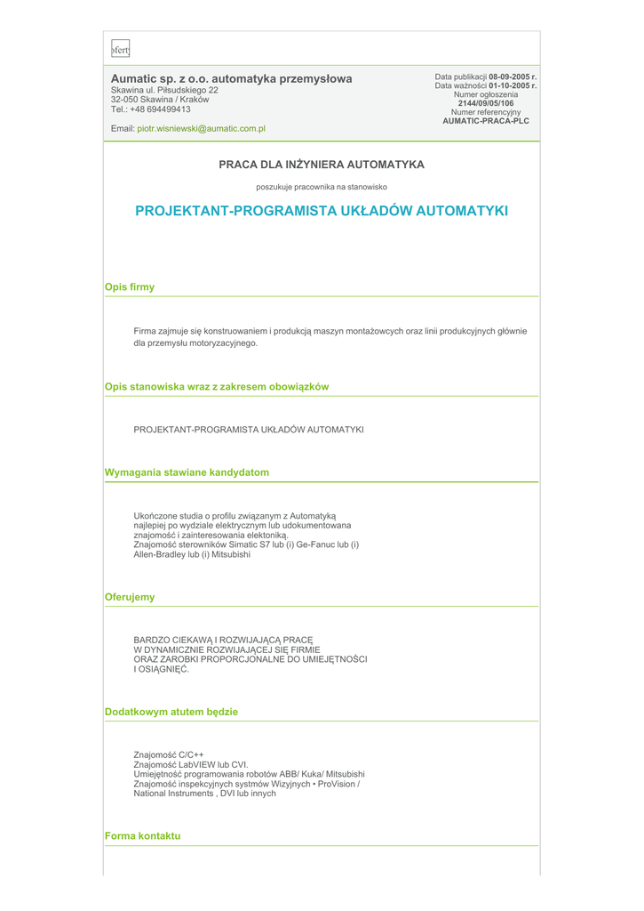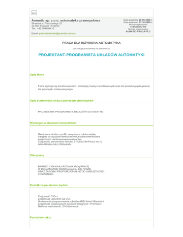 praca, oferty pracy Aumatic sp. z o.o. automatyka przemysłowa Skawina ul. Piłsudskiego 22 32-050 Skawina / Kraków Tel.: +48 694499413 Email: [email protected] Data publikacji 08-09-2005 r. Data ważności 01-10-2005 r. Numer ogłoszenia 2144/09/05/106 Numer referencyjny AUMATIC-PRACA-PLC PRACA DLA INŻYNIERA AUTOMATYKA poszukuje pracownika na stanowisko PROJEKTANT-PROGRAMISTA UKŁADÓW AUTOMATYKI Opis firmy Firma zajmuje się konstruowaniem i produkcją maszyn montażowcych oraz linii produkcyjnych głównie dla przemysłu motoryzacyjnego. Opis stanowiska wraz z zakresem obowiązków PROJEKTANT-PROGRAMISTA UKŁADÓW AUTOMATYKI Wymagania stawiane kandydatom Ukończone studia o profilu związanym z Automatyką najlepiej po wydziale elektrycznym lub udokumentowana znajomość i zainteresowania elektoniką. Znajomość sterowników Simatic S7 lub (i) Ge-Fanuc lub (i) Allen-Bradley lub (i) Mitsubishi Oferujemy BARDZO CIEKAWĄ I ROZWIJAJĄCĄ PRACĘ W DYNAMICZNIE ROZWIJAJĄCEJ SIĘ FIRMIE ORAZ ZAROBKI PROPORCJONALNE DO UMIEJĘTNOŚCI I OSIĄGNIĘĆ. Dodatkowym atutem będzie Znajomość C/C++ Znajomość LabVIEW lub CVI. Umiejętność programowania robotów ABB/ Kuka/ Mitsubishi Znajomość inspekcyjnych systmów Wizyjnych • ProVision / National Instruments , DVI lub innych Forma kontaktu kontakt z kierownikiem działu elektrycznego: kontakt z kierownikiem działu elektrycznego: Piotr Wiśniewski [email protected] Informacje dodatkowe Minimalne wykształcenie: wyższe Branża: Automatyka i robotyka Forma zatrudnienia: umowa o pracę Wymiar pracy: pełny etat Wynagrodzenie (netto): 1300 Lokalizacja: Polska Województwo: małopolskie, Miejsce pracy miasto(a) lub kraj(e): Skawina, Kraków Prawo jazdy: tak Znajomość języka obcego: tak Ogłoszenie pochodzi z portalu www.i-praca.pl - Internetowy Portal Pracy ilość wyświetleń: 6954