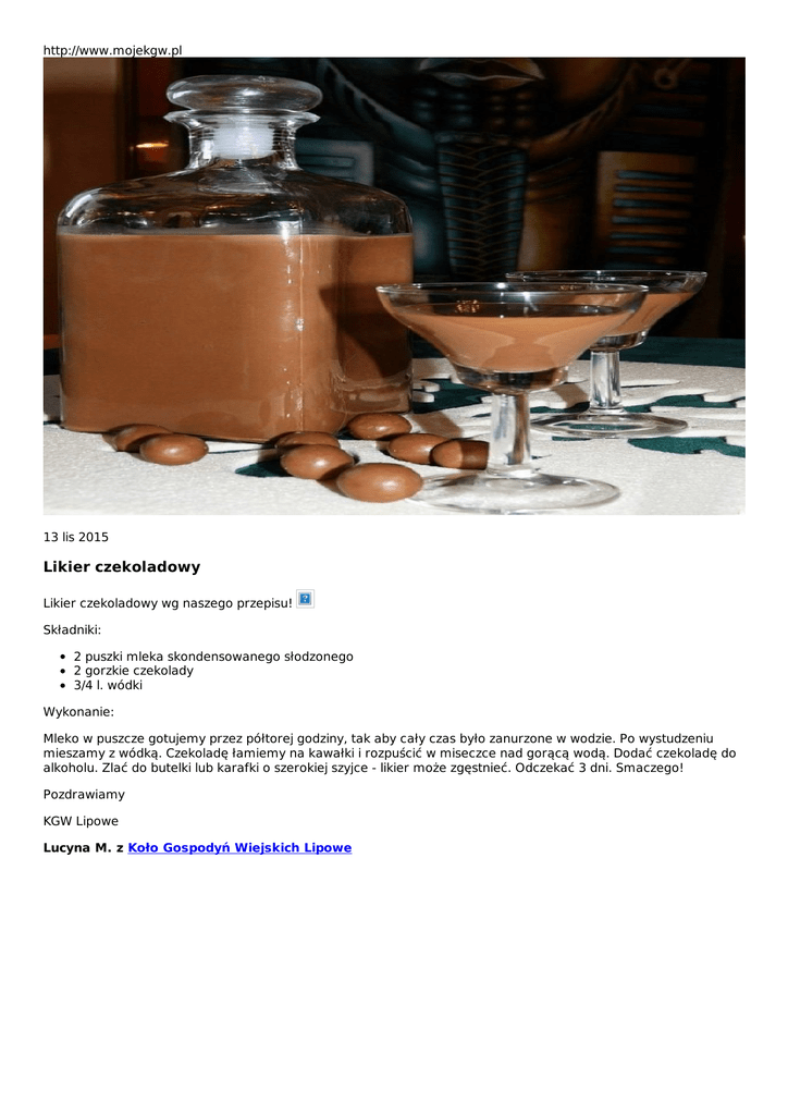 http://www.mojekgw.pl 13 lis 2015 Likier czekoladowy Likier czekoladowy wg naszego przepisu! Składniki: 2 puszki mleka skondensowanego słodzonego 2 gorzkie czekolady 3/4 l. wódki Wykonanie: Mleko w puszcze gotujemy przez półtorej godziny, tak aby cały czas było zanurzone w wodzie. Po wystudzeniu mieszamy z wódką. Czekoladę łamiemy na kawałki i rozpuścić w miseczce nad gorącą wodą. Dodać czekoladę do alkoholu. Zlać do butelki lub karafki o szerokiej szyjce - likier może zgęstnieć. Odczekać 3 dni. Smaczego! Pozdrawiamy KGW Lipowe Lucyna M. z Koło Gospodyń Wiejskich Lipowe