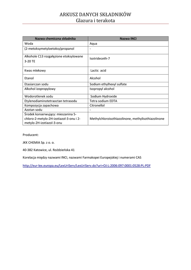 ARKUSZ DANYCH SKŁADNIKÓW Glazura i terakota Nazwa chemiczna składnika Nazwa INCI Woda (2-metoksymetyloetoksy)propanol Aqua - Alkohole C13 rozgałęzione etoksylowane 3-20 TE Isotrideceth-7 Kwas mlekowy Lactic acid Etanol Alcohol Etasiarczan sodu Alkohol izopropylowy Sodium ethylhexyl sulfate Isopropyl alcohol Wodorotlenek sodu Etylenodiaminotetraoctan tetrasodu Kompozycja zapachowa Azotan sodu Środek konserwujący: mieszanina 5chloro-2-metylo-2H-izotiazol-3-onu i 2metylo-2H-izotiazol-3-onu Sodium Hydroxide Tetra sodium EDTA Citronellol Methylchloroisothiazolinone, methylisothiazolinone Producent: JKK CHEMIA Sp. z o. o. 40-382 Katowice, ul. Roździeńska 41 Korelacja między nazwami INCI, nazwami Farmakopei Europejskiej i numerami CAS http://eur-lex.europa.eu/LexUriServ/LexUriServ.do?uri=OJ:L:2006:097:0001:0528:PL:PDF