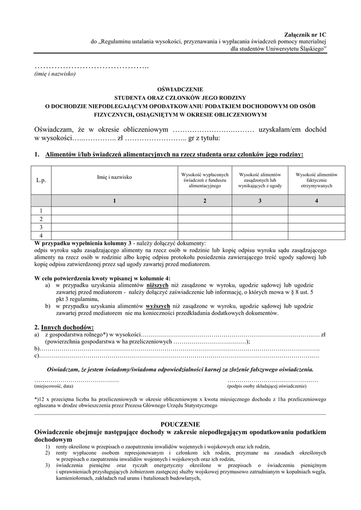 Załącznik nr 1C do „Regulaminu ustalania wysokości, przyznawania i wypłacania świadczeń pomocy materialnej dla studentów Uniwersytetu Śląskiego” ………………………………….. (imię i nazwisko) OŚWIADCZENIE STUDENTA ORAZ CZŁONKÓW JEGO RODZINY O DOCHODZIE NIEPODLEGAJĄCYM OPODATKOWANIU PODATKIEM DOCHODOWYM OD OSÓB FIZYCZNYCH, OSIĄGNIĘTYM W OKRESIE OBLICZENIOWYM Oświadczam, że w okresie obliczeniowym …………………….……… uzyskałam/em dochód w wysokości…..………….. zł …………………….. gr z tytułu: 1. Alimentów i/lub świadczeń alimentacyjnych na rzecz studenta oraz członków jego rodziny: L.p. Imię i nazwisko Wysokość wypłaconych świadczeń z funduszu alimentacyjnego Wysokość alimentów zasądzonych lub wynikających z ugody Wysokość alimentów faktycznie otrzymywanych 1 2 3 4 1 2 3 4 W przypadku wypełnienia kolumny 3 - należy dołączyć dokumenty: odpis wyroku sądu zasądzającego alimenty na rzecz osób w rodzinie lub kopię odpisu wyroku sądu zasądzającego alimenty na rzecz osób w rodzinie albo kopię odpisu protokołu posiedzenia zawierającego treść ugody sądowej lub kopię odpisu zatwierdzonej przez sąd ugody zawartej przed mediatorem. W celu potwierdzenia kwoty wpisanej w kolumnie 4: a) w przypadku uzyskania alimentów niższych niż zasądzone w wyroku, ugodzie sądowej lub ugodzie zawartej przed mediatorem - należy dołączyć zaświadczenie lub informację, o których mowa w § 8 ust. 5 pkt 3 regulaminu, b) w przypadku uzyskania alimentów wyższych niż zasądzone w wyroku, ugodzie sądowej lub ugodzie zawartej przed mediatorem nie ma konieczności przedkładania dodatkowych dokumentów. 2. Innych dochodów: z gospodarstwa rolnego*) w wysokości………………………………………………………………………….…. zł (powierzchnia gospodarstwa w ha przeliczeniowych ………………………………); b)…………………………………………………………………………………………………………………………. c)……………………………………………………………………………………………………………………….… a) Oświadczam, że jestem świadomy/świadoma odpowiedzialności karnej za złożenie fałszywego oświadczenia. …………………………………… ……………………………………… (miejscowość, data) (podpis osoby składającej oświadczenie) *)12 x przeciętna liczba ha przeliczeniowych w okresie obliczeniowym x kwota miesięcznego dochodu z 1ha przeliczeniowego ogłaszana w drodze obwieszczenia przez Prezesa Głównego Urzędu Statystycznego ___________________________________________________________________________________________________________ POUCZENIE Oświadczenie obejmuje następujące dochody w zakresie niepodlegającym opodatkowaniu podatkiem dochodowym 1) 2) 3) renty określone w przepisach o zaopatrzeniu inwalidów wojennych i wojskowych oraz ich rodzin, renty wypłacone osobom represjonowanym i członkom ich rodzin, przyznane na zasadach określonych w przepisach o zaopatrzeniu inwalidów wojennych i wojskowych oraz ich rodzin, świadczenia pieniężne oraz ryczałt energetyczny określone w przepisach o świadczeniu pieniężnym i uprawnieniach przysługujących żołnierzom zastępczej służby wojskowej przymusowo zatrudnianym w kopalniach węgla, kamieniołomach, zakładach rud uranu i batalionach budowlanych, 4) 5) 6) 7) 8) 9) 10) 11) 12) 13) 14) 15) 16) 17) 18) 19) 20) 21) 22) 23) 24) 25) 26) dodatek kombatancki, ryczałt energetyczny i dodatek kompensacyjny określone w przepisach o kombatantach oraz niektórych osobach będących ofiarami represji wojennych i okresu powojennego, świadczenie pieniężne określone w przepisach o świadczeniu pieniężnym przysługującym osobom deportowanym do pracy przymusowej oraz osadzonym w obozach pracy przez III Rzeszę Niemiecką lub Związek Socjalistycznych Republik Radzieckich, emerytury i renty otrzymywane przez osoby, które utraciły wzrok w wyniku działań wojennych w latach 1939-1945 lub eksplozji pozostałych po tej wojnie niewypałów i niewybuchów, renty inwalidzkie z tytułu inwalidztwa wojennego, kwoty zaopatrzenia otrzymywane przez ofiary wojny oraz członków ich rodzin, renty wypadkowe osób, których inwalidztwo powstało w związku z przymusowym pobytem na robotach w III Rzeszy Niemieckiej w latach 1939-1945, otrzymywane z zagranicy, zasiłki chorobowe określone w przepisach o ubezpieczeniu społecznym rolników oraz w przepisach o systemie ubezpieczeń społecznych, środki bezzwrotnej pomocy zagranicznej otrzymywane od rządów państw obcych, organizacji międzynarodowych lub międzynarodowych instytucji finansowych, pochodzące ze środków bezzwrotnej pomocy przyznanych na podstawie jednostronnej deklaracji lub umów zawartych z tymi państwami, organizacjami lub instytucjami przez Radę Ministrów, właściwego ministra lub agencje rządowe, w tym również w przypadkach, gdy przekazanie tych środków jest dokonywane za pośrednictwem podmiotu upoważnionego do rozdzielania środków bezzwrotnej pomocy zagranicznej na rzecz podmiotów, którym służyć ma ta pomoc, należności ze stosunku pracy lub z tytułu stypendium osób fizycznych mających miejsce zamieszkania na terytorium Rzeczypospolitej Polskiej, przebywających czasowo zagranicą - w wysokości odpowiadającej równowartości diet z tytułu podróży służbowej poza granicami kraju ustalonych dla pracowników zatrudnionych w państwowych lub samorządowych jednostkach sfery budżetowej na podstawie ustawy z dnia 26 czerwca 1974 r. - Kodeks pracy (tekst jednolity Dz. U. z 1998 r. Nr 21, poz. 94, z późn. zm.), należności pieniężne wypłacone policjantom, żołnierzom, celnikom i pracownikom jednostek wojskowych i jednostek policyjnych użytych poza granicami państwa w celu udziału w konflikcie zbrojnym lub