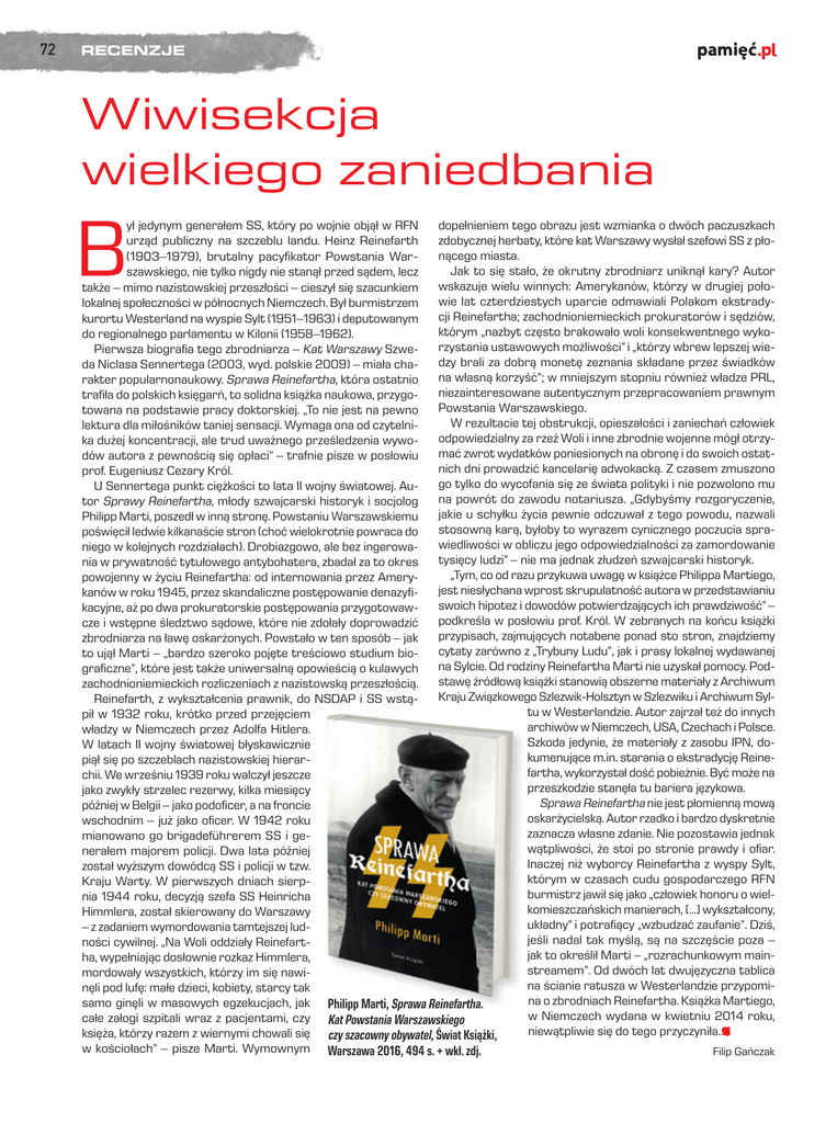 72 RECENZJE Wiwisekcja wielkiego zaniedbania B ył jedynym generałem SS, który po wojnie objął w RFN dopełnieniem tego obrazu jest wzmianka o dwóch paczuszkach zdobycznej herbaty, które kat Warszawy wysłał szefowi SS z płourząd publiczny na szczeblu landu. Heinz Reinefarth nącego miasta. (1903–1979), brutalny pacyfikator Powstania WarJak to się stało, że okrutny zbrodniarz uniknął kary? Autor szawskiego, nie tylko nigdy nie stanął przed sądem, lecz wskazuje wielu winnych: Amerykanów, którzy w drugiej połotakże – mimo nazistowskiej przeszłości – cieszył się szacunkiem wie lat czterdziestych uparcie odmawiali Polakom ekstradylokalnej społeczności w północnych Niemczech. Był burmistrzem cji Reinefartha; zachodnioniemieckich prokuratorów i sędziów, kurortu Westerland na wyspie Sylt (1951–1963) i deputowanym którym „nazbyt często brakowało woli konsekwentnego wykodo regionalnego parlamentu w Kilonii (1958–1962). rzystania ustawowych możliwości” i „którzy wbrew lepszej wiePierwsza biografia tego zbrodniarza – Kat Warszawy Szwedzy brali za dobrą monetę zeznania składane przez świadków da Niclasa Sennertega (2003, wyd. polskie 2009) – miała chana własną korzyść”; w mniejszym stopniu również władze PRL, rakter popularnonaukowy. Sprawa Reinefartha, która ostatnio niezainteresowane autentycznym przepracowaniem prawnym trafiła do polskich księgarń, to solidna książka naukowa, przygoPowstania Warszawskiego. towana na podstawie pracy doktorskiej. „To nie jest na pewno W rezultacie tej obstrukcji, opieszałości i zaniechań człowiek lektura dla miłośników taniej sensacji. Wymaga ona od czytelniodpowiedzialny za rzeź Woli i inne zbrodnie wojenne mógł otrzyka dużej koncentracji, ale trud uważnego prześledzenia wywomać zwrot wydatków poniesionych na obronę i do swoich ostatdów autora z pewnością się opłaci” – trafnie pisze w posłowiu nich dni prowadzić kancelarię adwokacką. Z czasem zmuszono prof. Eugeniusz Cezary Król. go tylko do wycofania się ze świata polityki i nie pozwolono mu U Sennertega punkt ciężkości to lata II wojny światowej. Auna powrót do zawodu notariusza. „Gdybyśmy rozgoryczenie, tor Sprawy Reinefartha, młody szwajcarski historyk i socjolog jakie u schyłku życia pewnie odczuwał z tego powodu, nazwali Philipp Marti, poszedł w inną stronę. Powstaniu Warszawskiemu stosowną karą, byłoby to wyrazem cynicznego poczucia sprapoświęcił ledwie kilkanaście stron (choć wielokrotnie powraca do wiedliwości w obliczu jego odpowiedzialności za zamordowanie niego w kolejnych rozdziałach). Drobiazgowo, ale bez ingerowatysięcy ludzi” – nie ma jednak złudzeń szwajcarski historyk. nia w prywatność tytułowego antybohatera, zbadał za to okres „Tym, co od razu przykuwa uwagę w książce Philippa Martiego, powojenny w życiu Reinefartha: od internowania przez Ameryjest niesłychana wprost skrupulatność autora w przedstawianiu kanów w roku 1945, przez skandaliczne postępowanie denazyfiswoich hipotez i dowodów potwierdzających ich prawdziwość” – kacyjne, aż po dwa prokuratorskie postępowania przygotowawpodkreśla w posłowiu prof. Król. W zebranych na końcu książki cze i wstępne śledztwo sądowe, które nie zdołały doprowadzić przypisach, zajmujących notabene ponad sto stron, znajdziemy zbrodniarza na ławę oskarżonych. Powstało w ten sposób – jak cytaty zarówno z „Trybuny Ludu”, jak i prasy lokalnej wydawanej to ujął Marti – „bardzo szeroko pojęte treściowo studium biona Sylcie. Od rodziny Reinefartha Marti nie uzyskał pomocy. Podgraficzne”, które jest także uniwersalną opowieścią o kulawych stawę źródłową książki stanowią obszerne materiały z Archiwum zachodnioniemieckich rozliczeniach z nazistowską przeszłością. Kraju Związkowego Szlezwik-Holsztyn w Szlezwiku i Archiwum SylReinefarth, z wykształcenia prawnik, do NSDAP i SS wstątu w Westerlandzie. Autor zajrzał też do innych pił w 1932 roku, krótko przed przejęciem archiwów w Niemczech, USA, Czechach i Polsce. władzy w Niemczech przez Adolfa Hitlera. Szkoda jedynie, że materiały z zasobu IPN, doW latach II wojny światowej błyskawicznie kumenujące m.in. starania o ekstradycję Reinepiął się po szczeblach nazistowskiej hierarfartha, wykorzystał dość pobieżnie. Być może na chii. We wrześniu 1939 roku walczył jeszcze przeszkodzie stanęła tu bariera językowa. jako zwykły strzelec rezerwy, kilka miesięcy Sprawa Reinefartha nie jest płomienną mową później w Belgii – jako podoficer, a na froncie oskarżycielską. Autor rzadko i bardzo dyskretnie wschodnim – już jako oficer. W 1942 roku zaznacza własne zdanie. Nie pozostawia jednak mianowano go brigadeführerem SS i gewątpliwości, że stoi po stronie prawdy i ofiar. nerałem majorem policji. Dwa lata później Inaczej niż wyborcy Reinefartha z wyspy Sylt, został wyższym dowódcą SS i policji w tzw. którym w czasach cudu gospodarczego RFN Kraju Warty. W pierwszych dniach sierpburmistrz jawił się jako „człowiek honoru o wielnia 1944 roku, decyzją szefa SS Heinricha komieszczańskich manierach, […] wykształcony, Himmlera, został skierowany do Warszawy układny” i potrafiący „wzbudzać zaufanie”. Dziś, – z zadaniem wymordowania tamtejszej ludjeśli nadal tak myślą, są na szczęście poza – ności cywilnej. „Na Woli oddziały Reinefartjak to określił Marti – „rozrachunkowym mainha, wypełniając dosłownie rozkaz Himmlera, streamem”. Od dwóch lat dwujęzyczna tablica mordowały wszystkich, którzy im się nawina ścianie ratusza w Westerlandzie przypominęli pod lufę: małe dzieci, kobiety, starcy tak na o zbrodniach Reinefartha. Książka Martiego, samo ginęli w masowych egzekucjach, jak Philipp Marti, Sprawa Reinefartha. w Niemczech wydana w kwietniu 2014 roku, całe załogi szpitali wraz z pacjentami, czy Kat Powstania Wars
