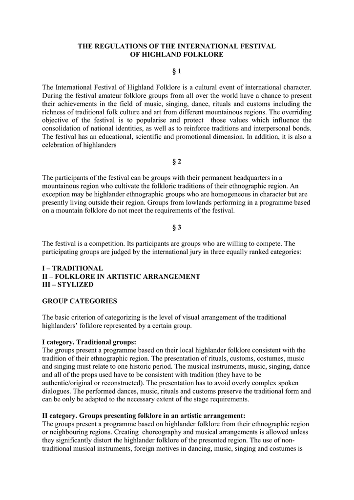 THE REGULATIONS OF THE INTERNATIONAL FESTIVAL OF HIGHLAND FOLKLORE §1 The International Festival of Highland Folklore is a cultural event of international character. During the festival amateur folklore groups from all over the world have a chance to present their achievements in the field of music, singing, dance, rituals and customs including the richness of traditional folk culture and art from different mountainous regions. The overriding objective of the festival is to popularise and protect those values which influence the consolidation of national identities, as well as to reinforce traditions and interpersonal bonds. The festival has an educational, scientific and promotional dimension. In addition, it is also a celebration of highlanders §2 The participants of the festival can be groups with their permanent headquarters in a mountainous region who cultivate the folkloric traditions of their ethnographic region. An exception may be highlander ethnographic groups who are homogeneous in character but are presently living outside their region. Groups from lowlands performing in a programme based on a mountain folklore do not meet the requirements of the festival. §3 The festival is a competition. Its participants are groups who are willing to compete. The participating groups are judged by the international jury in three equally ranked categories: I – TRADITIONAL II – FOLKLORE IN ARTISTIC ARRANGEMENT III – STYLIZED GROUP CATEGORIES The basic criterion of categorizing is the level of visual arrangement of the traditional highlanders’ folklore represented by a certain group. I category. Traditional groups: The groups present a programme based on their local highlander folklore consistent with the tradition of their ethnographic region. The presentation of rituals, customs, costumes, music and singing must relate to one historic period. The musical instruments, music, singing, dance and all of the props used have to be consistent with tradition (they have to be authentic/original or reconstructed). The presentation has to avoid overly complex spoken dialogues. The performed dances, music, rituals and customs preserve the traditional form and can be only be adapted to the necessary extent of the stage requirements. II category. Groups presenting folklore in an artistic arrangement: The groups present a programme based on highlander folklore from their ethnographic region or neighbouring regions. Creating choreography and musical arrangements is allowed unless they significantly distort the highlander folklore of the presented region. The use of nontraditional musical instruments, foreign motives in dancing, music, singing and costumes is not permitted. III. category. Groups presenting a stylized folklore. The groups present a programme based on the folklore of the mountainous regions of their own ethnic groups or nations. The presented programme must be a creative, original interpretation in which every single aspect of the presentation is inspired by traditional highlander folklore. These aspects are dance, music, singing and costumes. The use of mechanical music is not permitted. §4 4.1 The following groups are excluded from participation in the festival’s competition: - groups from non-mountainous regions - professional groups, namely, groups whose members receive fee for their work in the group. This restriction does not include instructors and management. - children groups under 16 years - groups using mechanical music (playback) The participation of children in the 3rd category regarding stylized folklore presentations is not permitted. 4.2. Groups use only microphones provided by the organizers. Use of headset microphones (microports) is allowed in all the categories. §5 The groups participating in the Festival are judged by an International Jury. The chairman presides over the jury sessions. Both the members of the jury and its chairman are appointed by the Festival’s organizer each year. §6 Every group participating in the competition is obliged to specify in the participation form the category in which they are going to perform. Should the programme presented by the group not correspond with the chosen category in terms of its character, the jury has right to move the group to another category while judging. Substantiation of such a decision must be put in the final report. §7 The organizers envisage to hold consultation meetings between the Jury members and the group representatives immediately after presentation of competition programme. §8 Groups are obliged to submit a detailed scenario of the competition presentation to the organizers no later than 15th July this year (foreign groups) or no later than 10th August this year (Polish groups). Compliance with this requirement determines the admission of a group to the competition. §9 The total time of the competition performance can be no shorter than 25 minutes and no longer than 30 minutes. A group should have and an additional programme prepared (outside of the competition) for 1-2 minutes, 5-7 minutes and 20-30 minutes. The total number of persons taking part in the competition programme must not be more than 35 and less than 20. The total number of group members including accompanying persons and drivers must not exceed 40 persons. The rules regarding the performance time and the total of the participants also apply to the guest groups and groups performing outside of the competition. For exceeding the time and/or personal limits 5 points are subtracted from the general score. Criteria of the competition performance: 1. The choice of repertoire. The ethnographic value of the programme. a) Verity in the presentation of traditional rituals and customs – category I b) The artistic value of folklore developed in an arrangement – category II c) The artistic value of the stylization of a performance – category III 2. Clothing, costumes, props. 3. The composition of the instrumental ensemble and the t