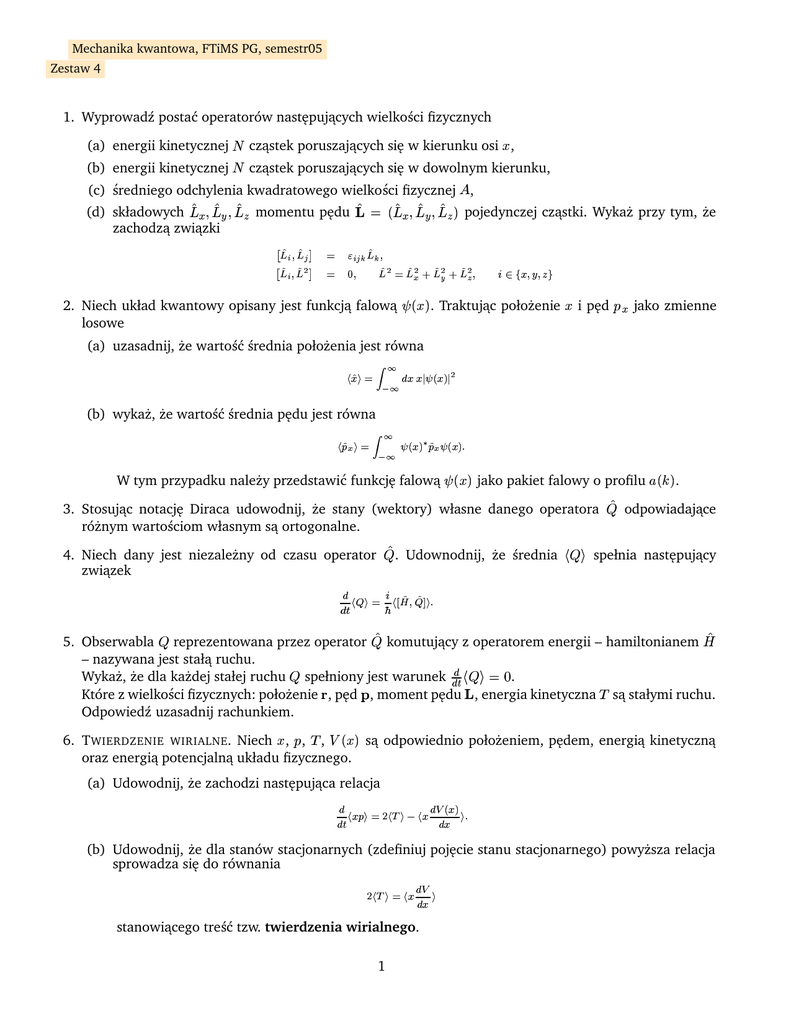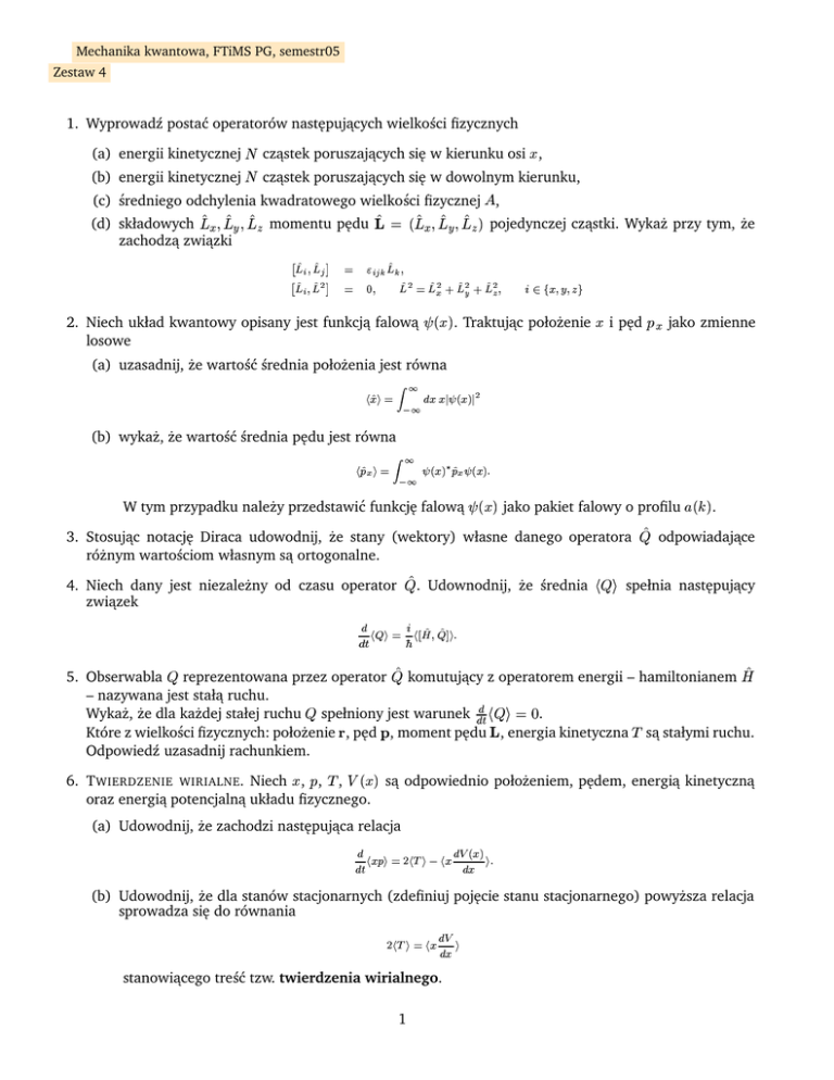 7. T WIERDZENIE E HRENFESTA . Udowodnij, że prawdziwa jest postać kwantowo–mechanicznych równań