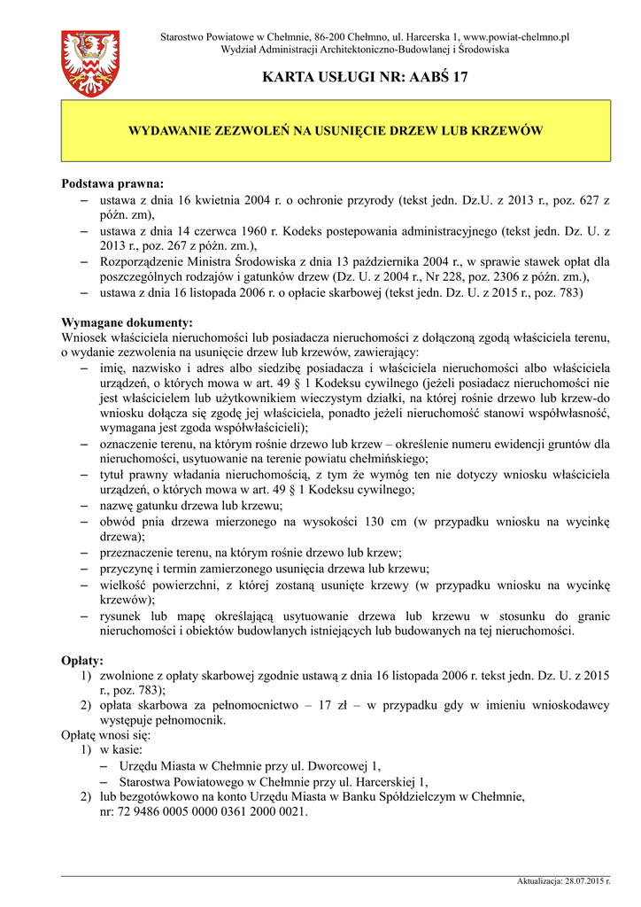 Starostwo Powiatowe w Chełmnie, 86-200 Chełmno, ul. Harcerska 1, www.powiat-chelmno.pl Wydział Administracji Architektoniczno-Budowlanej i Środowiska KARTA USŁUGI NR: AABŚ 17 WYDAWANIE ZEZWOLEŃ NA USUNIĘCIE DRZEW LUB KRZEWÓW Podstawa prawna: – ustawa z dnia 16 kwietnia 2004 r. o ochronie przyrody (tekst jedn. Dz.U. z 2013 r., poz. 627 z późn. zm), – ustawa z dnia 14 czerwca 1960 r. Kodeks postepowania administracyjnego (tekst jedn. Dz. U. z 2013 r., poz. 267 z późn. zm.), – Rozporządzenie Ministra Środowiska z dnia 13 października 2004 r., w sprawie stawek opłat dla poszczególnych rodzajów i gatunków drzew (Dz. U. z 2004 r., Nr 228, poz. 2306 z późn. zm.), – ustawa z dnia 16 listopada 2006 r. o opłacie skarbowej (tekst jedn. Dz. U. z 2015 r., poz. 783) Wymagane dokumenty: Wniosek właściciela nieruchomości lub posiadacza nieruchomości z dołączoną zgodą właściciela terenu, o wydanie zezwolenia na usunięcie drzew lub krzewów, zawierający: – imię, nazwisko i adres albo siedzibę posiadacza i właściciela nieruchomości albo właściciela urządzeń, o których mowa w art. 49 § 1 Kodeksu cywilnego (jeżeli posiadacz nieruchomości nie jest właścicielem lub użytkownikiem wieczystym działki, na której rośnie drzewo lub krzew-do wniosku dołącza się zgodę jej właściciela, ponadto jeżeli nieruchomość stanowi współwłasność, wymagana jest zgoda współwłaścicieli); – oznaczenie terenu, na którym rośnie drzewo lub krzew – określenie numeru ewidencji gruntów dla nieruchomości, usytuowanie na terenie powiatu chełmińskiego; – tytuł prawny władania nieruchomością, z tym że wymóg ten nie dotyczy wniosku właściciela urządzeń, o których mowa w art. 49 § 1 Kodeksu cywilnego; – nazwę gatunku drzewa lub krzewu; – obwód pnia drzewa mierzonego na wysokości 130 cm (w przypadku wniosku na wycinkę drzewa); – przeznaczenie terenu, na którym rośnie drzewo lub krzew; – przyczynę i termin zamierzonego usunięcia drzewa lub krzewu; – wielkość powierzchni, z której zostaną usunięte krzewy (w przypadku wniosku na wycinkę krzewów); – rysunek lub mapę określającą usytuowanie drzewa lub krzewu w stosunku do granic nieruchomości i obiektów budowlanych istniejących lub budowanych na tej nieruchomości. Opłaty: 1) zwolnione z opłaty skarbowej zgodnie ustawą z dnia 16 listopada 2006 r. tekst jedn. Dz. U. z 2015 r., poz. 783); 2) opłata skarbowa za pełnomocnictwo – 17 zł – w przypadku gdy w imieniu wnioskodawcy występuje pełnomocnik. Opłatę wnosi się: 1) w kasie: – Urzędu Miasta w Chełmnie przy ul. Dworcowej 1, – Starostwa Powiatowego w Chełmnie przy ul. Harcerskiej 1, 2) lub bezgotówkowo na konto Urzędu Miasta w Banku Spółdzielczym w Chełmnie, nr: 72 9486 0005 0000 0361 2000 0021. Aktualizacja: 28.07.2015 r. Forma załatwienia sprawy: Zezwolenie lub odmowa wydania zezwolenia (w formie decyzji administracyjnej) na usuniecie drzew lub krzewów. Termin załatwienia sprawy: W ciągu miesiąca, a w sprawie szczególnie skomplikowanej w ciągu dwóch miesięcy od daty złożenia kompletnego wniosku. Do w/w terminów nie wlicza się terminów przewidzianych w przepisach prawa do dokonania określonych czynności np. uzyskania opinii i uzgodnień innych organów. Jednostka odpowiedzialna za załatwienie sprawy: – nazwa wydziału: Wydział Administracji Architektoniczno-Budowlanej i Środowiska. – adres: ul. Harcerska 1, pokój nr 21. – nr telefonu: 56 677 24 20. – godziny pracy: poniedziałek, środa, czwartek: 7:30-15:30, wtorek: 7:30-16:30, piątek 7:30-14:30. Tryb odwoławczy: Odwołanie do Samorządowego Kolegium Odwoławczego w Toruniu, za pośrednictwem Starosty Chełmińskiego, w terminie 14 dni od dnia otrzymania decyzji. Wniesienie odwołania w terminie wstrzymuje wykonanie decyzji. Inne informacje: 1) wniosek można złożyć osobiście lub przez pełnomocnika w siedzibie Starostwa Powiatowego w Chełmnie lub pocztą; 2) w przypadku stwierdzenia braku kompletu dokumentów, wnioskodawca zostanie wezwany do uzupełnienia wniosku w terminie 7 dni od otrzymania wezwania. Nieuzupełnienie braków we wskazanym terminie będzie skutkowało pozostawieniem sprawy bez rozpoznania; 3) zezwolenie na usunięcie drzew lub krzewów z terenu nieruchomości wpisanej do rejestru zabytków wydaje Wojewódzki konserwator Zabytków (art. 83 ust. 2 ustawy o ochronie przyrody); 4) zezwolenie na usunięcie drzew rosnących w obrębie pasa drogowego drogi publicznej, z wyłączeniem obcych gatunków topoli, wydaje się po uzgodnieniu z Regionalnym Dyrektorem Ochrony Środowiska (art. 83 ust. 2a ustawy o ochronie przyrody). Sporządził: Sprawdził: Zatwierdził: Aktualizacja: 28.07.2015 r.