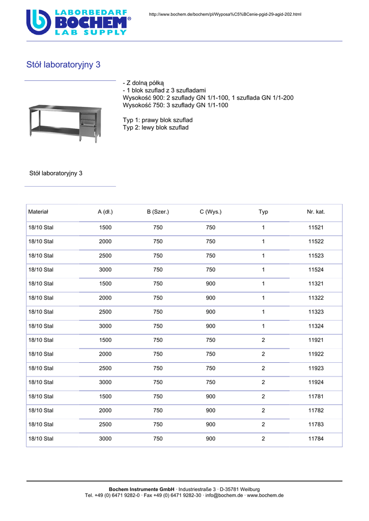 http://www.bochem.de/bochem/pl/Wyposa%C5%BCenie-pgid-29-agid-202.html Stół�laboratoryjny�3 -�Z�dolną�półką -�1�blok�szuflad�z�3�szufladami Wysokość�900:�2�szuflady�GN�1/1-100,�1�szuflada�GN�1/1-200 Wysokość�750:�3�szuflady�GN�1/1-100 Typ�1:�prawy�blok�szuflad Typ�2:�lewy�blok�szuflad Stół�laboratoryjny�3 Materiał A�(dł.) B�(Szer.) C�(Wys.) Typ Nr.�kat. 18/10�Stal 1500 750 750 1 11521 18/10�Stal 2000 750 750 1 11522 18/10�Stal 2500 750 750 1 11523 18/10�Stal 3000 750 750 1 11524 18/10�Stal 1500 750 900 1 11321 18/10�Stal 2000 750 900 1 11322 18/10�Stal 2500 750 900 1 11323 18/10�Stal 3000 750 900 1 11324 18/10�Stal 1500 750 750 2 11921 18/10�Stal 2000 750 750 2 11922 18/10�Stal 2500 750 750 2 11923 18/10�Stal 3000 750 750 2 11924 18/10�Stal 1500 750 900 2 11781 18/10�Stal 2000 750 900 2 11782 18/10�Stal 2500 750 900 2 11783 18/10�Stal 3000 750 900 2 11784 Bochem Instrumente GmbH · Industriestraße 3 · D-35781 Weilburg Tel. +49 (0) 6471 9282-0 · Fax +49 (0) 6471 9282-30 · [email protected] · www.bochem.de