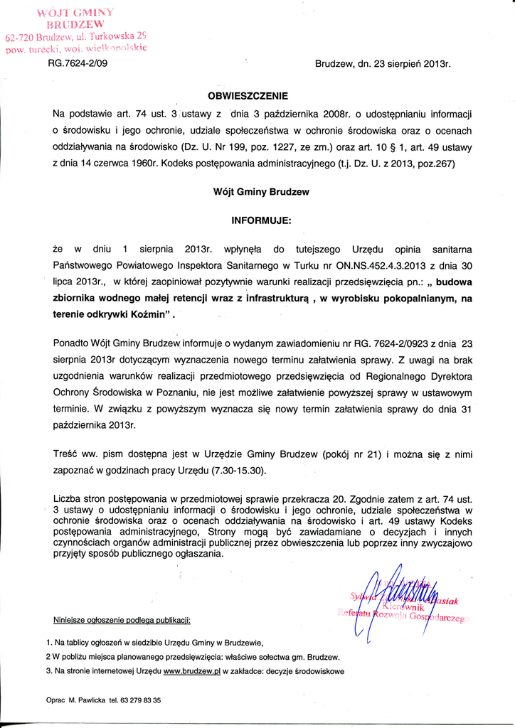 WOJT GMINY BRUDZEW 62-720 Brudzew, u!. Turkowska 29 pow. turecki, w o i . \vieU'-~innkkie RG.7624-2/09 Brudzew, dn. 23 sierpieh 2013r. OBWIESZCZENIE Na podstawie art. 74 ust. 3 ustawy z dnia 3 pazdziernika 2008r. o udost^pnianiu informacji 0 srodowisku i jego ochronie, udziale spoteczehstwa w ociironie srodowiska oraz o ocenacti oddziafywania na srodowisko (Dz. U. Nr 199, poz. 1227, ze zm.) oraz art. 10 § 1, art. 49 ustawy z dnia 14 czerwca 1960r. Kodeks post^powania administracyjnego (t.j. Dz. U. z 2013, poz.267) Wojt G m i n y Brudzew INFORMUJE: ze w dniu 1 sierpnia 2013r. wplyn^te do tutejszego Urz^du opinia sanitarna Panstwowego Powiatowego Inspektora Sanitarnego w Turku nr ON.NS.452.4.3.2013 z dnia 30 lipca 2013r., w ktorej zaopiniowal pozytywnie warunki realizacjl przedsiQwzi^cia pn.: „ b u d o w a zbiornika w o d n e g o matej retenoji wraz z infrastruktura , w w y r o b i s k u p o k o p a l n i a n y m , na terenie odkrywki K o z m i n " . Ponadto Wojt Gminy Brudzew informuje o wydanym zawiadomieniu nr RG. 7624-2/0923 z dnia 23 sierpnia 2013r dotyczqcym wyznaczenia nowego terminu zatatwienia sprawy. Z uwagi na brak uzgodnienia warunkow realizacjl przedmiotowego przedsi?wzi?cia od Regionalnego Dyrektora Ochrony Srodowiska w Poznaniu, nie jest mozliwe zatatwienie powyzszej sprawy w ustawowym terminie. W zwiqzku z powyzszym wyznacza si? nowy termin zatatwienia sprawy do dnia 31 pazdziernika 2013r. Tresc ww. pism dostepna jest w Urz^dzie Gminy Brudzew (pokoj nr 21) i mozna si? z nimi zapoznac w godzinach pracy Urz§du (7.30-15.30). Liczba stron post^powania w przedmiotowej sprawie przekracza 20. Zgodnie zatem z art. 74 ust. 3 ustawy o udost^pnianiu informacji o srodowisku 1 jego ochronie, udziale spoteczenstwa w ochronie srodowiska oraz o ocenach oddziafywania na srodowisko 1 art. 49 ustawy Kodeks post?powania administracyjnego, Strony m o g ^ bye zawiadamiane o decyzjach i innych czynnosciach organow administracji publicznej przez obwieszczenia lub poprzez inny zwyczajowo przyj?ty sposob publicznego og+aszania. Ninielsze oqtoszenie podleqa publikacii: 1. Na tablicy ogtoszeri w siedzibie Urz^du Gminy w Brudzewie, 2 W poblizu miejsca planowanego przedsi^wzi^cia: wtesciwe sofectwa gm. Brudzew. 3. Na stronie internetowej Urzedu www.brudzew.pl w zaktadce: decyzje srodowiskowe Oprac M. Pawlicka tel. 63 279 83 35