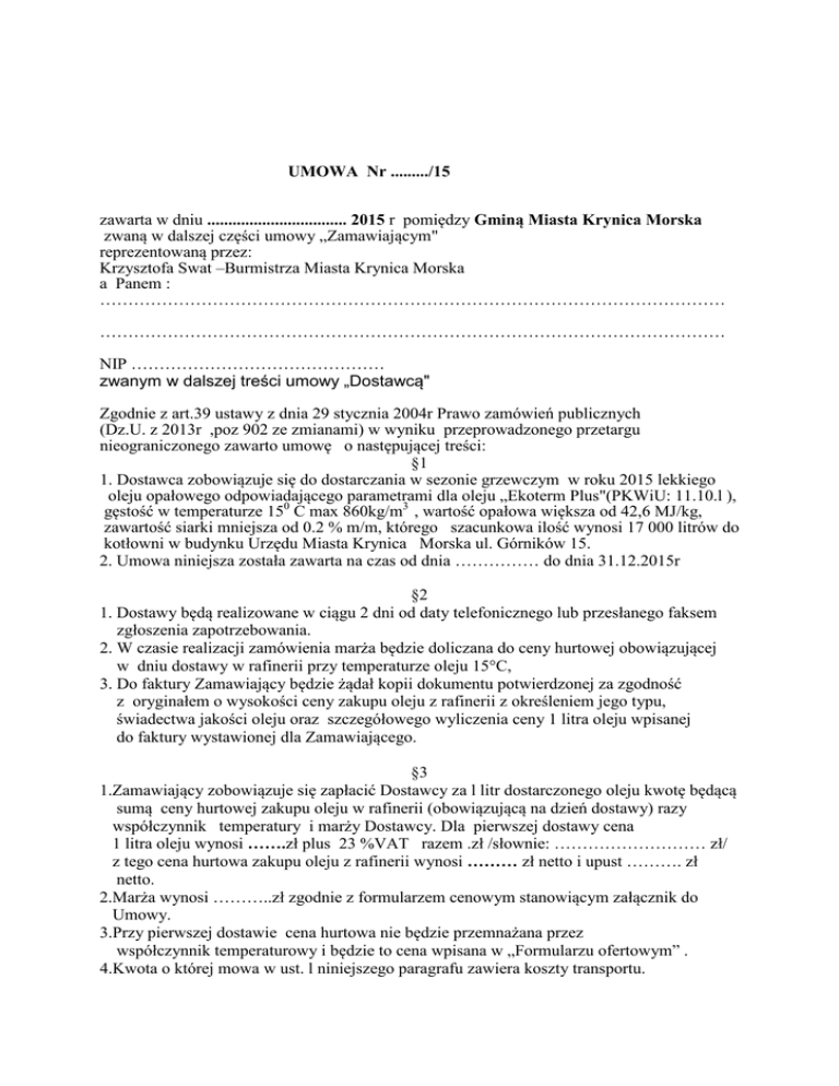 UMOWA Nr ........./15 zawarta w dniu ................................. 2015 r pomiędzy Gminą Miasta Krynica Morska zwaną w dalszej części umowy „Zamawiającym" reprezentowaną przez: Krzysztofa Swat –Burmistrza Miasta Krynica Morska a Panem : ………………………………………………………………………………………………… ………………………………………………………………………………………………… NIP ……………………………………… zwanym w dalszej treści umowy „Dostawcą" Zgodnie z art.39 ustawy z dnia 29 stycznia 2004r Prawo zamówień publicznych (Dz.U. z 2013r ,poz 902 ze zmianami) w wyniku przeprowadzonego przetargu nieograniczonego zawarto umowę o następującej treści: §1 1. Dostawca zobowiązuje się do dostarczania w sezonie grzewczym w roku 2015 lekkiego oleju opałowego odpowiadającego parametrami dla oleju „Ekoterm Plus"(PKWiU: 11.10.l ), gęstość w temperaturze 150 C max 860kg/m3 , wartość opałowa większa od 42,6 MJ/kg, zawartość siarki mniejsza od 0.2 % m/m, którego szacunkowa ilość wynosi 17 000 litrów do kotłowni w budynku Urzędu Miasta Krynica Morska ul. Górników 15. 2. Umowa niniejsza została zawarta na czas od dnia …………… do dnia 31.12.2015r §2 1. Dostawy będą realizowane w ciągu 2 dni od daty telefonicznego lub przesłanego faksem zgłoszenia zapotrzebowania. 2. W czasie realizacji zamówienia marża będzie doliczana do ceny hurtowej obowiązującej w dniu dostawy w rafinerii przy temperaturze oleju 15°C, 3. Do faktury Zamawiający będzie żądał kopii dokumentu potwierdzonej za zgodność z oryginałem o wysokości ceny zakupu oleju z rafinerii z określeniem jego typu, świadectwa jakości oleju oraz szczegółowego wyliczenia ceny 1 litra oleju wpisanej do faktury wystawionej dla Zamawiającego. §3 1.Zamawiający zobowiązuje się zapłacić Dostawcy za l litr dostarczonego oleju kwotę będącą sumą ceny hurtowej zakupu oleju w rafinerii (obowiązującą na dzień dostawy) razy współczynnik temperatury i marży Dostawcy. Dla pierwszej dostawy cena 1 litra oleju wynosi …….zł plus 23 %VAT razem .zł /słownie: ……………………… zł/ z tego cena hurtowa zakupu oleju z rafinerii wynosi ……… zł netto i upust ………. zł netto. 2.Marża wynosi ………..zł zgodnie z formularzem cenowym stanowiącym załącznik do Umowy. 3.Przy pierwszej dostawie cena hurtowa nie będzie przemnażana przez współczynnik temperaturowy i będzie to cena wpisana w „Formularzu ofertowym” . 4.Kwota o której mowa w ust. l niniejszego paragrafu zawiera koszty transportu. 5. Marża, czyli różnica miedzy ceną hurtową, a ceną dostawy dla Zamawiającego, w której Dostawca zawiera koszty transportu, zysk, itp, wyrażona w złotych nie może ulec zmianie w ciągu całego okresu realizacji zamówienia. 6. Zapłata nastąpi przelewem na konto Dostawcy wskazane na fakturze w terminie 21 dni od daty otrzymania przez Zamawiającego prawidłowo wystawionej faktury wraz z kompletem dokumentów o których mowa w §2 ust. 3. §4 1.Strony ustalają odpowiedzialność za nie wykonanie lub nienależyte wykonanie zobowiązań w formie kar umownych w następujących wypadkach i wysokościach : 1) Dostawca zapłaci Zamawiającemu karę umowną za nie wykonanie lub nienależyte wykonanie zobowiązania określonego w umowie w wysokości 0,4% wartości niezrealizowanego przedmiotu umowy za każdy dzień opóźnienia w przypadku: a/ nie dotrzymania terminu dostawy przedmiotu umowy, b/nie dotrzymania właściwej jakości przedmiotu umowy, c/ nie dostarczenia aktualnego i właściwego świadectwa jakości przedmiotu zamówienia na żądanie Zamawiającego. 2) Dostawca zapłaci Zamawiającemu karę umowną z tytułu odstąpienia od umowy z przyczyn zależnych od Dostawcy w wysokości 10 % wartości brutto nie wykonanej części przedmiotu umowy. 2. W przypadku niewykonania lub nienależytego wykonania umowy Dostawca wyraża zgodę na potrącenie w rozumieniu art. 498 i 499 kodeksu cywilnego powstałej należności poprzez naliczenie kar umownych, o których mowa w ust. 1 3. W przypadku zaistnienia sytuacji, o której mowa w ust. 2. Zamawiający wystawi w terminie 21 dni od dnia dokonania potrącenia notę zawierającą szczegółowe naliczenie kary umownej. 4. Zamawiający zastrzega sobie prawo dochodzenia odszkodowania za wyrządzoną mu przez Dostawcę szkodę niezależnie od określonych w ust. 1 kar umownych. §5 W sprawach nie uregulowanych postanowieniami umowy będą miały zastosowanie przepisy Kodeksu cywilnego i ustawy Prawo zamówień publicznych. §6 Spory wynikłe na tle niniejszej umowy rozpatrywać będzie Sąd właściwy miejscowo dla Zamawiającego §7 Umowę sporządzono w dwóch jednobrzmiących egzemplarzach po jednym dla każdej ze stron. ZAMAWIAJĄCY DOSTAWCA