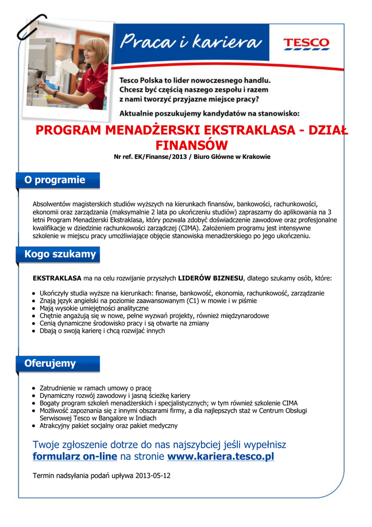 PROGRAM MENADŻERSKI EKSTRAKLASA DZIAŁ FINANSÓW Nr ref. EK/Finanse/2013 / Biuro Główne w Krakowie O programie Absolwentów magisterskich studiów wyższych na kierunkach finansów, bankowości, rachunkowości, ekonomii oraz zarządzania (maksymalnie 2 lata po ukończeniu studiów) zapraszamy do aplikowania na 3 letni Program Menadżerski Ekstraklasa, który pozwala zdobyć doświadczenie zawodowe oraz profesjonalne kwalifikacje w dziedzinie rachunkowości zarządczej (CIMA). Założeniem programu jest intensywne szkolenie w miejscu pracy umożliwiające objęcie stanowiska menadżerskiego po jego ukończeniu. Kogo szukamy EKSTRAKLASA ma na celu rozwijanie przyszłych LIDERÓW BIZNESU, dlatego szukamy osób, które: Ukończyły studia wyższe na kierunkach: finanse, bankowość, ekonomia, rachunkowość, zarządzanie Znają język angielski na poziomie zaawansowanym (C1) w mowie i w piśmie Mają wysokie umiejętności analityczne Chętnie angażują się w nowe, pełne wyzwań projekty, również międzynarodowe Cenią dynamiczne środowisko pracy i są otwarte na zmiany Dbają o swoją karierę i chcą rozwijać innych Oferujemy Zatrudnienie w ramach umowy o pracę Dynamiczny rozwój zawodowy i jasną ścieżkę kariery Bogaty program szkoleń menadżerskich i specjalistycznych; w tym również szkolenie CIMA Możliwość zapoznania się z innymi obszarami firmy, a dla najlepszych staż w Centrum Obsługi Serwisowej Tesco w Bangalore w Indiach Atrakcyjny pakiet socjalny oraz pakiet medyczny Twoje zgłoszenie dotrze do nas najszybciej jeśli wypełnisz formularz on-line na stronie www.kariera.tesco.pl Termin nadsyłania podań upływa 20130512
