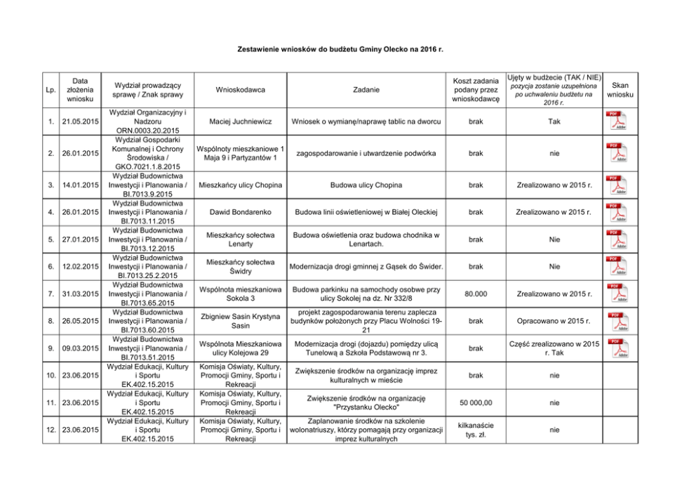 Zestawienie wniosków do budżetu Gminy Olecko na 2016 r. Lp. Data złożenia wniosku 1. 21.05.2015 2. 26.01.2015 3. 14.01.2015 4. 26.01.2015 5. 27.01.2015 6. 12.02.2015 7. 31.03.2015 8. 26.05.2015 9. 09.03.2015 10. 23.06.2015 11. 23.06.2015 12. 23.06.2015 Wydział prowadzący sprawę / Znak sprawy Wydział Organizacyjny i Nadzoru ORN.0003.20.2015 Wydział Gospodarki Komunalnej i Ochrony Środowiska / GKO.7021.1.8.2015 Wydział Budownictwa Inwestycji i Planowania / BI.7013.9.2015 Wydział Budownictwa Inwestycji i Planowania / BI.7013.11.2015 Wydział Budownictwa Inwestycji i Planowania / BI.7013.12.2015 Wydział Budownictwa Inwestycji i Planowania / BI.7013.25.2.2015 Wydział Budownictwa Inwestycji i Planowania / BI.7013.65.2015 Wydział Budownictwa Inwestycji i Planowania / BI.7013.60.2015 Wydział Budownictwa Inwestycji i Planowania / BI.7013.51.2015 Wydział Edukacji, Kultury i Sportu EK.402.15.2015 Wydział Edukacji, Kultury i Sportu EK.402.15.2015 Wydział Edukacji, Kultury i Sportu EK.402.15.2015 Ujęty w budżecie (TAK / NIE) Wnioskodawca Zadanie Koszt zadania podany przez wnioskodawcę Maciej Juchniewicz Wniosek o wymianę/naprawę tablic na dworcu brak Tak Wspólnoty mieszkaniowe 1 Maja 9 i Partyzantów 1 zagospodarowanie i utwardzenie podwórka brak nie Mieszkańcy ulicy Chopina Budowa ulicy Chopina brak Zrealizowano w 2015 r. Dawid Bondarenko Budowa linii oświetleniowej w Białej Oleckiej brak Zrealizowano w 2015 r. Mieszkańcy sołectwa Lenarty Budowa oświetlenia oraz budowa chodnika w Lenartach. brak Nie Mieszkańcy sołectwa Świdry Modernizacja drogi gminnej z Gąsek do Świder. brak Nie Wspólnota mieszkaniowa Sokola 3 Budowa parkinku na samochody osobwe przy ulicy Sokolej na dz. Nr 332/8 80.000 Zrealizowano w 2015 r. Zbigniew Sasin Krystyna Sasin projekt zagospodarowania terenu zaplecza budynków położonych przy Placu Wolności 1921 brak Opracowano w 2015 r. Wspólnota Mieszkaniowa ulicy Kolejowa 29 Modernizacja drogi (dojazdu) pomiędzy ulicą Tunelową a Szkoła Podstawową nr 3. brak Część zrealizowano w 2015 r. Tak Zwiększenie środków na organizację imprez kulturalnych w mieście brak nie Zwiększenie środków na organizację "Przystanku Olecko" 50 000,00 nie Zaplanowanie środków na szkolenie wolonatriuszy, którzy pomagają przy organizacji imprez kulturalnych kilkanaście tys. zł. nie Komisja Oświaty, Kultury, Promocji Gminy, Sportu i Rekreacji Komisja Oświaty, Kultury, Promocji Gminy, Sportu i Rekreacji Komisja Oświaty, Kultury, Promocji Gminy, Sportu i Rekreacji pozycja zostanie uzupełniona po uchwaleniu budżetu na 2016 r. Skan wniosku 13a. 23.06.2015 13b. 15.09.2015 14. 23.06.2015 15. 23.06.2015 16. 23.06.2015 17. 23.06.2015 18. 17.06.2015 19. 12.05.2015 20. 19.12.2014 21. 19.12.2014 22. 30.01.2015 23. lut-15 24. lut-15 Komisja Oświaty, Kultury, Zwiększenie budżetu ośrodka kultury na Promocji Gminy, Sportu i Przegląd Kapel organizowany przez Olecką Wydział Edukacji, Kultury Rekreacji Radę Młodzieżową i Sportu Fundacja Akademia EK.402.15.2015 Radosnej Twórczości II Przegląd Zespołów Amatorskich LegaFest Olecka Rada Młodzieżowa Komisja Oświaty, Kultury, Wyremontowanie budynku AGT oraz holu kina i Regionalny Ośrodek Kultury Promocji Gminy, Sportu i toalet Rekreacji Zamontowanie klimatyzatorów w salach Komisja Oświaty, Kultury, tanecznych Regionalny Ośrodek Kultury Promocji Gminy, Sportu i i salach przeznaczonych do innej aktywności Rekreacji fizycznej Zaplanowanie dodatkowych środków w Komisja Oświaty, Kultury, budżecie ośrodka kultury na regranting na wzór Regionalny Ośrodek Kultury Promocji Gminy, Sportu i programu mikrodotacji prowadzonego 2 lata Rekreacji temu przez ośrodek, dofinansowanego z Narodowego Centrum Kultury Komisja Oświaty, Kultury, Zaplanowanie środków na podwyżki płac Regionalny Ośrodek Kultury Promocji Gminy, Sportu i pracowników ośrodka kultury Rekreacji Wydział Edukacji, Kultury i Sportu EK.434.6.2015 Wydział Budownictwa Inwestycji i Planowania / BI.7013.96.2015 Wydział Budownictwa Inwestycji i Planowania / BI.0003.2.2015 Wydział Budownictwa Inwestycji i Planowania / BI.0003.3.2015 Wydział Budownictwa Inwestycji i Planowania / BI.0003.7.2015 Wydział Budownictwa Inwestycji i Planowania Wydział Budownictwa Inwestycji i Planowania - brak nie 26 100,00 nie brak tak (wkład własny do projektu) brak nie 20 000 - 30 000 nie brak nie Komisja Oświaty, Kultury, Promocji Gminy, Sportu i Rekreacji i Komisja Polityki Prorodzinnej, Ochrony Zdrowia i Bezpieczeństwa Utworzenie Oleckiej Szkoły Ratowników brak nie Wspólnoty Mieszkaniowe ul. Kolejowa 20,22,24,26,28,30 Zagospodarowanie terenu podwórka przy ul. Kolejowa od nr 20 do nr 30. brak Nie Justyna Cieślukowska Budowa małej siłowni plenerowej na Osiedlu Siejnik. brak Tak Pawel Giełazis Budowa placu zabaw na Osiedlu Siejnikj I i II oraz na Osiedlu Lesk. brak Nie Karol Sobczak Budowa latarni na nowym cmentarzu w Olecku. brak Nie Sołectwo Borawskie Rozbudowa świetlicy wiejskiej w Borawskich brak Nie Sołectwo Dobki Wykonanie nawierzchni asfaltowej na drodze gminnej Dobki-Rosochackie. brak Nie 25. 22.04.2015 26. 28.04.2015 27. 24.04.2015 28. 29.05.2015 29. 03.06.2015 30. 20.07.2015 31. 12.07.2015 32. 02.09.2015 33. 02.09.2015 Wydział Budownictwa Inwestycji i Planowania BI.0003.20.2015 Wydzial Budownictwa Inwestycji i Planowania Wydział Budownictwa Inwestycji i Planowania Wydział Budownictwa Inwestycji i Planowania Wydział Budownictwa Inwestycji i Planowania / BI.7013.106.2015 Wydział Budownictwa Inwestycji i Planowania Wydział Gospodarki Komunalnej i Ochrony Środowiska / GKO.7021.1.55.2015 Wydział Budownictwa Inwestycji i Planownia /BI 7013.121.6.2015 Wydział Budownictwa Inwestycji i Planownia /BI 7013.121.5.2015 Wydział Budownictwa 34. 21.08.2015 Inwestycji i Planowania /BI 7013.121.4.2015 35. 19.08.2015 36. 17.08.2015 37. 11.08.2015 Wydział Budownictwa Inwestycji i Planowania /BI.7013.121.3.2015 Wydział Budownictwa Inwe