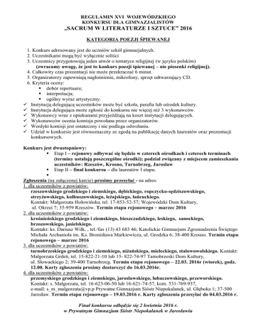 REGULAMIN XVI WOJEWÓDZKIEGO KONKURSU DLA GIMNAZJALISTÓW „SACRUM W LITERATURZE I SZTUCE” 2016 KATEGORIA POEZJI ŚPIEWANEJ 1. Konkurs adresowany jest do uczniów szkół gimnazjalnych. 2. Uczestnikami mogą być wyłącznie soliści 3. Uczestnicy przygotowują jeden utwór o tematyce religijnej (w języku polskim) (zwracamy uwagę, że jest to konkurs poezji śpiewanej – nie piosenki religijnej). 4. Całkowity czas prezentacji nie może przekraczać 6 minut. 5. Organizatorzy zapewniają nagłośnienie, mikrofony, sprzęt odtwarzający CD. 6. Kryteria oceny: dobór repertuaru; interpretacja; ogólny wyraz artystyczny. Instytucją delegującą uczestników może być szkoła, parafia lub ośrodek kultury. Instytucja delegująca może zgłosić do konkursu nie więcej niż 3 wykonawców. Wykonawcy wraz z opiekunami przyjeżdżają na koszt instytucji delegujących. Wykonawców ocenia komisja powołana przez organizatorów. Werdykt komisji jest ostateczny i nie podlega odwołaniu. Udział w konkursie jest równoznaczny ze zgodą na publikację danych laureatów oraz prezentacji konkursowych. Konkurs jest dwustopniowy: Etap I – rejonowy odbywać się będzie w czterech ośrodkach i czterech terminach (terminy ustalają poszczególne ośrodki); podział związany z miejscem zamieszkania uczestników: Rzeszów, Krosno, Tarnobrzeg, Jarosław Etap II – finał konkursu – dla laureatów I etapu. Zgłoszenia (na załączonej karcie) prosimy przesyłać - na adres: 1. dla uczestników z powiatów: rzeszowskiego grodzkiego i ziemskiego, dębickiego, ropczycko-sędziszowskiego, strzyżowskiego, kolbuszowskiego, leżajskiego, łańcuckiego. Kontakt: Małgorzata Hołowińska, tel. 17-853-52-57; Wojewódzki Dom Kultury, ul. Okrzei 7; 35-959 Rzeszów. Termin etapu rejonowego – marzec 2016 2. dla uczestników z powiatów: krośnieńskiego grodzkiego i ziemskiego, bieszczadzkiego, leskiego, sanockiego, brzozowskiego, jasielskiego. Kontakt: ks. Dariusz Wilk, , tel./fax (13) 43 683 46; Katolickie Gimnazjum Zgromadzenia Świętego Michała Archanioła im. Ks. Bronisława Markiewicza, ul. Grodzka 6; 38-400 Krosno. Termin etapu rejonowego – marzec 2016 3. dla uczestników z powiatów: tarnobrzeskiego grodzkiego i ziemskiego, niżańskiego, mieleckiego, stalowowolskiego. Kontakt: Małgorzata Grdeń, tel. 15-822-21-10 lub 15- 822-74-97 Tarnobrzeski Dom Kultury, ul. Słowackiego 2; 39-400 Tarnobrzeg. Termin etapu rejonowego – 22.03. 2016r (wtorek), godz. 12.00. Karty zgłoszenia prosimy dostarczyć do 16.03.2016r. 4. dla uczestników z powiatów: przemyskiego grodzkiego i ziemskiego, jarosławskiego, lubaczowskiego, przeworskiego. Kontakt: s. Małgorzata, tel. 16-623-06-50 lub 16-621-74-57, kom. 531-769-937, e-mail: [email protected] Prywatne Gimnazjum Sióstr Niepokalanek, ul. Głęboka 1; 37-500 Jarosław. Termin etapu rejonowego – 19.03.2016 r. Karty zgłoszenia przesyłać do 04.03.2016 r. Finał konkursu odbędzie się 2 kwietnia 2016 r. w Prywatnym Gimnazjum Sióstr Niepokalanek w Jarosławiu