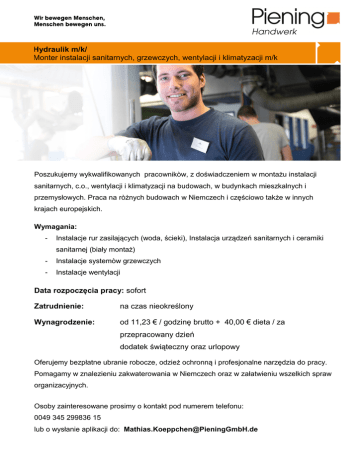 Hydraulik m/k/ Monter instalacji sanitarnych, grzewczych, wentylacji i klimatyzacji m/k Poszukujemy wykwalifikowanych pracownikòw, z doświadczeniem w montażu instalacji sanitarnych, c.o., wentylacji i klimatyzacji na budowach, w budynkach mieszkalnych i przemysłowych. Praca na ròżnych budowach w Niemczech i częściowo także w innych krajach europejskich. Wymagania: - Instalacje rur zasilających (woda, ścieki), Instalacja urządzeń sanitarnych i ceramiki sanitarnej (biały montaż) - Instalacje systemòw grzewczych - Instalacje wentylacji Data rozpoczęcia pracy: sofort Zatrudnienie: na czas nieokreślony Wynagrodzenie: od 11,23 € / godzinę brutto + 40,00 € dieta / za przepracowany dzień dodatek świąteczny oraz urlopowy Oferujemy bezpłatne ubranie robocze, odzież ochronną i profesjonalne narzędzia do pracy. Pomagamy w znalezieniu zakwaterowania w Niemczech oraz w załatwieniu wszelkich spraw organizacyjnych. Osoby zainteresowane prosimy o kontakt pod numerem telefonu: 0049 345 299836 15 lub o wysłanie aplikacji do: [email protected]