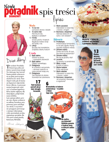 Nowy spis treści lipiec Moda To się nosi Cytrusowe ubrania i dodatki 8 To warto mieć Piechotą do lata… Najlepiej w sandałach! 10 Trendy Groszki, grochy i kropeczki. Wyjątkowo kobiece stroje dla każdej z nas. 16 Lekcja Na plaży bez kompleksów. Znajdziesz idealny kostium! 6 Uroda NA OKŁADCE: SYLWIA/MANGO MODELS; ZDJĘCIE: MIREK PIETRUSZYŃSKI, STYLIZACJA: BEATA SIEROŃ, MAKIJAŻ I FRYZURA: DARIA SIKORSKA. SUKIENKA: MOHITO Dz " 0i T o wydanie Poradnika Domowego pełne jest słońca i pozytywnej energii. Nic dziwnego, lato tuż-tuż! Zanim jednak wybierzecie się na plażę przeczytajcie artykuł na str. 22-25. Nasz ekspert radzi, jak do karnacji dopasować odpowiedni krem z filtrem. A potem już można bezpiecznie wskoczyć w kostium kąpielowy. Który będzie najlepszy dla danej figury, podpowiada nasza stylistka. Lato sprzyja miłości, pewnie więc chętnie zerkniecie na miłosny horoskop, przygotowany przez astrologa (str. 82-85). I oczywiście nie przegapcie pierwszego z naszego wakacyjnego cyklu opowiadania na lato, napisanego specjalnie dla Was przez znaną pisarkę Katarzynę Michalak. 3 poradnik domowy MAJ 2014 22 Bądź piękna Gotowa na słońce – przewodnik plażowiczki 26 Bądź piękna Makijaż rozświetlający 28 Pielęgnacja W urodowym warzywniaku – domowe maseczki na miarę potrzeb twojej cery 30 Pielęgnacja Test odżywek do włosów. Kosmetyki bez spłukiwania 17 Taki kostium potrafi ukryć zbyt okrągły brzuszek. 32 Warto sprawdzić Odpowiedzi na wasze listy i nowości z drogerii 34 Rozmowa z ekspertem Operacje plastyczne. Co warto o nich wiedzieć? Zdrowie 40 Profilaktyka Antykoncepcja hormonalna to nie tylko pigułka. Poznaj wszystkie dostępne metody 44 Zdrowie rodziny Zumba robi furorę. W czym tkwi sekret jej popularności? 46 Zdrowie rodziny Nie daj się grzybicy stóp! 48 Leczenie Są sposoby na paradontozę 50 Wiesz, co jesz 8 hitów na talerzu 52 Ważne badanie Próby wątrobowe 54 Warto wiedzieć Odpowiedzi na wasze listy i nowości z apteki 56 Rozmowa z ekspertem Jak przywrócić równowagę w organizmie? 6 Bransoletka w kolorze pomarańczy – to jeden z hitów tego lata. 8 Na szpilce, czy koturnie? Stylistka pomoże ci wybrać buty, w których zadasz szyku. 67 Wyborny, a łatwy do zrobienia tort bezowy z granatem. Pyszny! 13 Modne akcenty w grochy. Sprawdź, ile kosztuje szal i torba. ść NowoDODATEK 62 Oto alternatywa KULINARNY spis treści lipiec Ważna sprawa 76 Nigdy nie przestanę cię szukać. Dzieci, dorośli w kwiecie wieku, seniorzy… Zaginąć może każdy. Eksperci mówią, co robić, gdy taka tragedia przytrafi się komuś z naszych bliskich. dla tradycyjnych racuchów. Placuszki z ananasem – soczyste i chrupiące zarazem. Palce lizać! Psychologia 80 Jesteś ważna Jak się do tego zabrać? Poradnik dla osób, które ciągle odkładają coś na jutro 82 Horoskop miłosny Romans? Ślub? Astrolog sprawdził, co cię czeka w tegoroczne wakacje Dom i ogród 86 Inspiracje Domek na działce. Kilka prostych pomysłów i będzie wyglądał jak z bajki 90 Lekcja Uff, jak gorąco! Są jednak sposoby, by skutecznie ochłodzić mieszkanie 92 Zakupy Garnki do gotowania na parze. Jakie warto wybrać 94 Warto wiedzieć Odpowiedzi na wasze listy i nowości ze sklepu 102 Na plaży w Batumi zawsze świeci słońce. Ale Gruzja ma ci do zaoferowania o wiele, wiele więcej… Prawo i finanse 88 Uroczy kącik w domku na działce. By go urządzić, nie trzeba wydawać kroci… LIPCOWY „PORADNIK DOMOWY” KUPISZ TEŻ Z… …książką kulinarną „Najlepsze pierogi”. Znajdziesz w niej też przepisy czytelniczek, propozycje na dania z młodej kapusty, ciasta i desery z wiśniami. …książką „Mick. Szalone życie i geniusz Jaggera” Jej autor (Christopher Andersen) odkrywa największe sekrety z życia rockmana. To lektura pasjonująca, pikantna, szokująca, ale przede wszystkim wciągająca. 4 poradnik domowy LIPIEC 2014 Bliskie spotkania 20 36 Wywiad z Joanną Liszowską: Cieszę się każdym dniem Reportaż: Podróż za jeden uśmiech – niemal dosłownie, bo dwie Anie zwiedzają świat, płacąc za to naprawdę grosze! Poradnik rodziców 58 Najważniejsze pytania o kontrolę rodzicielską 60 Warto mieć Odpowiedzi na wasze listy i nowości dla maluchów Dodatek kulinarny 62 Nasz hit! Palcki i placuszki. Na słodko i w wersji wytrawnej. Prosto z patelni na talerz 66 Apetyt na… Bezy lekkie jak puch (i łatwiejsze niż sądzisz)! 68 Warto spróbować Odpowiedzi na wasze listy i nowości ze sklepów 71 Przepisy do zbierania Mięsa z ziołami 96 Cywilne Ubezpiecz się na wakacje – praktyczny przewodnik dla turysty. Ważne punkty w polisie, ceny, formalności 98 Finanse i rachunki Rady ekspertów i „Chcesz zostać w OFE? Złóź wniosek do ZUS” Czas relaksu 101 Podróże. 7 powodów, by odwiedzić Gruzję. 104 Opowiadania na lato. „Poranek wśród róż” – napisała dla Was Katarzyna Michalak, autorka bestsellerowych powieści m.in. „Ogród Kamili” i „Zacisze Gosi”. 108 Kultura Książki, filmy, wydarzenia 110 Krzyżówki 112 Horoskop 114 Za miesiąc