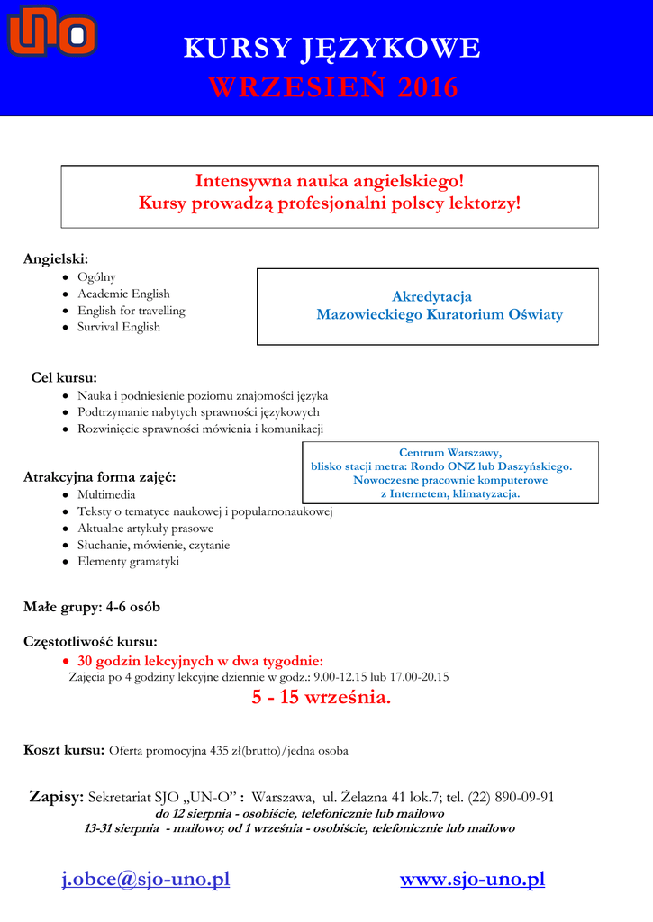LETNIE KURSY JĘZYKOWE WRZESIEŃ 2016 INTENSYWNE KURSY WAKACYJNE Intensywna nauka angielskiego! Kursy prowadzą profesjonalni polscy lektorzy! Angielski: Ogólny Academic English English for travelling Survival English Akredytacja Mazowieckiego Kuratorium Oświaty Cel kursu: Nauka i podniesienie poziomu znajomości języka Podtrzymanie nabytych sprawności językowych Rozwinięcie sprawności mówienia i komunikacji Atrakcyjna forma zajęć: Centrum Warszawy, blisko stacji metra: Rondo ONZ lub Daszyńskiego. Nowoczesne pracownie komputerowe z Internetem, klimatyzacja. Multimedia Teksty o tematyce naukowej i popularnonaukowej Aktualne artykuły prasowe Słuchanie, mówienie, czytanie Elementy gramatyki Małe grupy: 4-6 osób Częstotliwość kursu: 30 godzin lekcyjnych w dwa tygodnie: Zajęcia po 4 godziny lekcyjne dziennie w godz.: 9.00-12.15 lub 17.00-20.15 5 - 15 września. Koszt kursu: Oferta promocyjna 435 zł(brutto)/jedna osoba Zapisy: Sekretariat SJO „UN-O” : Warszawa, ul. Żelazna 41 lok.7; tel. (22) 890-09-91 do 12 sierpnia - osobiście, telefonicznie lub mailowo 13-31 sierpnia - mailowo; od 1 września - osobiście, telefonicznie lub mailowo [email protected] www.sjo-uno.pl