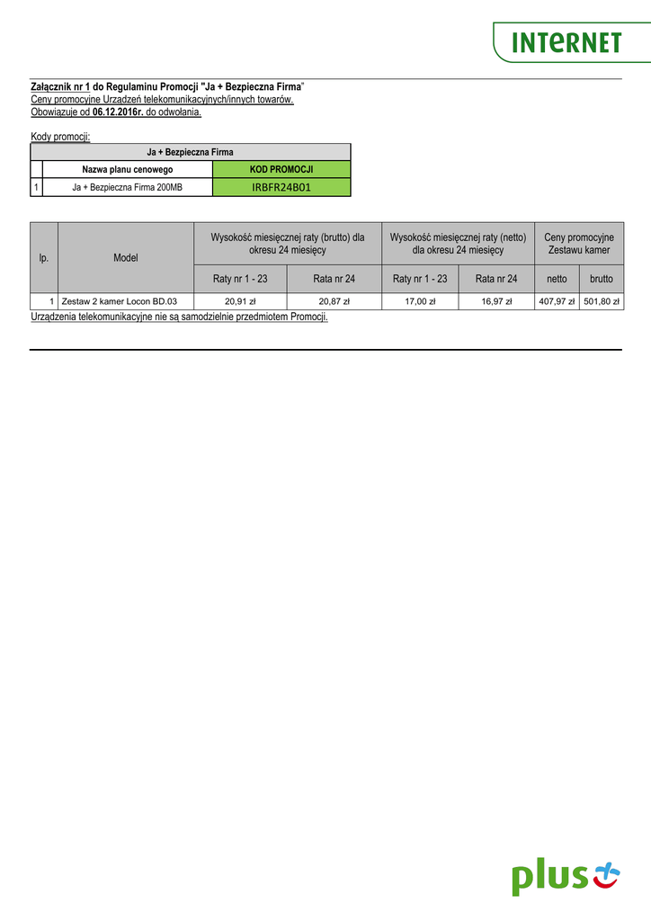 Załącznik nr 1 do Regulaminu Promocji "Ja + Bezpieczna Firma” Ceny promocyjne Urządzeń telekomunikacyjnych/innych towarów. Obowiązuje od 06.12.2016r. do odwołania. Kody promocji: Ja + Bezpieczna Firma 1 lp. Nazwa planu cenowego KOD PROMOCJI Ja + Bezpieczna Firma 200MB IRBFR24B01 Model 1 Zestaw 2 kamer Locon BD.03 Wysokość miesięcznej raty (brutto) dla okresu 24 miesięcy Wysokość miesięcznej raty (netto) dla okresu 24 miesięcy Ceny promocyjne Zestawu kamer Raty nr 1 - 23 Rata nr 24 Raty nr 1 - 23 Rata nr 24 netto brutto 20,91 zł 20,87 zł 17,00 zł 16,97 zł 407,97 zł 501,80 zł Urządzenia telekomunikacyjne nie są samodzielnie przedmiotem Promocji.