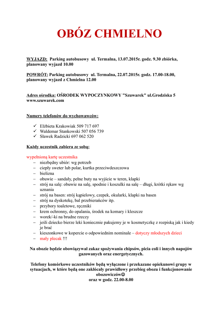 OBÓZ CHMIELNO WYJAZD: Parking autobusowy ul. Termalna, 13.07.2015r. godz. 9.30 zbiórka, planowany wyjazd 10.00 POWRÓT: Parking autobusowy ul. Termalna, 22.07.2015r. godz. 17.00-18.00, planowany wyjazd z Chmielna 12.00 Adres ośrodka: OŚRODEK WYPOCZYNKOWY "Szuwarek" ul.Grodziska 5 www.szuwarek.com Numery telefonów do wychowawców: Elżbieta Krakowiak 509 717 697 Waldemar Stankowski 507 056 739 Sławek Radzicki 697 062 520 Każdy uczestnik zabiera ze sobą: wypełnioną kartę uczestnika niezbędny ubiór: wg potrzeb ciepły sweter lub polar, kurtka przeciwdeszczowa bielizna obuwie – sandały, pełne buty na wyjście w teren, klapki strój na salę: obuwie na salę, spodnie i koszulki na salę – długi, krótki rękaw wg uznania strój na basen: strój kąpielowy, czepek, okularki, klapki na basen strój na dyskotekę, bal przebierańców itp. przybory toaletowe, ręczniki krem ochronny, do opalania, środek na komary i kleszcze worek/-ki na brudne rzeczy jeśli dziecko bierze leki koniecznie pakujemy je w kosmetyczkę z rozpiską jak i kiedy je brać kieszonkowe w kopercie o odpowiednim nominale – dotyczy młodszych dzieci mały plecak !!! Na obozie będzie obowiązywał zakaz spożywania chipsów, picia coli i innych napojów gazowanych oraz energetycznych. Telefony komórkowe uczestników będą wyłączone i przekazane opiekunowi grupy w sytuacjach, w które będą one zakłócały prawidłowy przebieg obozu i funkcjonowanie obozowiczów oraz w godz. 22.00-8.00