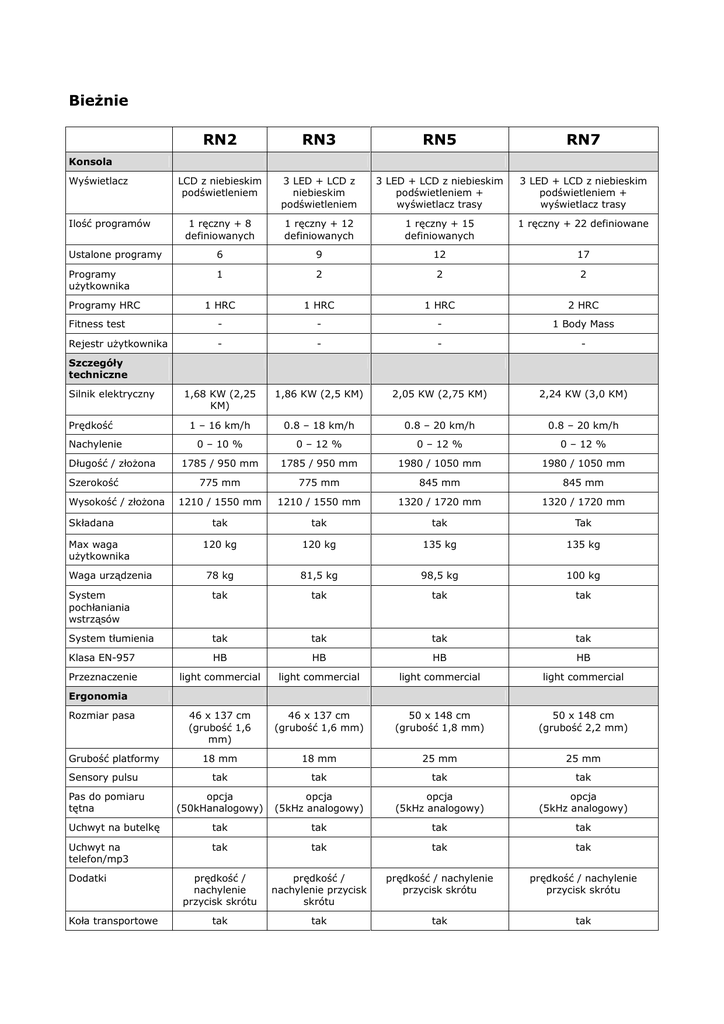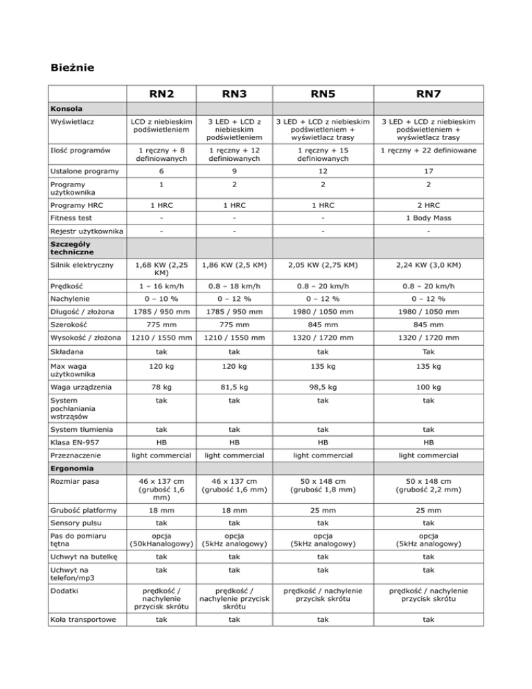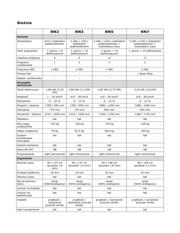 Bieżnie RN2 RN3 RN5 RN7 LCD z niebieskim podświetleniem 3 LED + LCD z niebieskim podświetleniem 3 LED + LCD z niebieskim podświetleniem + wyświetlacz trasy 3 LED + LCD z niebieskim podświetleniem + wyświetlacz trasy 1 ręczny + 8 definiowanych 1 ręczny + 12 definiowanych 1 ręczny + 15 definiowanych 1 ręczny + 22 definiowane Ustalone programy 6 9 12 17 Programy użytkownika 1 2 2 2 1 HRC 1 HRC 1 HRC 2 HRC Fitness test - - - 1 Body Mass Rejestr użytkownika - - - - 1,68 KW (2,25 KM) 1,86 KW (2,5 KM) 2,05 KW (2,75 KM) 2,24 KW (3,0 KM) 1 – 16 km/h 0.8 – 18 km/h 0.8 – 20 km/h 0.8 – 20 km/h 0 – 10 % 0 – 12 % 0 – 12 % 0 – 12 % 1785 / 950 mm 1785 / 950 mm 1980 / 1050 mm 1980 / 1050 mm 775 mm 775 mm 845 mm 845 mm 1210 / 1550 mm 1210 / 1550 mm 1320 / 1720 mm 1320 / 1720 mm tak tak tak Tak 120 kg 120 kg 135 kg 135 kg 78 kg 81,5 kg 98,5 kg 100 kg System pochłaniania wstrząsów tak tak tak tak System tłumienia tak tak tak tak Klasa EN-957 HB HB HB HB Przeznaczenie light commercial light commercial light commercial light commercial 46 x 137 cm (grubość 1,6 mm) 46 x 137 cm (grubość 1,6 mm) 50 x 148 cm (grubość 1,8 mm) 50 x 148 cm (grubość 2,2 mm) 18 mm 18 mm 25 mm 25 mm tak tak tak tak opcja (50kHanalogowy) opcja (5kHz analogowy) opcja (5kHz analogowy) opcja (5kHz analogowy) Uchwyt na butelkę tak tak tak tak Uchwyt na telefon/mp3 tak tak tak tak prędkość / nachylenie przycisk skrótu prędkość / nachylenie przycisk skrótu prędkość / nachylenie przycisk skrótu prędkość / nachylenie przycisk skrótu tak tak tak tak Konsola Wyświetlacz Ilość programów Programy HRC Szczegóły techniczne Silnik elektryczny Prędkość Nachylenie Długość / złożona Szerokość Wysokość / złożona Składana Max waga użytkownika Waga urządzenia Ergonomia Rozmiar pasa Grubość platformy Sensory pulsu Pas do pomiaru tętna Dodatki Koła transportowe