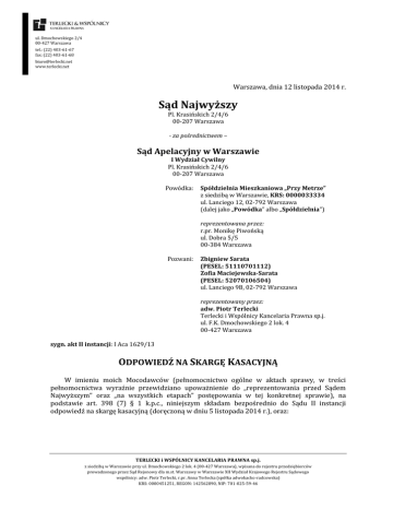 ul. Dmochowskiego 2/4 00-427 Warszawa tel.: (22) 403-61-67 fax: (22) 403-61-68 [email protected] www.terlecki.net Warszawa, dnia 12 listopada 2014 r. Sąd Najwyższy Pl. Krasińskich 2/4/6 00-207 Warszawa - za pośrednictwem – Sąd Apelacyjny w Warszawie I Wydział Cywilny Pl. Krasińskich 2/4/6 00-207 Warszawa Powódka: Pozwani: sygn. akt II instancji: I Aca 1629/13 Spółdzielnia Mieszkaniowa „Przy Metrze” z siedzibą w Warszawie, KRS: 0000033334 ul. Lanciego 12, 02-792 Warszawa (dalej jako „Powódka” albo „Spółdzielnia”) reprezentowana przez: r.pr. Monikę Piwońską ul. Dobra 5/5 00-384 Warszawa Zbigniew Sarata (PESEL: 51110701112) Zofia Maciejewska-Sarata (PESEL: 52070106504) ul. Lanciego 9B, 02-792 Warszawa reprezentowany przez: adw. Piotr Terlecki Terlecki i Wspólnicy Kancelaria Prawna sp.j. ul. F.K. Dmochowskiego 2 lok. 4 00-427 Warszawa ODPOWIEDŹ NA SKARGĘ KASACYJNĄ W imieniu moich Mocodawców (pełnomocnictwo ogólne w aktach sprawy, w treści pełnomocnictwa wyraźnie przewidziano upoważnienie do „reprezentowania przed Sądem Najwyższym” oraz „na wszystkich etapach” postępowania w tej konkretnej sprawie), na podstawie art. 398 (7) § 1 k.p.c., niniejszym składam bezpośrednio do Sądu II instancji odpowiedź na skargę kasacyjną (doręczoną w dniu 5 listopada 2014 r.), oraz: TERLECKI i WSPÓLNICY KANCELARIA PRAWNA sp.j. z siedzibą w Warszawie przy ul. Dmochowskiego 2 lok. 4 (00-427 Warszawa), wpisana do rejestru przedsiębiorców prowadzonego przez Sąd Rejonowy dla m.st. Warszawy w Warszawie XII Wydział Krajowego Rejestru Sądowego wspólnicy: adw. Piotr Terlecki, r.pr. Anna Terlecka (spółka adwokacko-radcowska) KRS: 0000451251, REGON: 142562890, NIP: 701-025-59-46 1. 2. 3. wnoszę o odmówienie przyjęcia skargi kasacyjnej do rozpoznania (w zw. z tym, że nie spełnione zostały przesłanki z art. 398(9) § 1 k.p.c.), a w przypadku przyjęcia jej do rozpoznania, wnoszę o oddalenie skargi kasacyjnej w całości; w przypadku przyjęcia skargi kasacyjnej do rozpoznania, wnoszę o wyznaczenie rozprawy w niniejszej sprawie; wnoszę o zasądzenie kosztów postępowania, w tym kosztów zastępstwa procesowego, według norm przepisanych (zgodnie z orzecznictwem SN za sporządzenie odpowiedzi na skargę kasacyjną powinno zasądzać się wynagrodzenie jak za sporządzenie skargi kasacyjnej – vide: pkt 5 uzasadnienia poniżej). UZASADNIENIE Dla przejrzystości wywodu, zachowano numerację jak w treści skargi kasacyjnej: 1. Uwagi wstępne Należy wskazać, iż nie jest prawdą, że Sąd II instancji nie kwestionował ustaleń faktycznych Sądu I instancji. Strona Pozwana przedstawiła 7 zarzutów apelacyjnych oraz dwa zarzuty przedawnienia. Sąd II instancji nie zajmował się w swoich rozważaniach ustaleniami faktycznymi Sądu I instancji bowiem uznał za zasadny najdalej idący zarzut strony Pozwanej, tj. zarzut przedawnienia roszczeń Spółdzielni w okresie 3-letnim. 2. Uzasadnienie wniosku o przyjęcie skargi kasacyjnej do rozpoznania. Należy wskazać, że w przedmiotowej sprawie nie zostały spełnione przesłanki określone w art. 398(9) k.p.c. Zgodnie z jednym z najnowszych postanowień Sądu Najwyższego z dnia 10 lipca 2014 r. (I CSK 681/2013): „Skarżący ma rację, że w orzecznictwie występowały przez dłuższy czas rozbieżności w zakresie oceny, jakie zdarzenia występujące w ciągu zapoczątkowanym wydaniem decyzji, później uznanych za nieważne lub za niezgodne z prawem, o odmowie oddania nieruchomości warszawskich na własność czasową, pozostawały w przyczynowym związku ze szkodą poniesioną przez właściciela przejętej nieruchomości. Powstały problem dotyczy jednak nie tyle wykładni wskazanych przez pozwanego przepisów, ile ich stosowania. Ponadto, pomimo występujących rozbieżności w ostatnim czasie w orzecznictwie Sądu Najwyższego ukształtowała się wyraźna tendencja do włączania do ciągu zdarzeń powodujących szkodę także wydania decyzji wywołujących następczo nieodwracalne dla właściciela zmiany własnościowe, uniemożliwiające przywrócenie stanu sprzed wydania nieważnej decyzji odmawiającej ustanowienia prawa własności czasowej (zob. np. wyroki Sądu Najwyższego z dnia 6 września 2012 r. I CSK 27/2012 nie publ., z dnia 4 października 2012 r. I CSK 665/2011 nie publ., i z dnia 15 lutego 2013 r. I CSK 332/2012 nie publ.). Stanowisko zajęte w rozpatrywanej sprawie wpisuje się więc w ukształtowany aktualnie kierunek stosowania prawa przez Sąd Najwyższy i nie uzasadnia potrzeby przyjęcia skargi kasacyjnej do rozpoznania”. W przedmiotowej sprawie od 2011 r. (począwszy od uchwały SN z 21 stycznia 2011 r., sygn. akt III CZP 125/10) linia orzecznicza SN jest jednolita w zakresie 3-letniego przedawnienia roszczeń spółdzielni mieszkaniowych względem ich członków oraz traktowania działalności spółdzielni jako działalności gospodarczej. Na powyższe zwrócił uwagę skład 2 orzekający w II instancji: „Jakkolwiek w judykaturze Sądu Najwyższego jeszcze do 2011 r. zdawało się dominować stanowisko zgodne z tym poglądem Sądu Okręgowego, jednak nie wydaje się ono przekonywające i zostało poniechane w późniejszym orzecznictwie tego Sądu. Jak wyjaśnił Sąd Najwyższy w wyroku z dnia 8 listopada 2012 r. (I CSK 199/12, LEX nr 1254613), działalność spółdzielni mieszkaniowej, dostosowana do jej specyficznych zadań, choć nieprowadzona w celu zarobkowym, lecz podporządkowana nadrzędnej zasadzie gospodarności, mieści się w pojęciu działalności gospodarczej.” Nawet zestawienie orzeczeń zaprezentowane przez Powoda potwierdza powyższy fakt – orzeczenia opowiadające się za terminem 10-letnim przedawnienia (nieprowadzeniem działalności gospodarczej przez spółdzielnie) pochodzą sprzed 2011 r. Strona Powodowa powołuje się także na komentarz z 2010 r. autorstwa R. Dziczka, który był jednym z orzekających w niniejszej sprawie (prz