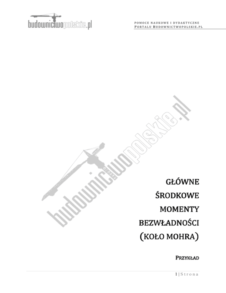 GŁÓWNE ŚRODKOWE MOMENTY BEZWŁADNOŚCI (KOŁO MOHRA) PRZYKŁAD Dla figury płaskiej jak na rys.1 wyznaczyć położenie głównych środkowych osi bezwładności oraz wartości momentów bezwładności względem tych osi, przyjmując: b1 = 6cm , b2 = 1cm , h1 = 5cm , h2 = 3cm , a = 1cm . Zadanie rozwiązać analitycznie i graficznie. Rys.1 Figura płaska złożona z trójkąta i prostokąta W celu obliczenia współrzędnych środka ciężkości przyjmujemy położenie układu współrzędnych (rys.2). Rys.2 Podział na figury proste Daną figurę możemy podzielić na dwie prostsze, pierwszą z nich będzie trójkąt, drugą prostokąt (rys.2). A1 = b1h1 = 15cm 2 2 A2 = b2 h2 = 3cm 2 Pole powierzchni całkowitej wynosi zatem: A = A1 − A2 = 15 − 3 = 12cm 2 Współrzędne położenia środka ciężkości dla trójkąta i prostokąta zgodnie z przyjętym układem współrzędnych wynoszą odpowiednio: h b y c1 = 1 = 2cm , z c1 = 1 = 1,67cm , 3 3 yc 2 = a + b2 1 = 1 + = 1,5cm , 2 2 zc2 = h2 = 1,5cm 2 Momenty statyczne względem osi y i z obliczymy jako różnicę momentu statycznego figury pierwszej i drugiej: S y = S y1 − S y 2 = A1 z c1 − A2 z c 2 = 15 ⋅ 1,67 − 3 ⋅ 1,5 = 20,5cm 3 S z = S z1 − S z 2 = A1 y c1 − A2 y c 2 = 15 ⋅ 2 − 3 ⋅ 1,5 = 25,5cm 3 Położenie środka ciężkości dla całej figury wyznaczają następujące współrzędne: yc = S z 25,5 = = 2,13cm , A 12 zc = Sy A = 20,5 = 1,71cm 12 Obliczone wartości współrzędnych środka ciężkości nanosimy na schemat i wprowadzamy centralny układ współrzędnych y o , zo (rys.3). Rys.3 Położenie środka ciężkości oraz centralnego układu współrzędnych Momenty bezwładności oraz moment dewiacji względem osi y i z wynoszą: b1h1 bh 6 ⋅ 5 3 1 ⋅ 33 − 2 2 = − = 53,5cm 4 12 3 12 3 3 Jy = 3 3 3 h1b1 h2 b2 5 ⋅ 6 3 3 ⋅13 2 2 Jz = − + A2 ⋅ y c 2 = − − 3 ⋅ (1,5) = 83cm 4 12 12 12 12 b h 6 2 ⋅ 52 = 1 1 − A2 ⋅ y c 2 ⋅ z c 2 = − 3 ⋅ 1,5 ⋅ 1,5 = 30,75cm 4 24 24 2 J yz 2 Korzystając z twierdzenia Steinera wyznaczamy momenty bezwładności względem osi środkowych: J yo = J y − A ⋅ z c = 53,5 − 12 ⋅ 1,712 = 18,48cm 4 2 J zo = J z − A ⋅ yc = 83 − 12 ⋅ 2,132 = 28,81cm 4 2 J yo zo = J yz − A ⋅ yc ⋅ z c = 30,75 − 12 ⋅ 2,13 ⋅ 1,71 = −12,81cm 4 Położenie głównych środkowych osi bezwładności wyznaczymy z zależności: tg 2ϕ o = − 2 J yo zo J y o − J zo = 2ϕ o = −68 o 2 ′ , − 2 ⋅ (− 12,81) = −2,48 18,48 − 28,81 ⇒ ϕ o = −34 o1′ Momenty bezwładności względem osi głównych środkowych wynoszą: J1, J 2 = J y o + J zo 2 J y − J zo ± o 2 2 + J yo zo 2 = 18,48 + 28,81 18,48 − 28,81 2 = ± + (− 12,81) = 2 2 = 23,65 ± 13,81 2 J 1 = 23,65 + 13,81 = 37,46cm 4 = J max J 2 = 23,65 − 13,81 = 9,84cm 4 = J min Rys.4 Położenie osi głównych środkowych yog , zog Aby wyznaczyć graficznie położenie osi głównych środkowych oraz momentów bezwładności J 1 , J 2 względem tych osi, należy na osi poziomej (osi momentów bezwładności na rys.5) odłożyć odcinki J y = OC i J z = OD oraz prostopadłe do nich o o odcinki J yo zo = CE = DF (patrz rys.5). Łączymy punkty E i F średnicą EF , przecinającą oś poziomą w punkcie S i zataczamy okrąg o promieniu ES = SF , który w miejscu przecięcia z osią poziomą wyznacza punkty A i B . Z konstrukcji koła ostatecznie otrzymujemy: J 1 = J max = OB , J 2 = J min = OA oraz kąt 2ϕ o jaki tworzy prosta EF z osią poziomą, który jest podwojonym kątem nachylenia osi głównych środkowych względem osi y o , zo . Zgodnie z rys.5 mamy: J 1 , J 2 = OS ± AS gdzie: OS = J 1 + J 2 J y o + J zo = 2 2 2 AS = ES = SF = SB = SD + DF natomiast: 2 SD = J yo − J zo 2 DF = J yo zo , Wykorzystując powyższe zależności otrzymujemy: J 1 , J 2 = OS ± AS = J yo + J zo 2 J y − J zo ± o 2 2 + J yo zo 2 = 18,48 + 28,81 18,48 − 28,81 2 = ± + (− 12,81) = 2 2 = 23,65 ± 13,81 2 J 1 = 23,65 + 13,81 = 37,46cm 4 = J max J 2 = 23,65 − 13,81 = 9,84cm 4 = J min Rys.5 Rozwiązanie graficzne (koło Mohra)