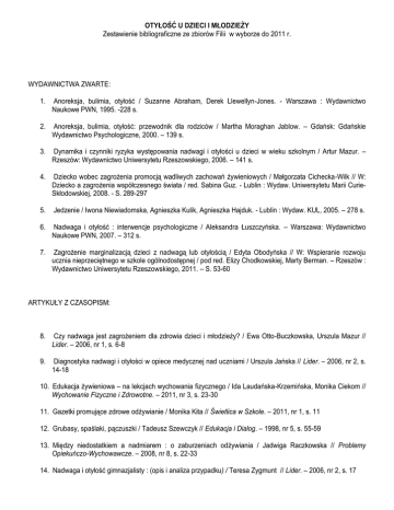 OTYŁOŚĆ U DZIECI I MŁODZIEŻY Zestawienie bibliograficzne ze zbiorów Filii w wyborze do 2011 r. WYDAWNICTWA ZWARTE: 1. Anoreksja, bulimia, otyłość / Suzanne Abraham, Derek Llewellyn-Jones. - Warszawa : Wydawnictwo Naukowe PWN, 1995. -228 s. 2. Anoreksja, bulimia, otyłość: przewodnik dla rodziców / Martha Moraghan Jablow. – Gdańsk: Gdańskie Wydawnictwo Psychologiczne, 2000. – 139 s. 3. Dynamika i czynniki ryzyka występowania nadwagi i otyłości u dzieci w wieku szkolnym / Artur Mazur. – Rzeszów: Wydawnictwo Uniwersytetu Rzeszowskiego, 2006. – 141 s. 4. Dziecko wobec zagrożenia promocją wadliwych zachowań żywieniowych / Małgorzata Cichecka-Wilk // W: Dziecko a zagrożenia współczesnego świata / red. Sabina Guz. - Lublin : Wydaw. Uniwersytetu Marii CurieSkłodowskiej, 2008. - S. 289-297 5. Jedzenie / Iwona Niewiadomska, Agnieszka Kulik, Agnieszka Hajduk. - Lublin : Wydaw. KUL, 2005. – 278 s. 6. Nadwaga i otyłość : interwencje psychologiczne / Aleksandra Łuszczyńska. – Warszawa: Wydawnictwo Naukowe PWN, 2007. – 312 s. 7. Zagrożenie marginalizacją dzieci z nadwagą lub otyłością / Edyta Obodyńska // W: Wspieranie rozwoju ucznia nieprzeciętnego w szkole ogólnodostępnej / pod red. Elizy Chodkowskiej, Marty Berman. – Rzeszów : Wydawnictwo Uniwersytetu Rzeszowskiego, 2011. – S. 53-60 ARTYKUŁY Z CZASOPISM: 8. Czy nadwaga jest zagrożeniem dla zdrowia dzieci i młodzieży? / Ewa Otto-Buczkowska, Urszula Mazur // Lider. – 2006, nr 1, s. 6-8 9. Diagnostyka nadwagi i otyłości w opiece medycznej nad uczniami / Urszula Jańska // Lider. – 2006, nr 2, s. 14-18 10. Edukacja żywieniowa – na lekcjach wychowania fizycznego / Ida Laudańska-Krzemińska, Monika Ciekom // Wychowanie Fizyczne i Zdrowotne. – 2011, nr 3, s. 23-30 11. Gazetki promujące zdrowe odżywianie / Monika Kita // Świetlica w Szkole. – 2011, nr 1, s. 11 12. Grubasy, spaślaki, pączuszki / Tadeusz Szewczyk // Edukacja i Dialog. – 1998, nr 5, s. 55-59 13. Między niedostatkiem a nadmiarem : o zaburzeniach odżywiania / Jadwiga Raczkowska // Problemy Opiekuńczo-Wychowawcze. – 2008, nr 8, s. 22-33 14. Nadwaga i otyłość gimnazjalisty : (opis i analiza przypadku) / Teresa Zygmunt // Lider. – 2006, nr 2, s. 17 15. Nadwaga i otyłość dzieci - przyczyny i zagrożenia / Agnieszka Przychodni // // Nauczanie Początkowe. – 2006/2007, nr 4, s. 35-41 16. Nadwaga i otyłość – zrób coś z tym! / Zbigniew Cendrowski // Lider . – 2007, nr 11, s. 4-8 17. Negatywne konsekwencje otyłości wśród dzieci i młodzieży oraz sposoby jej leczenia i i zapobiegania / Karolina Leksy // Wychowanie na co Dzień. – 2007, nr 9, s. 26-29 18. Otyłość u dzieci / Grażyna Rowicka // Wychowanie w Przedszkolu. – 2005, nr 1, s. 38-41 19. Otyłość u dzieci - przegląd aktualnych badań / Dominik Olejniczak, Kamila Głowacka // Lider. – 2009, nr 9, s. 26-27 20. Otyłość u najmłodszych / Magdalena Makarewicz-Wujec // Wychowanie w Przedszkolu. – 2009, nr 11, s. 2326 21. Polski model szkolnego wychowania fizycznego wobec wyzwań cywilizacyjnych / Marek Lewandowski, Tomasz Frołowicz, Małgorzata Reksiak // Wychowanie Fizyczne i Zdrowotne. – 2005, nr 8/9, s. 7-12 22. Problemy dotyczące ideału sylwetki XXI wieku / Beata Faustowska // Lider. - 2008, nr 1, s. 13-15 23. Problemy dziecka otyłego / Joanna Szmidt // Edukacja i Dialog. - 2005, nr 7, s. 55-60 24. Problem otyłości dzieci i młodzieży / Beata Ziółkowska // Remedium . – 2005, nr 7/8, s. 18-19 25. Promuj zdrowie! (scenariusz zajęć do wykorzystania na 2 godzinach wychowawczych) / Agnieszka Fijałkowska // Wszystko dla Szkoły. – 2001, nr 6, s. 15 26. Rekreacja zdrowa i przyjemna. Cz. 5 [!] / Kinga Klaś-Pupar // Remedium. – 2008, nr 2, s. 21 27. Społeczne i kulturowe uwarunkowania żywienia / Anna Szymańska // Lider. – 2011, nr 9, s. 10-12 28. „To śmieci tuczą dzieci!” (scenariusz przedstawienia promującego zdrową żywność i zdrowy styl życia) / Agnieszka Fijałkowska // Wszystko dla Szkoły. – 2011, nr 6, s. 4-6 29. Wpływ żywienia na rozwój psychofizyczny i zdrowie człowieka / Światosław Ziemiański // Wychowanie Fizyczne i Zdrowotne. – 1997, nr 4, s. 146-154 30. Wybrane aspekty występowania nadwagi i otyłości u dzieci i młodzieży / Karina Kleksy // Wychowanie na co Dzień. – 2006, nr 12, s. 12-17 31. Zalecenia w czasie redukcji nadwagi u dzieci i młodzieży / Edward Jabłoński, Urszula Kaźmierczak // Wychowanie Fizyczne i Zdrowotne. – 2002, nr 1, s. 16-18 32. Zdrowe odżywianie - wiem, co jem / Marzena Głogowska, Urszula Grodecka, Monika Kita // Świetlica w Szkole . – 2010, nr 3, s. 17-18 33. Znaczenie aktywności fizycznej w utrzymaniu należnej masy ciała i wysokiej jakości życia / Agnieszka Jakubek, Piotr Susik // Lider. – 2006, nr 10, s. 3-6 34. Związek pomiędzy sprawnością fizyczną, częstotliwością podejmowania aktywności fizycznej a wskaźnikami nadwagi / Michał Bronikowski // Wychowanie Fizyczne i Zdrowotne . – 2004, nr 12, s. 10-14 Oprac. Agnieszka Leśnik-Lewandowska