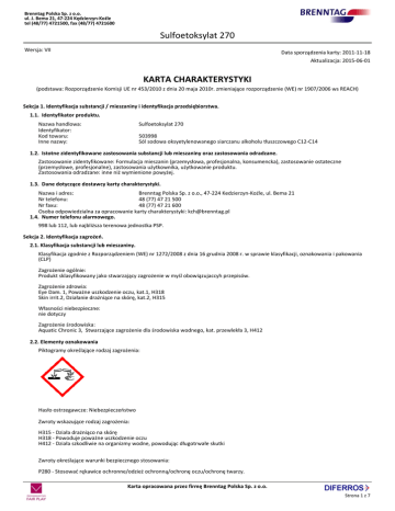 Brenntag Polska Sp. z o.o. ul. J. Bema 21, 47-224 Kędzierzyn-Koźle tel (48/77) 4721500, fax (48/77) 4721600 Sulfoetoksylat 270 Wersja: VII Data sporządzenia karty: 2011-11-18 Aktualizacja: 2015-06-01 KARTA CHARAKTERYSTYKI (podstawa: Rozporządzenie Komisji UE nr 453/2010 z dnia 20 maja 2010r. zmieniające rozporządzenie (WE) nr 1907/2006 ws REACH) Sekcja 1. Identyfikacja substancji / mieszaniny i identyfikacja przedsiębiorstwa. 1.1. Identyfikator produktu. Nazwa handlowa: Identyfikator: Kod towaru: Inne nazwy: Sulfoetoksylat 270 503998 Sól sodowa oksyetylenowanego siarczanu alkoholu tłuszczowego C12-C14 1.2. Istotne zidentyfikowane zastosowania substancji lub mieszaniny oraz zastosowania odradzane. Zastosowanie zidentyfikowane: Formulacja mieszanin (przemysłowa, profesjonalna, konsumencka), zastosowanie ostateczne (przemysłowe, profesjonalne), zastosowania użytkownika, użytkowanie produktu. Zastosowania odradzane: inne niż wymienione powyżej. 1.3. Dane dotyczące dostawcy karty charakterystyki. Nazwa i adres: Brenntag Polska Sp. z o.o., 47-224 Kedzierzyn-Koźle, ul. Bema 21 Nr telefonu: 48 (77) 47 21 500 Nr faxu: 48 (77) 47 21 600 Osoba odpowiedzialna za opracowanie karty charakterystyki: [email protected] 1.4. Numer telefonu alarmowego. 998 lub 112, lub najbliższa terenowa jednostka PSP. Sekcja 2. Identyfikacja zagrożeń. 2.1. Klasyfikacja substancji lub mieszaniny. Klasyfikacja zgodnie z Rozporządzeniem (WE) nr 1272/2008 z dnia 16 grudnia 2008 r. w sprawie klasyfikacji, oznakowania i pakowania (CLP) Zagrożenie ogólnie: Produkt sklasyfikowany jako stwarzający zagrożenie w myśl obowiązujaccyh przepisów. Zagrożenie zdrowia: Eye Dam. 1, Poważne uszkodzenie oczu, kat.1, H318 Skin irrit.2, Działanie drażniące na skórę, kat.2, H315 Własności niebezpieczne: nie dotyczy Zagrożenie środowiska: Aquatic Chronic 3, Stwarzające zagrożenie dla środowiska wodnego, kat. przewlekła 3, H412 2.2. Elementy oznakowania Piktogramy określające rodzaj zagrożenia: Hasło ostrzegawcze: Niebezpieczeństwo Zwroty wskazujące rodzaj zagrożenia: H315 - Działa drażniąco na skórę H318 - Powoduje poważne uszkodzenie oczu H412 - Działa szkodliwie na organizmy wodne, powodując długotrwałe skutki Zwroty określające warunki bezpiecznego stosowania: P280 - Stosować rękawice ochronne/odzież ochronną/ochronę oczu/ochronę twarzy. Karta opracowana przez firmę Brenntag Polska Sp. z o.o. Strona 1 z 7 Brenntag Polska Sp. z o.o. ul. J. Bema 21, 47-224 Kędzierzyn-Koźle tel (48/77) 4721500, fax (48/77) 4721600 Sulfoetoksylat 270 P302+P352 - W przypadku kontaktu ze skórą: Umyć dużą ilością wody z mydłem. P305+P351+P338 - W przypadku dostania się do oczu: Ostrożnie płukać wodą przez kilka minut.Wyjąć soczewki kontaktowe, jeżeli są i można je łatwo usunąć. nadal płukać. P310 - Natychmiast skontaktować się z Ośrodkiem Zatruć lub lekarzem P332+P313 - W przypadku wystąpienia podrażnienia skóry: Zasięgnąć porady/zgłosić się pod opiekę lekarza. P264b - Dokładnie umyć ciało po użyciu P273 - Unikać uwolnienia do środowiska. 2.3. Inne zagrożenia. nie są znane Sekcja 3. Skład / informacja o składnikach. Skład wg Rozporządzenia 1272/2008. Sól sodowa oksyetylenowanego siarczanu alkoholu tłuszczowego C12-C14 68,0-72,0% ( Eye Dam. 1, H318; Skin Irrit.2, H315; Aquatic Chronic 3, H412; CAS: 68891-38-3; WE: 500-234-8) Numer rejestracji: 01-2119488639-16-XXXX O ile wymienione są składniki niebezpieczne, znaczenie zwrotów H podane jest w p. 16 karty charakterystyki. Sekcja 4. Środki pierwszej pomocy. 4.1. Opis środków pierwszej pomocy. Wdychanie: W razie narażenia inhalacyjnego wynieść poszkodowanego z miejsca narażenia, zapewnić spokój, przy kłopotach z oddychaniem wykwalifikowany personel powinien podać tlen, przy zastrzymaniu oddechu zastosowac sztuczne oddychanie. Wezwać pomoc lekarską. Kontakt ze skórą: W razie kontaktu ze skórą zmyć dokładnie dużą ilością wody, skonsultować z lekarzem. Kontakt z oczami: W razie zanieczyszczenia oczu natychmiast płukać je dużą ilością wody przez co najmniej 15 minut przy otwartych powiekach, skonsultować z lekarzem. Spożycie: W razie połknięcia zasiegnąć porady lekarskiej, nie wywoływać wymiotów bez konsultacji z lekarzem. Nigdy nie podawać niczego doustnie osobie nieprzytomnej. 4.2. Najważniejsze ostre i opóźnione objawy oraz skutki narażenia. brak dostępnych danych 4.3. Wskazania dotyczące wszelkiej natychmiastowej pomocy lekarskiej i szczególnego postępowania z poszkodowanym. brak dostępnych danych Sekcja 5. Postępowanie w przypadku pożaru. 5.1. Środki gaśnicze. dwutlenek węgla, rozpylona woda, proszki gaśnicze, piany gaśnicze 5.2. Szczególne zagrożenia związane z substancją lub mieszaniną. Produkt ulega rozkładowi z wydzieleniem niebezpiecznych gazów i oparów. 5.3. Informacje dla straży pożarnej. Pozostałości po pożarze i zanieczyszczoną wodę gaśniczą unieszkodliwić zgodnie z przepisami Stosować środki ochrony dróg oddechowych oraz ubranie ochronne Sekcja 6. Postępowanie w przypadku niezamierzonego uwolnienia do środowiska. 6.1. Indywidualne środki ostrożności, wyposażenie ochronne i procedury w sytuacjach awaryjnych. Unikać kontaktu ze skórą i oczami. Zapewnić odpowiednią wentylację. Zakładać środki ochrony osobistej. Uniemożliwić dostęp osób postronnych i nieupoważnionych. 6.2. Środki ostrożności w zakresie ochrony środowiska. Zapobiec rozprzestrzenianiu się produktu do kanalizacji, wód powierzchniowych i gruntowych 6.3. Metody i materiały zapobiegające rozprzestrzenianiu się skażenia i służące do usuwania skażenia. Zabezpieczyć uszkodzone opakowania; rozlewy przysypać materiałem chłonnym (piasek, żel krzemionkowy, uniwersalne absorbery), zebrać do zamykanego pojemnika; przekazać do likwidacji. 6.4. Odniesienia do innych sekcji. Informacje dotyczące odpowiedniego sprzętu ochron