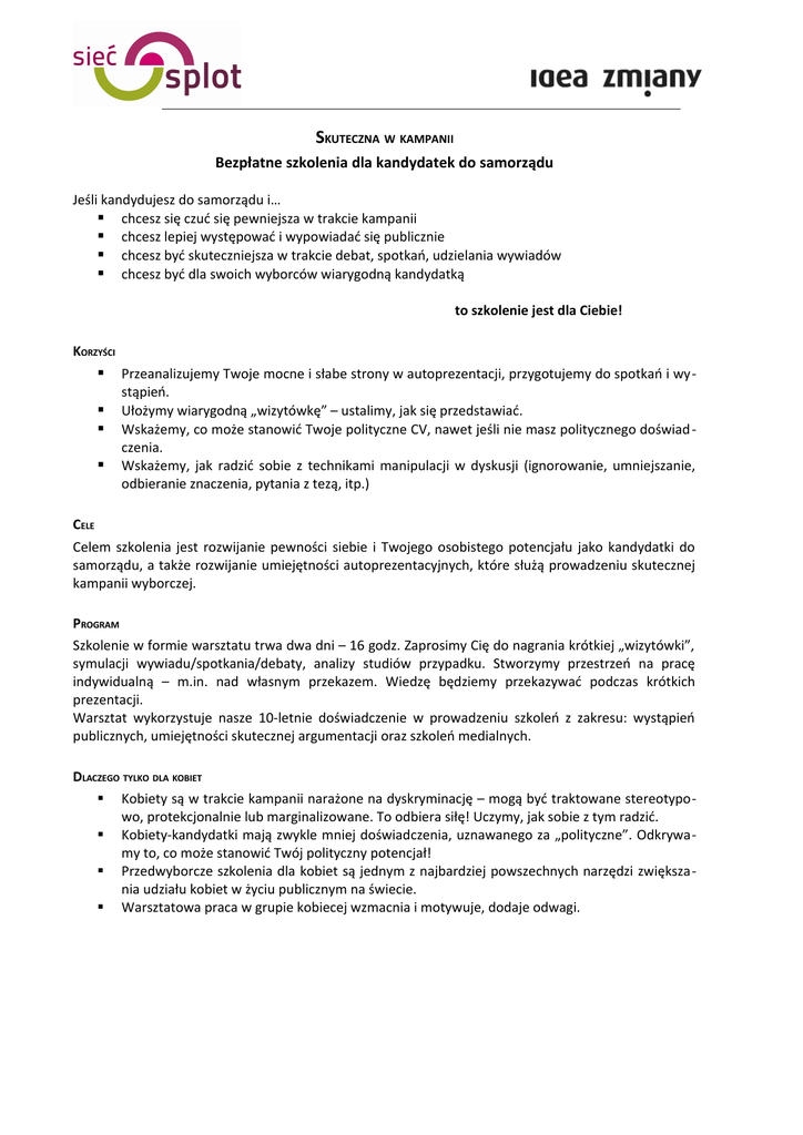 SKUTECZNA W KAMPANII Bezpłatne szkolenia dla kandydatek do samorządu Jeśli kandydujesz do samorządu i… chcesz się czuć się pewniejsza w trakcie kampanii chcesz lepiej występować i wypowiadać się publicznie chcesz być skuteczniejsza w trakcie debat, spotkań, udzielania wywiadów chcesz być dla swoich wyborców wiarygodną kandydatką to szkolenie jest dla Ciebie! KORZYŚCI Przeanalizujemy Twoje mocne i słabe strony w autoprezentacji, przygotujemy do spotkań i wystąpień. Ułożymy wiarygodną „wizytówkę” – ustalimy, jak się przedstawiać. Wskażemy, co może stanowić Twoje polityczne CV, nawet jeśli nie masz politycznego doświad czenia. Wskażemy, jak radzić sobie z technikami manipulacji w dyskusji (ignorowanie, umniejszanie, odbieranie znaczenia, pytania z tezą, itp.) CELE Celem szkolenia jest rozwijanie pewności siebie i Twojego osobistego potencjału jako kandydatki do samorządu, a także rozwijanie umiejętności autoprezentacyjnych, które służą prowadzeniu skutecznej kampanii wyborczej. PROGRAM Szkolenie w formie warsztatu trwa dwa dni – 16 godz. Zaprosimy Cię do nagrania krótkiej „wizytówki”, symulacji wywiadu/spotkania/debaty, analizy studiów przypadku. Stworzymy przestrzeń na pracę indywidualną – m.in. nad własnym przekazem. Wiedzę będziemy przekazywać podczas krótkich prezentacji. Warsztat wykorzystuje nasze 10-letnie doświadczenie w prowadzeniu szkoleń z zakresu: wystąpień publicznych, umiejętności skutecznej argumentacji oraz szkoleń medialnych. DLACZEGO TYLKO DLA KOBIET Kobiety są w trakcie kampanii narażone na dyskryminację – mogą być traktowane stereotypowo, protekcjonalnie lub marginalizowane. To odbiera siłę! Uczymy, jak sobie z tym radzić. Kobiety-kandydatki mają zwykle mniej doświadczenia, uznawanego za „polityczne”. Odkrywamy to, co może stanowić Twój polityczny potencjał! Przedwyborcze szkolenia dla kobiet są jednym z najbardziej powszechnych narzędzi zwiększania udziału kobiet w życiu publicznym na świecie. Warsztatowa praca w grupie kobiecej wzmacnia i motywuje, dodaje odwagi. INICJATORKI I ORGANIZATORZY Projekt jest autorskim przedsięwzięciem trenerek Idei Zmiany (www.ideazmiany.pl). Wyniknął z potrzeby wzmacniania kobiet w życiu publicznym. Realizujemy go dzięki wsparciu i we współpracy z Siecią SPLOT (www.siecsplot.pl). Na Lubelszczyźnie projekt wspiera Stowarzyszenie Homo Faber (www.hf.org.pl) PROWADZĄCE Małgorzata Borowska – trenerka umiejętności społecznych sześcioletnim doświadczeniem. Doświadczenie dotyczące kampanii wyborczych przywiozła ze stażu w brytyjskiej Izbie Lordów, gdzie przygotowywała argumentację do wystąpień Partii Konserwatywnej współpracowała przy programie mentorskim dla kobiet-kandydatek „Women2Win”. Jest dziennikarką „w stanie spoczynku” – pracowała w Polskim Radiu Pomorza i Kujaw. Przez pięć ostatnich lat prowadziła zajęcia ze skutecznej argumentacji w Stowarzyszeniu Szkoła Liderów. Maja Branka – trenerka i konsultantka z dziesięcioletnim doświadczeniem. Była szefową sztabu wyborczego podczas kampanii samorządowej. Specjalizuje się m.in. w szkoleniach z wystąpień publicznych – uczy jak skutecznie występować i prowadzić prezentacje. Przez 6 lat opracowywała i prowadziła programy rozwojowe i przywódcze dla kobiet (Akademia Równości Kobiet, Akcja Akacja, Instytut Przywództwa Kobiet), realizowane m.in. w Polsce, Kosowie i Gruzji. Założyła i prowadzi firmę Idea Zmiany. Marta Rawłuszko – trenerka i konsultantka w zakresie równości płci i programów na Absolwentka Szkoły Trenerów Biznesu Grupy TROP, prowadzi szkolenia rozwijające miękkie dla administracji publicznej oraz organizacji pozarządowych. Autorka szkoleniowych dotyczących autoprezentacji i skutecznej argumentacji, realizowanej Liderek w Krakowie oraz podczas Polonijnych Szkół Liderów Europy Zachodniej. rzecz kobiet. umiejętności programów w Instytucie Dominika Cieślikowska – psycholożka, trenerka umiejętności psychospołecznych. Specjalizuje się w pracy z grupami kobiecymi w dziedzinie rozwoju kompetencji zawodowych, osobistych, liderskich, przygotowując do aktywnego uczestnictwa w sferze publicznej (szkolenia motywacyjne, planowanie kariery, wystąpienia publiczne, autoprezentacje w świecie biznesu, polityki, mediach) Uczestniczyła w programach dla kobiet w Polsce, Gruzji i Kosowie. WARUNKI UDZIAŁU Pierwszeństwo w szkoleniach będą miały kobiety z małych miejscowości oraz kandydujące po raz pierwszy. Warunkiem przyjęcia na szkolenie jest deklaracja, a następnie rzetelna obecność podczas dwóch dni zajęć. Szkolenie jest bezpłatne, nie pokrywamy jednak kosztów dojazdu, noclegu oraz wyżywienia w trakcie szkolenia. JAK SIĘ ZGŁOSIĆ 1. Wejdź na stronę Stowarzyszenia Homo Faber – www.hf.org.pl 2. Pobierz formularz zgłoszeniowy – www.hf.org.pl 3. Prześlij go na adres: [email protected] 4. Poczekaj na potwierdzenie udziału. Poinformujemy Cię najpóźniej 9 października. Informacja o szkoleniach w innych miastach: Poznań, www.pisop.org.pl Słupsk, www.cio.slupsk.pl Białystok, www.owop.org.pl Opole, www.ocwip.pl Kraków, www.bis-krakow.pl Elbląg, www.eswip.pl Wrocław, www.rcwip.pl Lublin, www.hf.org.pl Łódź, www.opus.org.pl Do zobaczenia!