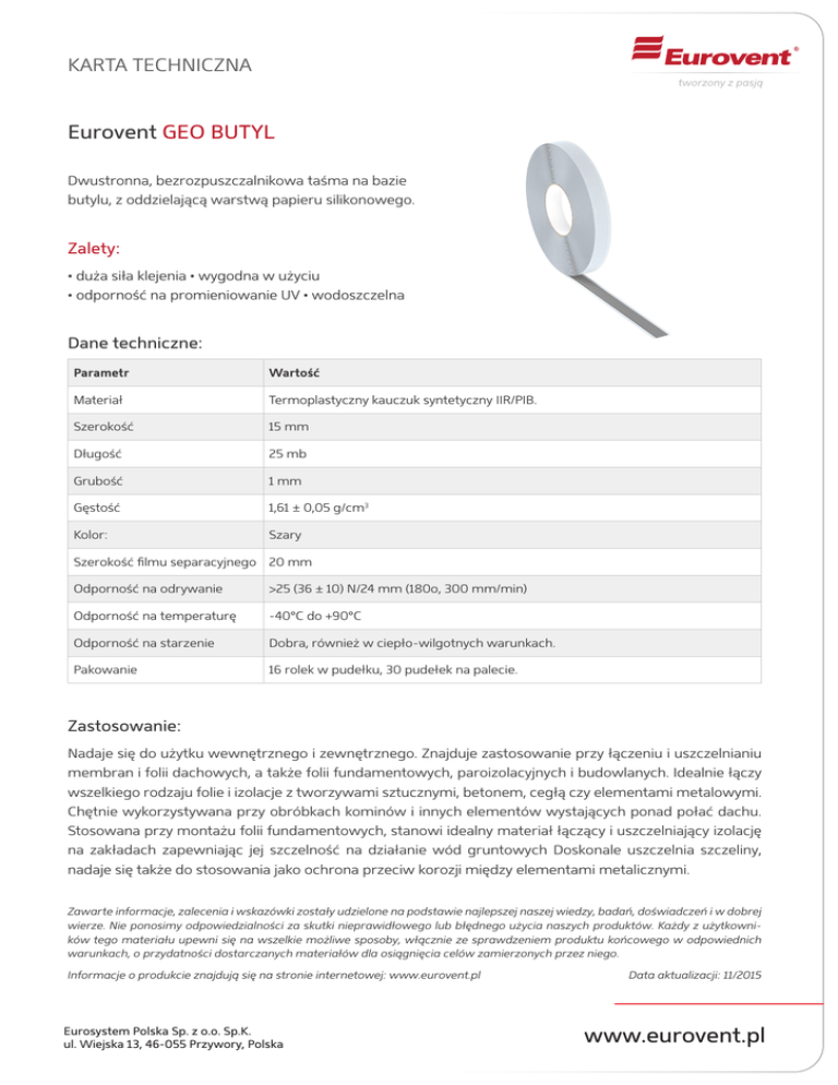 KARTA TECHNICZNA Eurovent GEO BUTYL Dwustronna, bezrozpuszczalnikowa taśma na bazie butylu, z oddzielającą warstwą papieru silikonowego. Zalety: • duża siła klejenia • wygodna w użyciu • odporność na promieniowanie UV • wodoszczelna Dane techniczne: Parametr Wartość Materiał Termoplastyczny kauczuk syntetyczny IIR/PIB. Szerokość 15 mm Długość 25 mb Grubość 1 mm Gęstość 1,61 ± 0,05 g/cm3 Kolor: Szary Szerokość filmu separacyjnego 20 mm Odporność na odrywanie >25 (36 ± 10) N/24 mm (180o, 300 mm/min) Odporność na temperaturę -40°C do +90°C Odporność na starzenie Dobra, również w ciepło-wilgotnych warunkach. Pakowanie 16 rolek w pudełku, 30 pudełek na palecie. Zastosowanie: Nadaje się do użytku wewnętrznego i zewnętrznego. Znajduje zastosowanie przy łączeniu i uszczelnianiu membran i folii dachowych, a także folii fundamentowych, paroizolacyjnych i budowlanych. Idealnie łączy wszelkiego rodzaju folie i izolacje z tworzywami sztucznymi, betonem, cegłą czy elementami metalowymi. Chętnie wykorzystywana przy obróbkach kominów i innych elementów wystających ponad połać dachu. Stosowana przy montażu folii fundamentowych, stanowi idealny materiał łączący i uszczelniający izolację na zakładach zapewniając jej szczelność na działanie wód gruntowych Doskonale uszczelnia szczeliny, nadaje się także do stosowania jako ochrona przeciw korozji między elementami metalicznymi. Zawarte informacje, zalecenia i wskazówki zostały udzielone na podstawie najlepszej naszej wiedzy, badań, doświadczeń i w dobrej wierze. Nie ponosimy odpowiedzialności za skutki nieprawidłowego lub błędnego użycia naszych produktów. Każdy z użytkowników tego materiału upewni się na wszelkie możliwe sposoby, włącznie ze sprawdzeniem produktu końcowego w odpowiednich warunkach, o przydatności dostarczanych materiałów dla osiągnięcia celów zamierzonych przez niego. Informacje o produkcie znajdują się na stronie internetowej: www.eurovent.pl Eurosystem Polska Sp. z o.o. Sp.K. ul. Wiejska 13, 46-055 Przywory, Polska Data aktualizacji: 11/2015 www.eurovent.pl KARTA TECHNICZNA Eurovent GEO BUTYL Przechowywanie / transport: Rolki należy przechowywać w temp. poniżej 25°C, w pomieszczeniach suchych, krytych, wolnych od wilgoci i bezpośredniego promieniowania UV. Należy zwrócić uwagę, że butyl jest substancją plastyczną- bardzo łatwo ulega odkształceniu. Zaleca się przechowywanie w oryginalnych, zamkniętych kartonach. Na karton nie kłaść ciężkich elementów, ponieważ mogą spowodować zniszczenie kartonu i w konsekwencji odkształcenie rolek butylu. Rolki należy przewozić krytymi środkami transportu, zabezpieczone przed uszkodzeniem. Taśmę należy chronić przed działaniem środków chemicznych, a w szczególności substancji na bazie rozpuszczalników, gdyż mogą one obniżyć parametry techniczne lub trwale uszkodzić produkt. Zalecany czas składowania to 24 miesiące. Dodatkowe uwagi: Aplikować na suche, czyste i odtłuszczone powierzchnie, wolne od zabrudzeń i pyłu. Usunąć opakowanie, rozwinąć rolkę butylu w pożądanej długości, pewnym ruchem zaaplikować do podłoża. Usunąć liner zabezpieczający. Butyl jest substancją termoplastyczną. W niskich temperaturach zwiększa się jego twardość, w wyższych staje się bardziej miękki. Jeżeli butyl jest zbyt twardy- należy lekko go podgrzać. Przy zbyt dużej miękkości zaleca się wstawienie do chłodniejszego pomieszczenia. Przy przetwarzaniu taśm Geo Butyl obowiązują ogólne wytyczne dotyczące obchodzenia się ze środkami chemicznymi: - unikać kontaktu z jedzeniem i piciem, - unikać kontaktu ze skórą i oczami, - kontakt z gorącą substancją prowadzi do oparzeń. - po wykonaniu pracy z taśmą należy dokładnie umyć ręce. W przypadku niepożądanego zabrudzenia jakiejś powierzchni sugerowanym środkiem czystości jest benzyna ekstrakcyjna. Produkt objęty jest gwarancją pod warunkiem bezwzględnego przestrzegania wytycznych zawartych w karcie technicznej. Producent zastrzega sobie prawo do odmowy uznania reklamacji w przypadku nie stosowania się do przedstawionych wytycznych. Zawarte informacje, zalecenia i wskazówki zostały udzielone na podstawie najlepszej naszej wiedzy, badań, doświadczeń i w dobrej wierze. Nie ponosimy odpowiedzialności za skutki nieprawidłowego lub błędnego użycia naszych produktów. Każdy z użytkowników tego materiału upewni się na wszelkie możliwe sposoby, włącznie ze sprawdzeniem produktu końcowego w odpowiednich warunkach, o przydatności dostarczanych materiałów dla osiągnięcia celów zamierzonych przez niego. Informacje o produkcie znajdują się na stronie internetowej: www.eurovent.pl Eurosystem Polska Sp. z o.o. Sp.K. ul. Wiejska 13, 46-055 Przywory, Polska Data aktualizacji: 11/2015 www.eurovent.pl