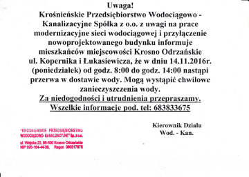 Uwaga! KrośnieńskiePrzedsiębiorstwo Wodociągowo Kanalizacyjne Spółka z o.o. z uwagi na prace modernizacyjne sieci wodociągowej i przyłączenie nowoproj ektowanego budynku informuj e mieszkańców miejscorvości Krosno Odrzańskie ul. Kopernika i Łukasiewi cza,) że w dniu 14.11.2016r. (poniedziałek) od godz.8:00 do godz. 14:00 nastąpi przerwa w dostawie wody. Mogą wystąpić chwilowe zanieczy szcze nia wo dy. za niedogodnościi utrudnienia przepraszamv. Wszelkie informacie pod. tel: 683833675 "KRO§NlElt§KlE PRzED§lĘBlOR§Illtl ilODOClĄ@U$ l$ilAtlZtCYJilP S. t ąa XfotmOfiafrłh i||P926-r8+łłłp.Rtst fiO0r?§il d. ttlbfilo 23, 86.fin kierownik Działu 'Wod. Kan.