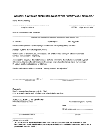 WNIOSEK O WYDANIE DUPLIKATU ŚWIADECTWA / LEGITYMACJI SZKOLNEJ1 Dane wnioskodawcy ................................................................... ................................................. /imię i nazwisko/ /PESEL i miejsce urodzenia/ Adres do korespondencji i dane kontaktowe .......................................................................................................................................................................................................................................................................................... /ulica/ numer domu/ numer mieszkania, miejscowość, telefon stacjonarny, telefon komórkowy/, klasa/ W związku z ......................................... ........ wydanego w ......... ......... roku oryginału: świadectwa dojrzałości / promocyjnego / ukończenia szkoły / legitymacji szkolnej1 proszę o wydanie duplikatu tego dokumentu Oświadczam, że znana mi jest, wynikająca z art. 272 Kodeksu Karnego2, odpowiedzialność karna za poświadczenie nieprawdy. Jednocześnie przyjmuję do wiadomości, że z chwilą otrzymania duplikatu traci ważność oryginał dokumentu. W przypadku odnalezienia utraconego oryginału zobowiązuję się do zwrócenia go IX Liceum Ogólnokształcącemu w Gdańsku. Duplikat dokumentu odbiorę osobiście / proszę przesłać na mój adres.1 .............................................. . 200 ... r. //miejscowość, data// .................................................................................... / podpis wnioskodawcy/ Załącznik: Dowód wniesienia opłaty w wysokości 26 zł / 9 zł w wypadku legitymacji szkolnej (oraz zdjęcie legitymacyjne). ADNOTACJE IX LO W GDAŃSKU Potwierdzam odbiór duplikatu Data ............................................... Potwierdzenie wysłania duplikatu Data ...................................................... Nr listu poleconego ..................................... ....................................................................... /podpis wnioskodawcy/ 1 2 ...................................................................... /podpis/ niepotrzebne skreślić Art. 272 KK - Kto wyłudza poświadczenie nieprawdy poprzez podstępne wprowadzenie w błąd funkcjonariusza publicznego lub innej osoby upoważnionej do wystawienia dokumentu, podlega karze pozbawienie wolności do lat 3.