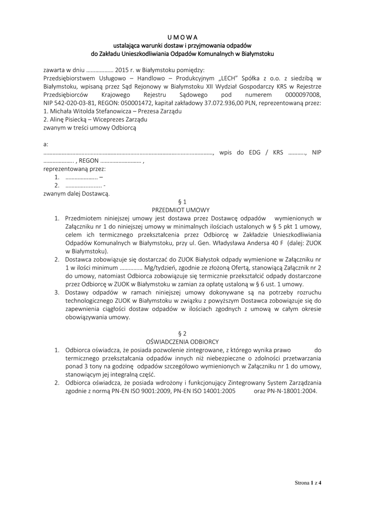 UMOWA ustalająca warunki dostaw i przyjmowania odpadów do Zakładu Unieszkodliwiania Odpadów Komunalnych w Białymstoku zawarta w dniu ……………… 2015 r. w Białymstoku pomiędzy: Przedsiębiorstwem Usługowo – Handlowo – Produkcyjnym „LECH” Spółka z o.o. z siedzibą w Białymstoku, wpisaną przez Sąd Rejonowy w Białymstoku XII Wydział Gospodarczy KRS w Rejestrze Przedsiębiorców Krajowego Rejestru Sądowego pod numerem 0000097008, NIP 542-020-03-81, REGON: 050001472, kapitał zakładowy 37.072.936,00 PLN, reprezentowaną przez: 1. Michała Witolda Stefanowicza – Prezesa Zarządu 2. Alinę Pisiecką – Wiceprezes Zarządu zwanym w treści umowy Odbiorcą a: …………………………………………………………………………………………………, wpis do EDG / KRS ……….., NIP ……………….. , REGON ……………………… , reprezentowaną przez: 1. ………………... – 2. …………........... zwanym dalej Dostawcą. §1 PRZEDMIOT UMOWY 1. Przedmiotem niniejszej umowy jest dostawa przez Dostawcę odpadów wymienionych w Załączniku nr 1 do niniejszej umowy w minimalnych ilościach ustalonych w § 5 pkt 1 umowy, celem ich termicznego przekształcenia przez Odbiorcę w Zakładzie Unieszkodliwiania Odpadów Komunalnych w Białymstoku, przy ul. Gen. Władysława Andersa 40 F (dalej: ZUOK w Białymstoku). 2. Dostawca zobowiązuje się dostarczać do ZUOK Białystok odpady wymienione w Załączniku nr 1 w ilości minimum …………… Mg/tydzień, zgodnie ze złożoną Ofertą, stanowiącą Załącznik nr 2 do umowy, natomiast Odbiorca zobowiązuje się termicznie przekształcić odpady dostarczone przez Odbiorcę w ZUOK w Białymstoku w zamian za opłatę ustaloną w § 6 ust. 1 umowy. 3. Dostawy odpadów w ramach niniejszej umowy dokonywane są na potrzeby rozruchu technologicznego ZUOK w Białymstoku w związku z powyższym Dostawca zobowiązuje się do zapewnienia ciągłości dostaw odpadów w ilościach zgodnych z umową w całym okresie obowiązywania umowy. §2 OŚWIADCZENIA ODBIORCY 1. Odbiorca oświadcza, że posiada pozwolenie zintegrowane, z którego wynika prawo do termicznego przekształcania odpadów innych niż niebezpieczne o zdolności przetwarzania ponad 3 tony na godzinę odpadów szczegółowo wymienionych w Załączniku nr 1 do umowy, stanowiącym jej integralną część. 2. Odbiorca oświadcza, że posiada wdrożony i funkcjonujący Zintegrowany System Zarządzania zgodnie z normą PN-EN ISO 9001:2009, PN-EN ISO 14001:2005 oraz PN-N-18001:2004. Strona 1 z 4 1. 2. 3. 4. 5. §3 OŚWIADCZENIA DOSTAWCY Dostawca oświadcza, że posiada zezwolenia właściwych organów na gospodarowanie odpadami, które będą dostarczane do ZUOK w Białymstoku w zakresie transportu odpadów. Dostawca oświadcza, że ponosi pełną odpowiedzialność za transport odpadów zgodnie z obowiązującymi wymaganiami w zakresie ochrony środowiska oraz bezpieczeństwa życia i zdrowia ludzi. Dostawca przyjmuje do wiadomości, że odpadów niewymienionych w Załączniku nr 1 do umowy Odbiorca nie będzie przyjmował oraz, że Odbiorca ma prawo odmówić przyjęcia większej ilości odpadów, niż maksymalnie ………. Mg/tydzień, wskazanych w Ofercie Dostawcy, stanowiącej Załącznik nr 2 umowy. Dostawca przyjmuje do wiadomości, że Odbiorca może odmówić przyjęcia lub wstrzymać czasowo przyjmowanie odpadów w ramach niniejszej umowy bez jakichkolwiek skutków prawnych i/lub finansowych dla Zamawiającego, w przypadku wystąpienia: a) konieczności zatrzymania instalacji, w szczególności w celu niezbędnych regulacji, zmian i poprawek, b) awarii instalacji, c) wahania wartości opałowej dostarczanych odpadów, d) siły wyższej. Z uwagi na postanowienia § 2 umowy, w zakresie współpracy z Odbiorcą, Dostawca zobowiązuje się do przestrzegania przepisów prawa dotyczących ochrony środowiska oraz bezpieczeństwa i higieny pracy. §4 OBOWIĄZKI ODBIORCY Odbiorca zobowiązuje się do: 1/ Przyjmowania odpadów we wszystkie dni robocze od poniedziałku do piątku w godzinach: od 6.00 do 22.00, przy czym godzina 21.30 jest ostatnią możliwą godziną wjazdu do ZUOK w Białymstoku, oraz w soboty w godzinach od 7.00 do 15.00 , przy czym godzina 14:30 jest ostatnią możliwą godziną wjazdu do ZUOK w Białymstoku, w uzasadnionych i uzgodnionych pomiędzy Stronami przypadkach, możliwe jest ustalenie innych godzin przyjęcia odpadów, 2/ Zapewnienia sprawnego systemu ważenia i klasyfikowania odpadów dostarczonych przez Dostawcę, 3/ Przygotowania i wskazania Dostawcy miejsca przeznaczonego do wyładunku odpadów, 4/ Pisemnego potwierdzenia przyjęcia odpadów od Dostawcy na miesięcznej karcie przekazania odpadów (KPO) wystawionej przez Dostawcę, wystawienia dokumentów księgowych, tj. faktury VAT w ostatnim dniu miesiąca na podstawie dokumentów wagowych zawierających rodzaj, kod i ilość dostarczanych odpadów w danym miesiącu, 5/ Zapewnienia utwardzonego dojazdu do miejsca wyładunku odpadów i placu manewrowego, na którym Dostawca będzie mógł dokonywać manewrów związanych z dojazdem i wyładunkiem zgodnie z zasadami bezpieczeństwa i wymogami przepisów ruchu drogowego, 6/ Właściwego oznaczenia dróg wewnętrznych i technologicznych na terenie ZUOK w Białymstoku, 7/ Zapewnienia dezynfekcji kół pojazdów opuszczających ZUOK w Białymstoku. §5 OBOWIĄZKI DOSTAWCY Dostawca zobowiązuje się do: 1/ Dostarczania odpadów wymienionych w Załączniku nr 1 w ilości minimum ……………Mg/tydzień, zgodnie ze złożoną Ofertą, stanowiącą Załącznik nr 2 do umowy, 2/ Przedłożenia do ZOUK w Białymstoku, nie później niż w dniu pierwszej dostawy odpadów, wykazu posiadanych pojazdów, które dostarczać będą odpady, z wyszczególnieniem marki, numeru rejestracyjnego oraz ewentualnie numeru bocznego, Strona 2 z 4 3/ Powiadomienia pisemnego Odbiorcy o każdym przypadku dostarczenia odpadów