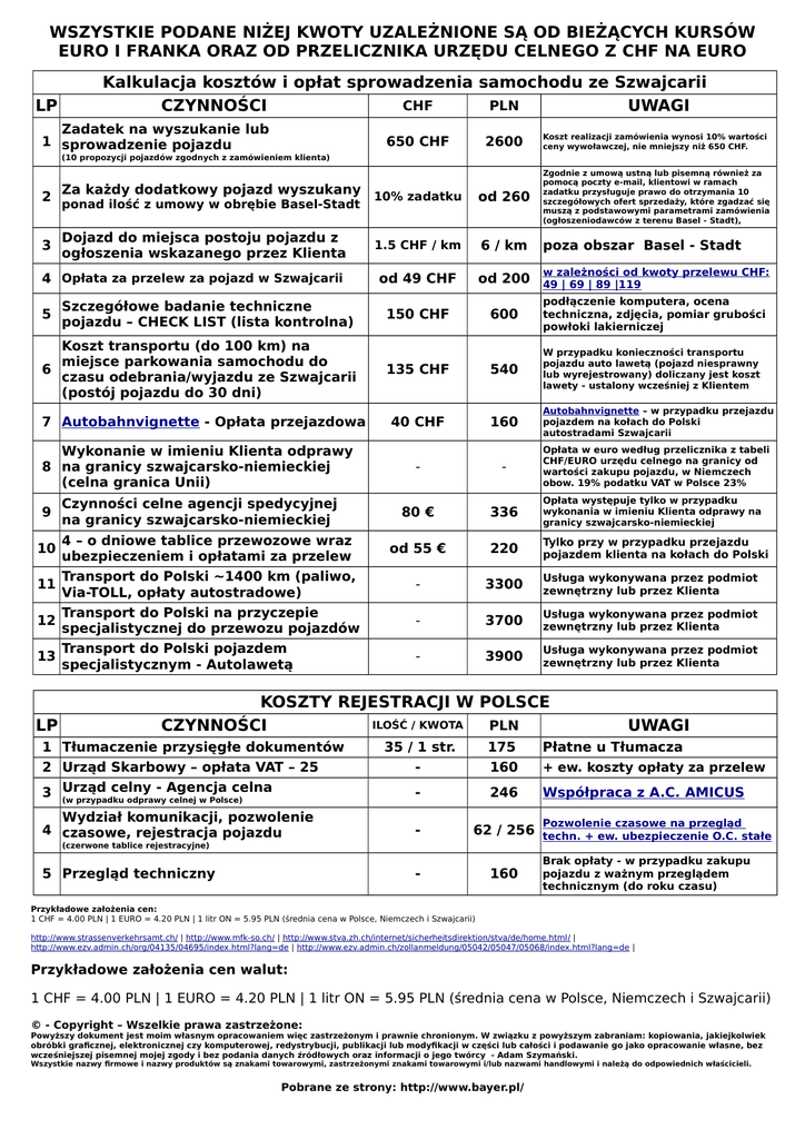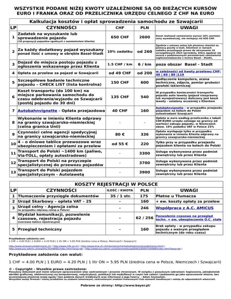 WSZYSTKIE PODANE NIŻEJ KWOTY UZALEŻNIONE SĄ OD BIEŻĄCYCH KURSÓW EURO I FRANKA ORAZ OD PRZELICZNIKA URZĘDU CELNEGO Z CHF NA EURO LP Kalkulacja kosztów i opłat sprowadzenia samochodu ze Szwajcarii CHF PLN CZYNNOŚCI UWAGI Zadatek na wyszukanie lub 1 sprowadzenie pojazdu 650 CHF 2600 Koszt realizacji zamówienia wynosi 10% wartości ceny wywoławczej, nie mniejszy niż 650 CHF. od 260 Zgodnie z umową ustną lub pisemną również za pomocą poczty e-mail, klientowi w ramach zadatku przysługuje prawo do otrzymania 10 szczegółowych ofert sprzedaży, które zgadzać się muszą z podstawowymi parametrami zamówienia (ogłoszeniodawców z terenu Basel - Stadt), (10 propozycji pojazdów zgodnych z zamówieniem klienta) Za każdy dodatkowy pojazd wyszukany 10% zadatku 2 ponad ilość z umowy w obrębie Basel-Stadt 3 Dojazd do miejsca postoju pojazdu z ogłoszenia wskazanego przez Klienta 4 Opłata za przelew za pojazd w Szwajcarii 5 Szczegółowe badanie techniczne pojazdu – CHECK LIST (lista kontrolna) Koszt transportu (do 100 km) na miejsce parkowania samochodu do 6 czasu odebrania/wyjazdu ze Szwajcarii (postój pojazdu do 30 dni) 7 Autobahnvignette - Opłata przejazdowa 1.5 CHF / km 6 / km poza obszar Basel - Stadt od 49 CHF od 200 w zależności od kwoty przelewu CHF: 49 | 69 | 89 |119 150 CHF 600 podłączenie komputera, ocena techniczna, zdjęcia, pomiar grubości powłoki lakierniczej 135 CHF 540 W przypadku konieczności transportu pojazdu auto lawetą (pojazd niesprawny lub wyrejestrowany) doliczany jest koszt lawety - ustalony wcześniej z Klientem 40 CHF 160 Autobahnvignette – w przypadku przejazdu pojazdem na kołach do Polski autostradami Szwajcarii Opłata w euro według przelicznika z tabeli CHF/EURO urzędu celnego na granicy od wartości zakupu pojazdu, w Niemczech obow. 19% podatku VAT w Polsce 23% Wykonanie w imieniu Klienta odprawy 8 na granicy szwajcarsko-niemieckiej (celna granica Unii) - - Czynności celne agencji spedycyjnej na granicy szwajcarsko-niemieckiej 80 € 336 Opłata występuje tylko w przypadku wykonania w imieniu Klienta odprawy na granicy szwajcarsko-niemieckiej od 55 € 220 Tylko przy w przypadku przejazdu pojazdem klienta na kołach do Polski - 3300 Usługa wykonywana przez podmiot zewnętrzny lub przez Klienta - 3700 Usługa wykonywana przez podmiot zewnętrzny lub przez Klienta - 3900 Usługa wykonywana przez podmiot zewnętrzny lub przez Klienta 9 4 – o dniowe tablice przewozowe wraz ubezpieczeniem i opłatami za przelew Transport do Polski ~1400 km (paliwo, 11 Via-TOLL, opłaty autostradowe) Transport do Polski na przyczepie 12 specjalistycznej do przewozu pojazdów Transport do Polski pojazdem 13 specjalistycznym - Autolawetą 10 LP KOSZTY REJESTRACJI W POLSCE ILOŚĆ / KWOTA PLN CZYNNOŚCI 1 Tłumaczenie przysięgłe dokumentów 2 Urząd Skarbowy – opłata VAT – 25 3 Urząd celny - Agencja celna (w przypadku odprawy celnej w Polsce) Wydział komunikacji, pozwolenie 4 czasowe, rejestracja pojazdu 35 / 1 str. - 175 160 Płatne u Tłumacza - 246 Współpraca z A.C. AMICUS - 62 / 256 - 160 (czerwone tablice rejestracyjne) 5 Przegląd techniczny UWAGI + ew. koszty opłaty za przelew Pozwolenie czasowe na przegląd techn. + ew. ubezpieczenie O.C. stałe Brak opłaty - w przypadku zakupu pojazdu z ważnym przeglądem technicznym (do roku czasu) Przykładowe założenia cen: 1 CHF = 4.00 PLN | 1 EURO = 4.20 PLN | 1 litr ON = 5.95 PLN (średnia cena w Polsce, Niemczech i Szwajcarii) http://www.strassenverkehrsamt.ch/ | http://www.mfk-so.ch/ | http://www.stva.zh.ch/internet/sicherheitsdirektion/stva/de/home.html / | http://www.ezv.admin.ch/org/04135/04695/index.html?lang=de | http://www.ezv.admin.ch/zollanmeldung/05042/05047/05068/index.html?lang=de | Przykładowe założenia cen walut: 1 CHF = 4.00 PLN | 1 EURO = 4.20 PLN | 1 litr ON = 5.95 PLN (średnia cena w Polsce, Niemczech i Szwajcarii) © - Copyright – Wszelkie prawa zastrzeżone: Powyższy dokument jest moim własnym opracowaniem więc zastrzeżonym i prawnie chronionym. W związku z powyższym zabraniam: kopiowania, jakiejkolwiek obróbki graficznej, elektronicznej czy komputerowej, redystrybucji, publikacji lub modyfikacji w części lub całości i podawanie go jako opracowanie własne, bez wcześniejszej pisemnej mojej zgody i bez podania danych źródłowych oraz informacji o jego twórcy - Adam Szymański. Wszystkie nazwy firmowe i nazwy produktów są znakami towarowymi, zastrzeżonymi znakami towarowymi i/lub nazwami handlowymi i należą do odpowiednich właścicieli. Pobrane ze strony: http://www.bayer.pl/