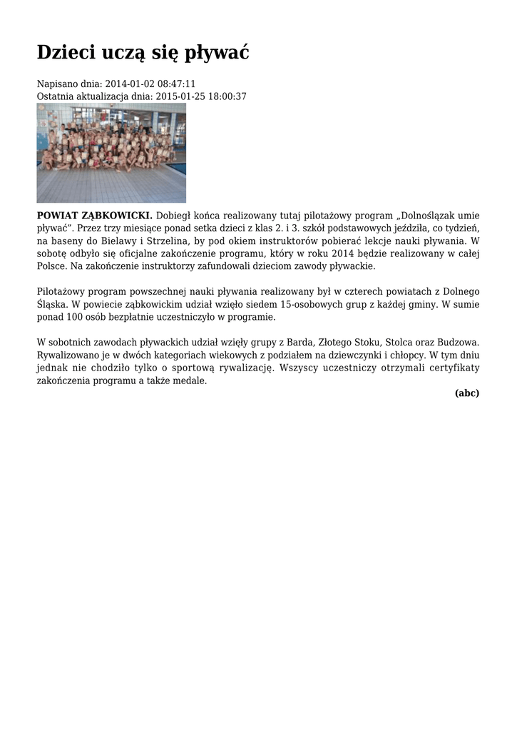 Dzieci uczą się pływać Napisano dnia: 2014-01-02 08:47:11 Ostatnia aktualizacja dnia: 2015-01-25 18:00:37 POWIAT ZĄBKOWICKI. Dobiegł końca realizowany tutaj pilotażowy program „Dolnoślązak umie pływać”. Przez trzy miesiące ponad setka dzieci z klas 2. i 3. szkół podstawowych jeździła, co tydzień, na baseny do Bielawy i Strzelina, by pod okiem instruktorów pobierać lekcje nauki pływania. W sobotę odbyło się oficjalne zakończenie programu, który w roku 2014 będzie realizowany w całej Polsce. Na zakończenie instruktorzy zafundowali dzieciom zawody pływackie. Pilotażowy program powszechnej nauki pływania realizowany był w czterech powiatach z Dolnego Śląska. W powiecie ząbkowickim udział wzięło siedem 15-osobowych grup z każdej gminy. W sumie ponad 100 osób bezpłatnie uczestniczyło w programie. W sobotnich zawodach pływackich udział wzięły grupy z Barda, Złotego Stoku, Stolca oraz Budzowa. Rywalizowano je w dwóch kategoriach wiekowych z podziałem na dziewczynki i chłopcy. W tym dniu jednak nie chodziło tylko o sportową rywalizację. Wszyscy uczestniczy otrzymali certyfikaty zakończenia programu a także medale. (abc)