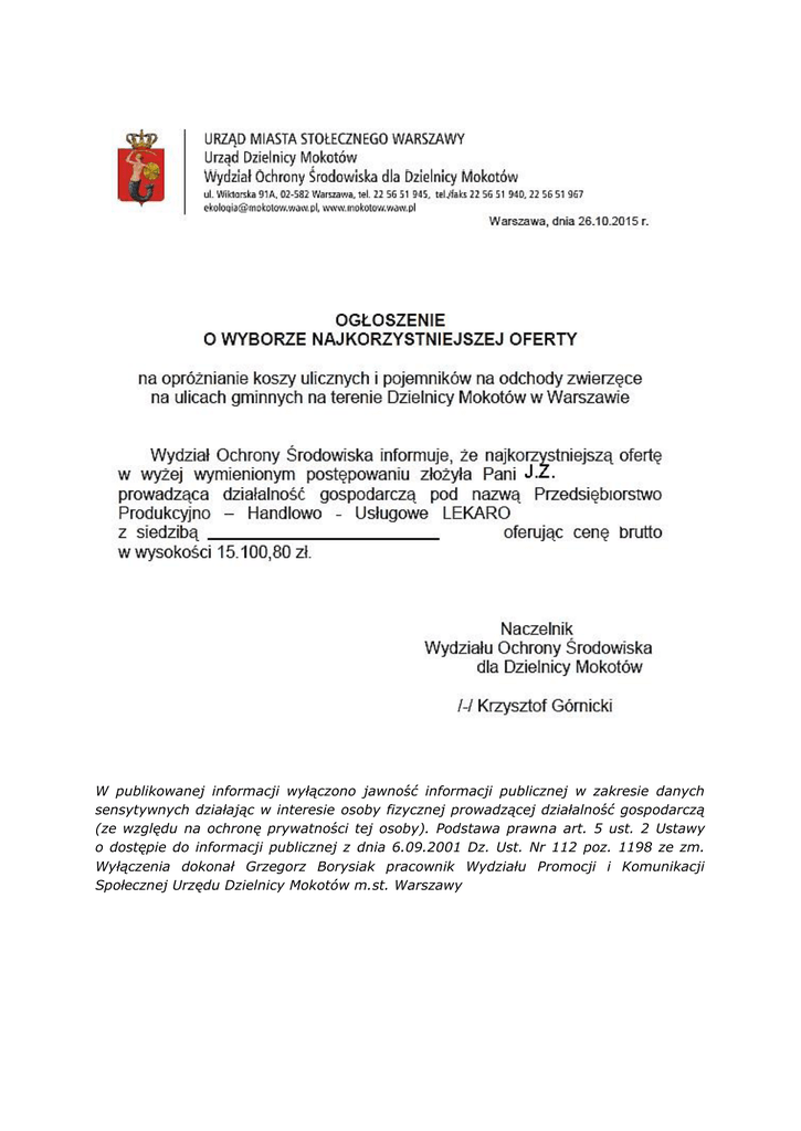 W publikowanej informacji wyłączono jawność informacji publicznej w zakresie danych sensytywnych działając w interesie osoby fizycznej prowadzącej działalność gospodarczą (ze względu na ochronę prywatności tej osoby). Podstawa prawna art. 5 ust. 2 Ustawy o dostępie do informacji publicznej z dnia 6.09.2001 Dz. Ust. Nr 112 poz. 1198 ze zm. Wyłączenia dokonał Grzegorz Borysiak pracownik Wydziału Promocji i Komunikacji Społecznej Urzędu Dzielnicy Mokotów m.st. Warszawy