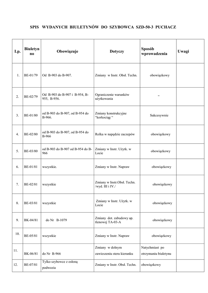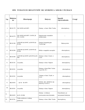 SPIS WYDANYCH BIULETYNÓW DO SZYBOWCA SZD-50