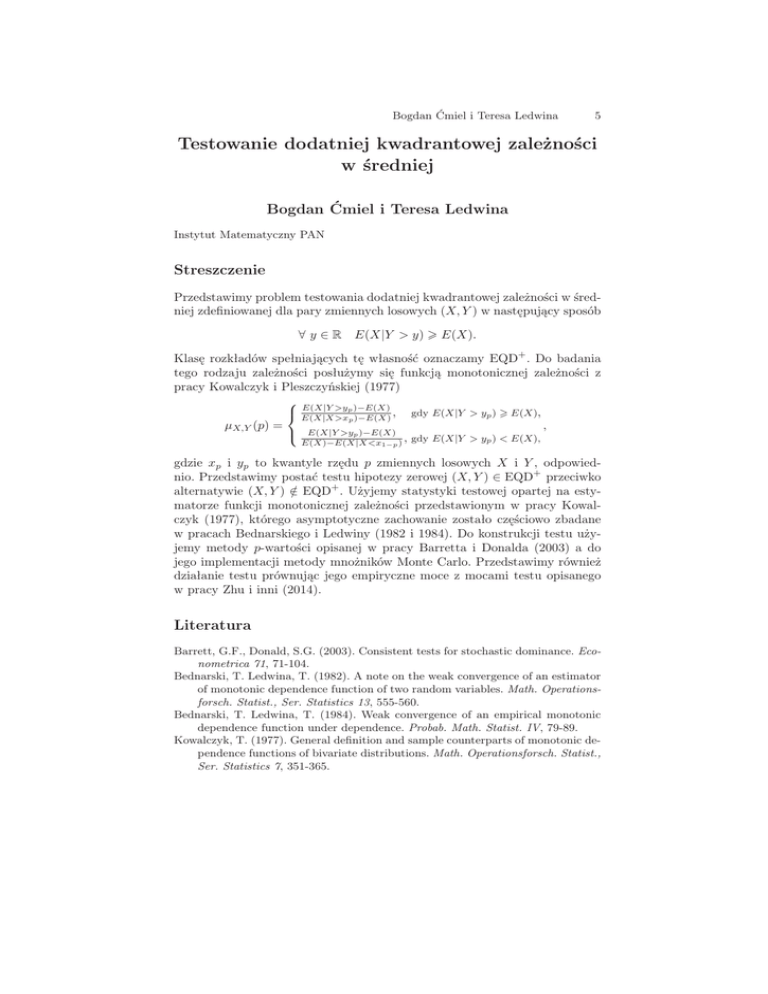 Bogdan Ćmiel i Teresa Ledwina 5 Testowanie dodatniej kwadrantowej zależności w średniej Bogdan Ćmiel i Teresa Ledwina Instytut Matematyczny PAN Streszczenie Przedstawimy problem testowania dodatniej kwadrantowej zależności w średniej zdefiniowanej dla pary zmiennych losowych (X, Y ) w następujący sposób ∀y∈R E(X|Y > y) ! E(X). Klasę rozkładów spełniających tę własność oznaczamy EQD+ . Do badania tego rodzaju zależności posłużymy się funkcją monotonicznej zależności z pracy Kowalczyk i Pleszczyńskiej (1977) E(X|Y >y )−E(X) E(X|X>xp )−E(X) , gdy E(X|Y > yp ) E(X), p , µX,Y (p) = E(X|Y >yp )−E(X) , gdy E(X|Y > y ) < E(X), p E(X)−E(X|X<x1−p ) gdzie xp i yp to kwantyle rzędu p zmiennych losowych X i Y , odpowiednio. Przedstawimy postać testu hipotezy zerowej (X, Y ) ∈ EQD+ przeciwko alternatywie (X, Y ) ∈ / EQD+ . Użyjemy statystyki testowej opartej na estymatorze funkcji monotonicznej zależności przedstawionym w pracy Kowalczyk (1977), którego asymptotyczne zachowanie zostało częściowo zbadane w pracach Bednarskiego i Ledwiny (1982 i 1984). Do konstrukcji testu użyjemy metody p-wartości opisanej w pracy Barretta i Donalda (2003) a do jego implementacji metody mnożników Monte Carlo. Przedstawimy również działanie testu prównując jego empiryczne moce z mocami testu opisanego w pracy Zhu i inni (2014). Literatura Barrett, G.F., Donald, S.G. (2003). Consistent tests for stochastic dominance. Econometrica 71, 71-104. Bednarski, T. Ledwina, T. (1982). A note on the weak convergence of an estimator of monotonic dependence function of two random variables. Math. Operationsforsch. Statist., Ser. Statistics 13, 555-560. Bednarski, T. Ledwina, T. (1984). Weak convergence of an empirical monotonic dependence function under dependence. Probab. Math. Statist. IV, 79-89. Kowalczyk, T. (1977). General definition and sample counterparts of monotonic dependence functions of bivariate distributions. Math. Operationsforsch. Statist., Ser. Statistics 7, 351-365. 6 Bogdan Ćmiel i Teresa Ledwina Kowalczyk, T. Pleszczyńska, E. (1977). Monotonic dependence functions of bivariate distributions. Ann. Statist. 5, 1221-1227. Zhu, X. Guo, X. Lin, L. Zhu, L. (2014). Testing for positive expectation dependence. Ann. Inst. Statist. Math., DOI 10.1007ś10463-014-0492-7.