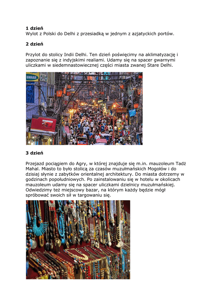 1 dzień Wylot z Polski do Delhi z przesiadką w jednym z azjatyckich portów. 2 dzień Przylot do stolicy Indii Delhi. Ten dzień poświęcimy na aklimatyzację i zapoznanie się z indyjskimi realiami. Udamy się na spacer gwarnymi uliczkami w siedemnastowiecznej części miasta zwanej Stare Delhi. 3 dzień Przejazd pociągiem do Agry, w której znajduje się m.in. mauzoleum Tadż Mahal. Miasto to było stolicą za czasów muzułmańskich Mogołów i do dzisiaj słynie z zabytków orientalnej architektury. Do miasta dotrzemy w godzinach popołudniowych. Po zainstalowaniu się w hotelu w okolicach mauzoleum udamy się na spacer uliczkami dzielnicy muzułmańskiej. Odwiedzimy też miejscowy bazar, na którym każdy będzie mógł spróbować swoich sił w targowaniu się. 4 dzień Udamy się na zwiedzanie słynnego mauzoleum Tadż Mahal. Wcześniej jednak o ile pogoda pozwoli, skoro świt wybierzemy się wzdłuż murów mauzoleum nad rzekę, przy której wznosi się cały kompleks. Stamtąd przepłyniemy łodzią na drugi brzeg aby z jego perspektywy podziwiać wschód słońca nad mauzoleum. Po porannej jodze i śniadaniu udamy się na zwiedzanie Tadż Mahal. Jest to kompleks wzniesiony w XVII wieku przez muzułmańskiego władcę Szahdźahana dla jego zmarłej żony Mumatz Mahal. Główną część złożenia stanowi jej marmurowy grobowiec, będący jedną z najokazalszych budowli Indii. Kolejnym wspaniałym zabytkiem jaki odwiedzimy tego dnia będzie Czerwony Fort. Jest to potężna budowla obronna wzniesiona w XVI wieku przez mogolskiego władcę Akbara Wielkiego. Fort ten stanowił główną twierdzę i siedzibę kolejnych władców z dynastii Wielkich Mogołów. Wieczorem opuścimy Agrę nocnym pociągiem, który zawiezie nas do Waranasi. 5-7 dzień W godzinach porannych dotrzemy do położonego nad Gangesem Waranasi, jednego z najstarszych i otaczanych największą czcią miast Indii. Spędzimy tam około trzech dni, zanurzając się w mistycznej atmosferze subkontynentu. Waranasi to miasto nieprzerwanie zamieszkałe od starożytności. Zatrzymamy się w jednym z tanich hoteli w starej części miasta nad Gangesem. Czas będziemy spędzać na spacerach w labiryncie wąskich uliczek, którymi zamiast samochodów przechadzają się krowy, a czas zatrzymał się kilkaset lat temu. Odwiedzimy jedną z licznych hinduistycznych świątyń, a w trakcie wędrówek wzdłuż Gangesu przyjrzymy się rytualnym kąpielom pielgrzymów. Jeden z poranków poświęcimy by przepłynąć się o wschodzie słońca łodzią po Gangesie. Z tej perspektywy będziemy mogli się lepiej przyjrzeć znakomitej architekturze licznych pałaców i świątyń Waranasi. Odwiedzimy także jedno z miejsce gdzie na drewnianych stosach zmarłych poddaje się rytualnej kremacji, a ich prochy wrzucane są do wód Gangesu. 8 dzień Wczesnym rankiem wyruszymy z Waranasi do pobliskiego Sarnath. To właśnie tu w VI wieku p.n.e. Budda wygłaszał swoje pierwsze nauki. W Sarnath spędzimy 2 dni odpoczywając od tłocznego i gwarnego Waranasi. Sarnath w ciągu stuleci stało się ważnym ośrodkiem myśli i sztuki buddyjskie, w którym działało kilkadziesiąt klasztorów buddyjskich. Odwiedzimy miejscowy kompleks buddyjski z Parkiem Jeleni, w którym znajdują się ruiny najstarszych stup buddyjskich, w tym stupa Dharamardźika upamiętniająca miejsce, w którym Budda wygłosił swoje pierwsze nauki. W parku znajduje się również Główna Świątynia, a okolica usiana jest licznymi stanowiskami archeologicznymi. Odwiedzimy również miejscowe muzeum z cennymi buddyjskimi antykami i znajdujące się poza głównym kompleksem świątynie różnych odłamów buddyzmu. 9 dzień W godzinach popołudniowych udamy się do Waranasi, skąd nocnym pociągiem pojedziemy do Riszikeszu 10-14 dzień Przyjazd do Riszikeszu, w którym spędzimy około 4/5 dni. Jest to niewielkie miasto będące popularnym celem pielgrzymek. Znajduje się nad brzegami Gangesu, w jego górnym biegu, u stóp Himalajów. Jest to uznane centrum jogi i medytacji z licznymi aszramami. To tutaj Beatlesi spotkali Maharisziego w 1968 roku. Czas spędzony w Riszikeszu spędzimy głównie na medytacji, zajęciach jogi i pieszych wędrówkach, w czasie których oddamy się kontemplacji górskiej przyrody. Odwiedzimy również najstarszą hinduistyczną świątynię w mieście Bharat Mandir z posągiem Wisznu wykonanym z czarnego kamienia pochodzący z IX wieku. 14/15 dzień Powrót pociągiem do Delhi gdzie spędzimy dwa ostatnie dni. Skupimy się na zwiedzaniu Starego Delhi, które to już pobieżnie zobaczyliśmy pierwszego dnia naszego pobytu. Odwiedzimy Dźama Masdźid, który jest największym meczetem Indii wzniesionym w XVII wieku. Następnie udamy się do średniowiecznej dzielnicy muzułmańskiej Nizamuddin w południowej części miasta. Wznosi się tam pośród ciasnych uliczek, pełnych bazarów jedno z najważniejszych sanktuariów Sufich, Hazarat Nizamuddin Darga. Postaramy się także odwiedzić Czerwony Fort będący jednym z najważniejszych zabytków Delhi. Wzniesiony przez mogolskich władców w XVII wieku posiada potężne fortyfikacje skrywające marmurowe pałace z wykwintnymi apartamentami, meczet i kunsztowne ogrody. Jeśli czas i siły nam pozwolą postaramy się również odwiedzić Muzeum Narodowe gromadzące najznakomitsze zabytki starożytnych Indii. Na koniec podsumujemy nasze refleksje na temat Indii i tego jak one i odbyte warsztaty wpłynęły na nas samych. 16 dzień Przylot do Polski i pożegnanie :) ----------------------------------------- SutraSerca.pl