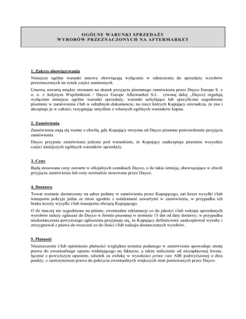 OGÓLNE WARUNKI SPRZEDAŻY WYROBÓW PRZEZNACZONYCH NA AFTERMARKET 1. Zakres obowiązywania Niniejsze ogólne warunki umowy obowiązują wyłącznie w odniesieniu do sprzedaży wyrobów przeznaczonych na rynek części zamiennych. Umowę zawartą między stronami na skutek przyjęcia pisemnego zamówienia przez Dayco Europe S. z o. o. z Jedynym Wspólnikiem / Dayco Europe Aftermarket S.L. (zwaną dalej „Dayco) regulują wyłącznie niniejsze ogólne warunki sprzedaży, warunki uchylające lub specyficzne uzgodnione pisemnie w zamówieniu i/lub w odrębnym dokumencie, na rzecz których Kupujący oświadcza, że zna i akceptuje je w całości, rezygnując umyślnie z własnych ogólnych warunków kupna. 2. Zamówienia Zamówienia stają się ważne z chwilą, gdy Kupujący otrzyma od Dayco pisemne potwierdzenie przyjęcia zamówienia. Dayco przyjmie zamówienia jedynie pod warunkiem, że Kupujący zaakceptuje pisemnie wszystkie części niniejszych ogólnych warunków sprzedaży. 3. Ceny Będą stosowane ceny zawarte w oficjalnych cennikach Dayco, o ile takie istnieją, obowiązujące w chwili przyjęcia zamówienia lub ceny normalnie stosowane przez Dayco. 4. Dostawa Towar zostanie dostarczony na adres podany w zamówieniu przez Kupującego, zaś koszt wysyłki i/lub transportu pokryje jedna ze stron zgodnie z ustaleniami zawartymi w zamówieniu, w przypadku ich braku koszty wysyłki i/lub transportu obciążą Kupującego. O ile inaczej nie uzgodniono na piśmie, ewentualne reklamacje co do jakości i/lub rodzaju sprzedanych wyrobów należy zgłaszać do Dayco w formie pisemnej w terminie 15 dni od daty dostawy; w przypadku niedostarczenia powyższego zgłoszenia przyjmuje się, że Kupujący definitywnie zaakceptował wyroby i zrezygnował z prawa do roszczeń co do ilości i/lub rodzaju dostarczonych wyrobów. 5. Płatność Nieuiszczenie i/lub opóźnienie płatności względem terminu podanego w zamówieniu spowoduje utratę prawa do ewentualnego opustu widniejącego na fakturze, a także naliczenie od niezapłaconej kwoty, łącznie z powyższym opustem, odsetek za zwłokę w wysokości prime rate ABI podwyższonej o dwa punkty, z zastrzeżeniem prawa do pokrycia ewentualnych większych strat poniesionych przez Dayco. 6. Gwarancja Gwarancja na wyroby Dayco udzielana jest na okres dwóch lat od daty ich montażu. W przypadku stwierdzenia fabrycznej wady wyrobu, Dayco pozostawia sobie swobodę decyzji co do zwrotu ceny sprzedaży lub wymiany wyrobu w odpowiednim terminie. Dayco ponosi koszt wysyłki i montażu nowego wyrobu przeznaczonego na wymianę z wyłączeniem wszelkich innych roszczeń do odszkodowania. Gwarancja nie będzie udzielana, jeżeli: - wada wynika z normalnego zużycia podczas eksploatacji wyrobu zgodnej z przeznaczeniem, po przebiegu określonym przez producenta samochodu i pod warunkiem, że współdziałające ruchome elementy przekazywania mocy znajdują się w normalnych warunkach działania; lub - inne elementy przekazywania mocy w samochodzie w wyniku niewystarczającej lub niewłaściwej konserwacji spowodowały zaistnienie wady wyrobu; lub - wyrób został użyty nieprzepisowo, tzn. nie został zamontowany w modelu/modelach silnika wskazanym/wskazanych w katalogu lub został zamontowany w silnikach wyścigowych itp.; lub - wyrób został zamontowany niezgodnie z zaleceniami konstruktora samochodu co do specyficznego modelu i/lub niezgodnie z dołączoną do wyrobu instrukcją Dayco; lub - wyrób nie był właściwie przechowywany, transportowany lub obsługiwany; lub - zaistniał wypadek drogowy. W terminie dwóch miesięcy od daty stwierdzenia wady zgodności sprzedawca lub instalator, oprócz przesłania do Dayco wadliwego wyrobu oraz zezwolenia na oględziny przez techników firmy, powinien na piśmie przesłać do Dayco następujące informacje: - typ/kod wyrobu; - datę montażu wyrobu, przebieg samochodu w momencie montażu wyrobu i w momencie wystąpienia wady; - dane samochodu (model, pojemność skokową silnika, kod silnika, rok produkcji); - dokumenty stwierdzające kupno wyrobu (fakturę lub paragon); - nazwisko i adres użytkownika końcowego; - opis napotkanej wady; - anomalię zasygnalizowaną przez klienta końcowego. W razie gdy sprzedawca końcowy lub instalator nie wyślą w wyżej wymienionym terminie wymaganej dokumentacji i/lub informacji zgodnie z ustępem poprzednim, niniejsza gwarancja utraci ważność i w konsekwencji Dayco nie będzie ponosić żadnej odpowiedzialności za stwierdzoną wadę. 7. Prawa własności intelektualnej i własności przemysłowej Jeżeli wyroby wraz z ich opakowaniami dostarczone Kupującemu oznakowane są znakiem Dayco lub innym znakiem prawnie używanym przez Dayco, Kupujący nie może tego znaku usunąć lub zetrzeć. Kupujący oświadcza, że nie posiada żadnego prawa do znaku Dayco, jak również do informacji technicznych i handlowych dotyczących sprzedaży wyrobów ewentualnie dostarczonych mu przez Dayco, takich jak, przykładowo, rysunki, katalogi, dokumentacja techniczna i handlowa. 2 Kupujący nie będzie używał znaków towarowych lub wyróżniających, które mogłyby się pomylić ze znakami towarowymi lub wyróżniającymi używanymi przez Dayco. 8. Poufność O ile nie uzgodniono inaczej na piśmie, Kupujący zobowiązuje się do traktowania jako “Poufne” wszystkich informacji technicznych, handlowych lub innego rodzaju, otrzymanych podczas realizacji zamówienia. W szczególności będą uważane za Poufne wszystkie informacje techniczne dotyczące wyrobów sprzedawanych Kupującemu. Będą również uważane za Poufne wszelkie informacje tak określone przez Dayco w formie pisemnego oświadczenia równoczesnego lub przesłanego Kupującemu w ciągu 30 dni po ich zakomunikowaniu przez Dayco, w ciągu tego czasu informacje dostarczone Kupującemu będą czasowo Poufne. Kupujący zobowiąże się do zachowania w poufności i, co za tym idzie, do nieudostępniania osobom trzecim Inf