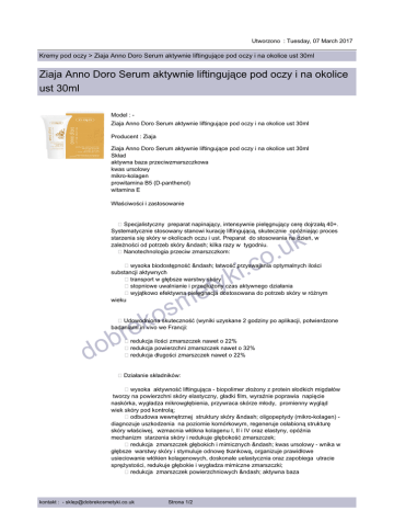 Utworzono : Tuesday, 07 March 2017 Kremy pod oczy > Ziaja Anno Doro Serum aktywnie liftingujące pod oczy i na okolice ust 30ml Ziaja Anno Doro Serum aktywnie liftingujące pod oczy i na okolice ust 30ml Model : Ziaja Anno Doro Serum aktywnie liftingujące pod oczy i na okolice ust 30ml Producent : Ziaja Ziaja Anno Doro Serum aktywnie liftingujące pod oczy i na okolice ust 30ml Skład aktywna baza przeciwzmarszczkowa kwas ursolowy mikro-kolagen prowitamina B5 (D-panthenol) witamina E Właściwości i zastosowanie Specjalistyczny preparat napinający, intensywnie pielęgnujący cerę dojrzałą 40+. Systematycznie stosowany stanowi kurację liftingującą, skutecznie opóźniając proces starzenia się skóry w okolicach oczu i ust. Preparat do stosowania na dzień, w zależności od potrzeb skóry – kilka razy w tygodniu. Nanotechnologia przeciw zmarszczkom: k u . o c . i k wysoka biodostępność – łatwość przyswajania optymalnych ilości substancji aktywnych transport w głębsze warstwy skóry stopniowe uwalnianie i przedłużony czas aktywnego działania wyjątkowo efektywna pielęgnacja dostosowana do potrzeb skóry w różnym wieku y t e m s o k e br Udowodniona skuteczność (wyniki uzyskane 2 godziny po aplikacji, potwierdzone badaniami in vivo we Francji: do redukcja ilości zmarszczek nawet o 22% redukcja powierzchni zmarszczek nawet o 32% redukcja długości zmarszczek nawet o 22% Działanie składników: wysoka aktywność liftingująca - biopolimer złożony z protein słodkich migdałów tworzy na powierzchni skóry elastyczny, gładki film, wyraźnie poprawia napięcie naskórka, wygładza mikrowgłębienia, przywraca skórze młody, promienny wygląd wiek skóry pod kontrolą; odbudowa wewnętrznej struktury skóry – oligopeptydy (mikro-kolagen) diagnozuje uszkodzenia na poziomie komórkowym, regeneruje osłabioną strukturę skóry właściwej, wzmacnia włókna kolagenu I, II i IV oraz elastyny, opóźnia mechanizm starzenia skóry i redukuje głębokość zmarszczek; redukcja zmarszczek głębokich i mimicznych – kwas ursolowy - wnika w głębsze warstwy skóry i stymuluje odnowę tkankową, organizuje prawidłowe usieciowanie włókien kolagenowych, doskonale uelastycznia oraz zapobiega utracie sprężystości, redukuje głębokie i wygładza mimiczne zmarszczki; redukcja zmarszczek powierzchniowych – aktywna baza kontakt : - [email protected] Strona 1/2 Utworzono : Tuesday, 07 March 2017 Kremy pod oczy > Ziaja Anno Doro Serum aktywnie liftingujące pod oczy i na okolice ust 30ml Ziaja Anno Doro Serum aktywnie liftingujące pod oczy i na okolice ust 30ml przeciwzmarszczkowa - aktywuje stymulację glikanów, kolagenu i elastyny, wypełnia uszkodzenia spoiwa międzykomórkowego, wzmacnia spoistość tkanki łącznej i spłyca powierzchniowe zmarszczki suplementacja - witamina E, prowitamina B5, neutralizuje wolne rodniki oraz doskonale wygładza i uelastycznia skórę, intensywnie i trwale nawilża oraz zapobiega przesuszaniu naskórka, łagodzi podrażnienia, działa kojąco i osłaniająco na wrażliwą skórę. Stosowanie Na oczyszczoną skórę okolic oczu i ust nanieść cienką warstwę preparatu, pozostawić do wchłonięcia. Dodatkowo można wcześniej użyć anno d’oro krem liftingujący + UV. W takim przypadku należy poczekać do całkowitego wchłonięcia kremu i nałożyć serum. Do codziennej pielęgnacji stosować anno d’oro krem liftingujący pod oczy i na okolice ust. Cena : GBP 3.65 y t e k u . o c . i k Dostępność: Produkt dostępny w naszym sklepie od Thursday, 01 December 2016 m s o k e br do kontakt : - [email protected] Strona 2/2