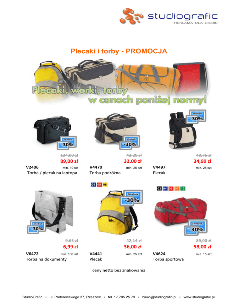 Plecaki i torby - PROMOCJA 134,00 zł 43,20 zł 48,76 zł 89,00 zł 32,00 zł 34,90 zł V2406 min. 10 szt Torba / plecak na laptopa V4470 Torba podróżna min. 25 szt V4497 Plecak min. 25 szt 9,63 zł 42,14 zł 89,00 zł 6,99 zł 36,00 zł 58,00 zł V6472 min. 100 szt Torba na dokumenty V4441 Plecak min. 25 szt V4624 Torba sportowa min. 15 szt ceny netto bez znakowania StudioGrafic ▪ ul. Paderewskiego 37, Rzeszów ▪ tel. 17 785 25 79 ▪ [email protected] ▪ www.studiografic.pl Plecaki i torby - PROMOCJA V4670 Plecak 79,90 zł 99,35 zł 12,95 zł 49,00 zł 59,85 zł 8,15 zł min. 15 szt V4671 Plecak min. 15 szt V4678 Worek ze sznurkiem min. 100 szt dodatkowo RABAT 30% na nadruk (sitodruk lub termotransfer) ceny netto bez znakowania StudioGrafic ▪ ul. Paderewskiego 37, Rzeszów ▪ tel. 17 785 25 79 ▪ [email protected] ▪ www.studiografic.pl