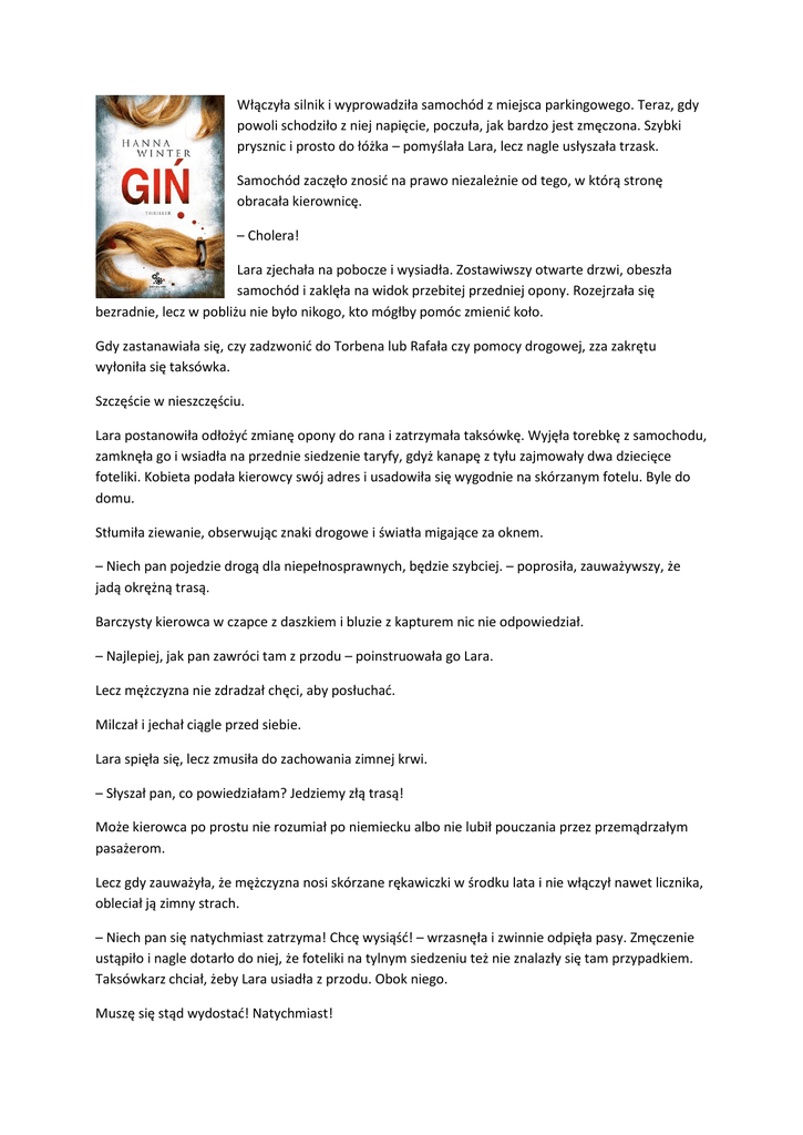 Włączyła silnik i wyprowadziła samochód z miejsca parkingowego. Teraz, gdy powoli schodziło z niej napięcie, poczuła, jak bardzo jest zmęczona. Szybki prysznic i prosto do łóżka – pomyślała Lara, lecz nagle usłyszała trzask. Samochód zaczęło znosić na prawo niezależnie od tego, w którą stronę obracała kierownicę. – Cholera! Lara zjechała na pobocze i wysiadła. Zostawiwszy otwarte drzwi, obeszła samochód i zaklęła na widok przebitej przedniej opony. Rozejrzała się bezradnie, lecz w pobliżu nie było nikogo, kto mógłby pomóc zmienić koło. Gdy zastanawiała się, czy zadzwonić do Torbena lub Rafała czy pomocy drogowej, zza zakrętu wyłoniła się taksówka. Szczęście w nieszczęściu. Lara postanowiła odłożyć zmianę opony do rana i zatrzymała taksówkę. Wyjęła torebkę z samochodu, zamknęła go i wsiadła na przednie siedzenie taryfy, gdyż kanapę z tyłu zajmowały dwa dziecięce foteliki. Kobieta podała kierowcy swój adres i usadowiła się wygodnie na skórzanym fotelu. Byle do domu. Stłumiła ziewanie, obserwując znaki drogowe i światła migające za oknem. – Niech pan pojedzie drogą dla niepełnosprawnych, będzie szybciej. – poprosiła, zauważywszy, że jadą okrężną trasą. Barczysty kierowca w czapce z daszkiem i bluzie z kapturem nic nie odpowiedział. – Najlepiej, jak pan zawróci tam z przodu – poinstruowała go Lara. Lecz mężczyzna nie zdradzał chęci, aby posłuchać. Milczał i jechał ciągle przed siebie. Lara spięła się, lecz zmusiła do zachowania zimnej krwi. – Słyszał pan, co powiedziałam? Jedziemy złą trasą! Może kierowca po prostu nie rozumiał po niemiecku albo nie lubił pouczania przez przemądrzałym pasażerom. Lecz gdy zauważyła, że mężczyzna nosi skórzane rękawiczki w środku lata i nie włączył nawet licznika, obleciał ją zimny strach. – Niech pan się natychmiast zatrzyma! Chcę wysiąść! – wrzasnęła i zwinnie odpięła pasy. Zmęczenie ustąpiło i nagle dotarło do niej, że foteliki na tylnym siedzeniu też nie znalazły się tam przypadkiem. Taksówkarz chciał, żeby Lara usiadła z przodu. Obok niego. Muszę się stąd wydostać! Natychmiast! W panice zaczęła szarpać za drzwi. Cholera, zamknięte. – Kazałam ci się ZATRZYMAĆ! Nawet na nią nie spojrzał. Nie powiedział ani słowa. Nie wykonał żadnego gestu. Nic. Nagle skręcił w nierówną szosę prowadzącą na teren starej stoczni. Całkowita izolacja. Nie było tam nawet latarni ulicznych. Tylko ciemność. Serce Lary zaczęło walić jak szalone. Tu na odludziu nikt nie usłyszy jej krzyków. Nikt nie przyjdzie z pomocą. Wnętrze taksówki nagle wydało się kobiecie ciasne i przytłaczające. W dłoniach ściskała torebkę, myśląc o zmasakrowanych ciałach kobiet, o których opowiadał jej Torben. Torben! Paralizator! – Co… Czego pan ode mnie chce? – gdy tylko wypowiedziała te słowa, mężczyzna zwolnił. Sięgnął do schowka na drzwiach i nagle Lara poczuła nóż przy gardle. – Jeden pisk i… – szepnął mężczyzna z przejęciem – po tobie! Ani drgnęła. Bała się nawet odetchnąć. Jechali teraz wolno, wdzierając się coraz głębiej w ciemność starego portu. I nagle samochód się zatrzymał. Zgasły przednie światła i zapadł mrok. W głowie Lary kłębiło się tysiące myśli, podczas gdy ręka zanurzała się coraz głębiej w otchłań torebki. Teraz! – krzyknęła kobieta w duchu i odchyliwszy się wyciągnęła paralizator. Już miała przepuścić sto tysięcy woltów przez ciało napastnika, lecz mężczyzna wbił jej nóż w ramię. Lara krzyknęła z bólu, gdy ostrze przeszło przez miękką skórę. Ostatkiem sił udało jej się wbić mu paralizator w bok. W mroku rozbłysły iskry, a oprawca puścił broń i zwinął się konwulsyjnie. Lara szarpała klamkę z całej siły lecz wszystko na nic. Serce waliło jej jak szalone, gdy obejrzała się na skulonego mężczyznę. Nie była pewna, czy naprawdę stracił przytomność, lecz jedyna droga ucieczki z tej przeklętej taksówki prowadziła właśnie koło niego. Cholera, gdzie jego nóż? Lara panicznie rozglądała się po kabinie, lecz w samochodzie było zbyt ciemno, by cokolwiek dojrzeć. Zebrała się na odwagę i spróbowała przedostać przez jego kolana, w ręku wciąż ściskając paralizator. Adrenalina pulsowała jej w żyłach, gdy przepychała się po bezwładnych kończynach mężczyzny. Wstrzymywała oddech, dopóki nie dotarła do drzwi. Zaparła się o nie z całej siły i po chwili była już na zewnątrz. Skręcając się z bólu i zaciskając palce na zakrwawionym ramieniu, zaczęła kuśtykać przez mrok. Trochę trwało, zanim zdołała odnaleźć szosę, którą przyjechali. Lara zmusiła się, by nie spoglądać za siebie, tylko stawiać kolejne kroki. Byle do przodu. Nagle jednak przystanęła. Moja torebka! Miała tam dokumenty z adresem i danymi osobowymi, klucze do mieszkania, telefon, wszystko! Krew spływała jej po ramieniu. Odwróciła się i spojrzała w stronę, skąd przyszła. Przez chwilę walczyła z instynktem, lecz zaraz zarzuciła myśl o powrocie i pokuśtykała dalej. Po kilkunastu minutach, które Larze zdawały się wiecznością, w oddali zamajaczyły światła stacji benzynowej. Tam nieprzytomna osunęła się na podłogę.