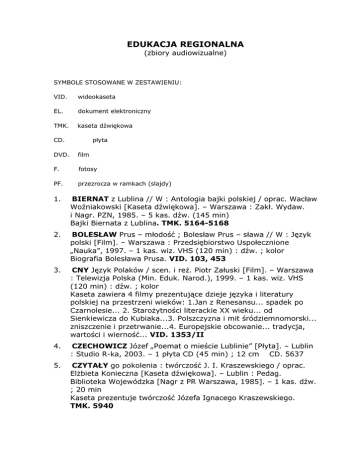 EDUKACJA REGIONALNA (zbiory audiowizualne) SYMBOLE STOSOWANE W ZESTAWIENIU: VID. wideokaseta EL. dokument elektroniczny TMK. kaseta dźwiękowa CD. płyta DVD. film F. fotosy PF. przezrocza w ramkach (slajdy) 1. BIERNAT z Lublina // W : Antologia bajki polskiej / oprac. Wacław Woźniakowski [Kaseta dźwiękowa]. – Warszawa : Zakł. Wydaw. i Nagr. PZN, 1985. – 5 kas. dźw. (145 min) Bajki Biernata z Lublina. TMK. 5164-5168 2. BOLESŁAW Prus – młodość ; Bolesław Prus – sława // W : Język polski [Film]. – Warszawa : Przedsiębiorstwo Uspołecznione „Nauka”, 1997. – 1 kas. wiz. VHS (120 min) : dźw. ; kolor Biografia Bolesława Prusa. VID. 103, 453 3. CNY Język Polaków / scen. i reż. Piotr Załuski [Film]. – Warszawa : Telewizja Polska (Min. Eduk. Narod.), 1999. – 1 kas. wiz. VHS (120 min) : dźw. ; kolor Kaseta zawiera 4 filmy prezentujące dzieje języka i literatury polskiej na przestrzeni wieków: 1.Jan z Renesansu... spadek po Czarnolesie... 2. Starożytności literackie XX wieku... od Sienkiewicza do Kubiaka...3. Polszczyzna i mit śródziemnomorski... zniszczenie i przetrwanie...4. Europejskie obcowanie... tradycja, wartości i wierność... VID. 1353/II 4. CZECHOWICZ Józef „Poemat o mieście Lublinie” [Płyta]. – Lublin : Studio R-ka, 2003. – 1 płyta CD (45 min) ; 12 cm CD. 5637 5. CZYTAŁY go pokolenia : twórczość J. I. Kraszewskiego / oprac. Elżbieta Konieczna [Kaseta dźwiękowa]. – Lublin : Pedag. Biblioteka Wojewódzka [Nagr z PR Warszawa, 1985]. – 1 kas. dźw. ; 20 min Kaseta prezentuje twórczość Józefa Ignacego Kraszewskiego. TMK. 5940 6. DOMOWE przedszkole. Cz. 1, Wiosna – Lato [Film]. – Warszawa : Telewizja Polska, 1998. – 1 kas. wiz. VHS (90 min) : dźw. ; kolor Od Marzanki do Zapusta czyli polskie zwyczaje i tradycje. Kaseta zawiera filmy: 1. Razem z Marzanką żegnamy zimę. 2. Kurpiowskie palmy. 3. Zwyczaje wielkanocne. 4. Święto naszej mamy. 5. Czy kwiat paproci kwitnie w Noc Świętojańską ? 6. Kare, siwki, kasztany. VID. 600/I, 1016/I 7. [DWUDZIESTY] 22 Lipca – 35 Lecie PRL [Fotosy]. – Warszawa : Kraj. Ag. Wydaw., 1979. – 22 k. ; cz.-b. ; 20 x 30 cm F. 11871, 11891 8. DZIECI innych Bogów / scen. Jadwiga Nowakowska [Film]. – Warszawa : Telewizja Polska (Min. Eduk. Narod.), 2000. – 2 kas. wiz. VHS (2 x 130 min) : dźw. ; kolor Kasety zawierają filmy poświęcone mniejszościom narodowym i religijnym w Polsce oraz pokazują ich wkład w kulturę narodową bądź regionalną. Tematy filmów: 1. Islam. 2. Staroobrzędowcy. 3.Prawosławie. 4. Grekokatolicy. 5. Judaizm. 6.Buddyzm. 7.Ptotestantyzm. 8. Katolicy. 9.Katolicyzm. 10. Mniejszości religijne. VID. 1342 / I-II 9. FILM o Lublinie / realiz. Natasza Ziółkowska-Kurczuk ; muz. Radzimir Dębski [Dokument elektroniczny]. – Lublin : Telewizja Polska (OTV Lublin), 2004. – 1 płyta VCD ; dźw. ; kolor ; 12 cm W programie wykorzystano fragmenty wierszy Józefa Czechowicza. EL. 64 10. FRESKI w Kaplicy Zamku Lubelskiego / scen. Adam Kulik [Film]. – Warszawa : Telewizja Polska-Telewizja Edukacyjna [Nagr. własne, 1999]. – 1 kas. wiz. VHS (30 min) : dźw. ; kolor Motywy powstania XV wiecznych fresków bizantyjsko-ruskich. VID. 460 11. JAN Kochanowski i Konterfekt Jana z Czarnolasu // W : Język polski / reż. S. Grabowski [Film]. – Warszawa : Przedsiębiorstwo Uspołecznione „Nauka”, 1997. – 1 kas. wiz. VHS (15 min) : dźw. ; kolor Film poświęcony Janowi Kochanowskiemu. VID. 102 12. KAZIMIERZ Dolny [Przezrocza w ramkach]. – Warszawa : Zakł. Wydaw. „Foto-Pam”, 1975. – 10 kl. ; kolor ; 24 x 36 mm Slajdy ukazujące Kazimierz Dolny. PF. 1752, 1858, 1859 13. KOCHANOWSKI Jan [Fotosy]. – Warszawa : Kraj. Ag. Wydaw., 1984. – 18 k. ; cz.-b. ; 24 x 30 cm Biografia Jana Kochanowskiego. F. 15448, 15449 14. KRASZEWSKI Józef Ignacy [ Fotosy]. – Warszawa : Kraj. Ag. Wydaw., 1987. – 20 k. ; cz.-b. ; 20 x 30 cm Biografia Józefa Ignacego Kraszewskiego. F. 15589, 15590 15. KRONIKARZ – rzecz o Bolesławie Prusie (1847-1912) // W : Twórcy naszej tradycji / scen. i reż. Andrzej Titkow [Film]. – Warszawa : Telewizja Polska (Min. Eduk.Narod.), 1999. – 1 kas. wiz. VHS (165 min) : dźw. ; kolor Sylwetka Bolesława Prusa. VID. 1356 /II 16. MAJDANEK / oprac. Andrzej Czekawski [Fotosy]. – Warszawa : Biuro Wydaw. „Ruch”, 1972. – 7 k. ; cz.-b. ; 10 x15 cm F. 1455 17. NAŁĘCZÓW w grafice [Fotosy]. – Warszawa : Kraj. Ag. Wydaw., 1976. – 12 k. ; cz.-b. ; 30 x 42 cm Grafika autorstwa: S. Bałdygi, K. Górniaka, J. Kursa, J. Olejnickiego, Z. Strzałkowskiego, J. Szuszkiewicza.F. 10017, 10029 18. LUBLIN / fot. Renata Próchniewicz, Arkadiusz Bor, Piotr Maciuk [Film]. – Lublin : Renata Próchniewicz CZAS-R (Studio Reklamy Filmowej), 2003. – 1 kas. wiz. VHS (30 min) : dźw. ; kolor Film o Lublinie w wersji angielskiej. VID. 1133, 1134 19. LUBLIN / oprac. Andrzej Żeromski [Przezrocza w ramkach]. – Warszawa : Zakł. Wydaw. „Foto-Pam”, 1974. – 16 kl. ; kolor ; 24 x 36 mm Slajdy o Lublinie. PF. 1447 20. LUBLIN / oprac. Klemens Tywoński [Przezrocza w ramkach]. – Warszawa : Zakł. Wydaw. „Wspólna Sprawa”, 1978. – 19 kl. Kolor ; 24 x 36 mm Slajdy o Lublinie. PF. 2110, 2510 21. LUBLIN – Berlin / oprac. Z.Święcicki [Fotosy]. – Warszawa : Kraj. Ag. Wydaw., 1978. – 9 k. ; cz.-b. ; 10 x 15 cm Wyzwalanie ziem polskich (1944-1945). F. 10750, 10760 22. LUBLIN nad rzeką Bystrzycą. Rycina z „Albumu widoków Polski” Napoleona Odry [Fotosy]. – Warszawa : Wydawnictwa Artystycz. i Film., 1979. – litografia ; 18 x 29 cm F. 12913, 12914 23. LUBLIN – połowa XX w. [Fotosy]. – Lublin : Wydaw. „Kurier Lubelski”, 2005. – 16 k. ; cz.-b. ; 10 x 15 cm Zestaw z kolekcji „Kuriera Lubelskiego” – 50 lat minęło...” zawiera ilustracje z dawnego Lublina. F. 15705 24. LUBLIN – stare miasto [Fotosy]. – Warszawa : Kraj. Ag. Wydaw., 1978. – 9 k. ; kolor ; 10 x 15 cm F. 11715, 11724, 11733 25. LUBLIN w grafice / 