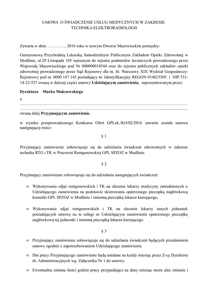 UMOWA O ŚWIADCZENIE USŁUG MEDYCZNYCH W ZAKRESIE TECHNIKA ELEKTRORADIOLOGII Zawarta w dniu ………….. 2016 roku w nowym Dworze Mazowieckim pomiędzy: Garnizonową Przychodnią Lekarską Samodzielnym Publicznym Zakładem Opieki Zdrowotnej w Modlinie, ul.29 Listopada 105 wpisanym do rejestru podmiotów leczniczych prowadzonego przez Wojewodę Mazowieckiego pod Nr 000000018544 oraz do rejestru publicznych zakładów opieki zdrowotnej prowadzonego przez Sąd Rejonowy dla m. St. Warszawy XIX Wydział GospodarczyRejestrowy pod nr. 0000 187 145 posiadający nr. Identyfikacyjny REGON 014825505 i NIP 53114-22-527 zwaną w dalszej części umowy Udzielającym zamówienia, reprezentowanym przez: Dyrektora Marka Malczewskiego a ………………………………………………………………………………………………………… …………………………………………………………………………………………........................ zwaną dalej Przyjmującym zamówienie, w wyniku przeprowadzonego Konkursu Ofert GPLek./KO/02/2016 zawarta została umowa następującej treści: §1 Przyjmujący zamówienie zobowiązuje się do udzielania świadczeń zdrowotnych w zakresie technika RTG i TK w Pracowni Rentgenowskiej GPL SPZOZ w Modlinie. §2 Przyjmujący zamówienie zobowiązuje się do udzielania następujących świadczeń: • Wykonywania zdjęć rentgenowskich i TK na zlecenie lekarzy medycyny zatrudnionych u Udzielającego zamówienia na podstawie skierowania opatrzonego pieczątką nagłówkową komórki GPL SPZOZ w Modlinie i imienną pieczątką lekarza kierującego, • Wykonywanie zdjęć rentgenowskich i TK na zlecenie lekarzy innych jednostek posiadających umowę na te usługi ze Udzielającym zamówienia opatrzonego pieczątką nagłówkową tej jednostki i imienną pieczątką lekarza kierującego. §3 • Przyjmujący zamówienie zobowiązuje się do udzielania świadczeń będących przedmiotem umowy zgodnie z zapotrzebowaniem Udzielającego zamówienia. • Dni pracy Przyjmującego zamówienie będą ustalane na każdy miesiąc przez Z-cę Dyrektora ds. Administracyjnych wg. Załącznika Nr 1 do umowy. • Ewentualna zmiana ilości godzin pracy przypadająca na dany miesiąc może ulec zmianie i nie wymaga aneksowania umowy jedynie akceptacji Udzielającego zamówienia. §4 • Przyjmujący zamówienie zobowiązuje się do rzetelnego wykonywania świadczeń z jak najlepszym wykorzystaniem wiedzy medycznej i umiejętności zawodowych z uwzględnieniem postępu w zakresie medycyny oraz zgodnie z zasadami etyki zawodowej. • Przyjmujący zamówienie zobowiązuje się do prowadzenia dokumentacji medycznej pacjentów, którym udzielił świadczenia zdrowotnego zgodnie z aktualnie obowiązującymi przepisami prawa, w tym dokumentacji medycznej elektronicznej obowiązującej u Udzielającego zamówienia. • Przyjmujący zamówienie zobowiązany jest do zgłaszania wszelkich zmian w zakresie posiadanych kwalifikacji jak również zaświadczeń lekarskich potwierdzających zdolność do realizacji przedmiotu umowy. • Przyjmujący zamówienie zobowiązuje się do przestrzegania: • Przepisów określających prawa i obowiązki pacjentów, • Standardów udzielania świadczeń zdrowotnych zgodnie z obowiązującymi przepisami prawa, • Procedur i standardów obowiązujących w GPL SPZOZ w Modlinie. • Przyjmujący zamówienie zobowiązany jest do przestrzegania przepisów ustawy z dnia 29 sierpnia 1997 roku o ochronie danych osobowych (Dz. U. z 2002 r. Nr 101, poz. 926 z późn. zm.). • Przyjmujący zamówienie zobowiązany jest posiadać w czasie trwania umowy aktualne badania lekarskie, odbyte szkolenia wstępne ogólne, stanowiskowe oraz szkolenia okresowe w zakresie BHP a także szkolenie z zakresu ochrony radiologicznej pacjenta. • Koszty badań lekarskich i szkoleń o których mowa w ust. 6 ponosi Przyjmujący zamówienie. • Przyjmujący zamówienie zobowiązany jest powiadomić pisemnie Udzielającego zamówienia (Zastępcę Dyrektora ds. Administracji) o każdej nieobecności powodującej przerwę w udzielaniu świadczeń: a) nie później niż 7 dni przed planowaną nieobecnością trwającą nie dłużej niż 3 dni. b) powinien powiadomić telefonicznie lub osobiście w nagłych przypadkach losowych niezwłocznie po zaistnieniu zdarzenia. §5 • Przyjmujący zamówienie przyjmuje na siebie obowiązek poddania się kontroli Udzielającego zamówienia, Narodowego Funduszu Zdrowia oraz innych uprawnionych organów. • Przyjmujący zamówienie ponosi odpowiedzialność za szkody wyrządzone przy udzielaniu świadczeń zdrowotnych określonych w niniejszej umowie wg zasad określonych w art. 27 ust.7 ustawy z dnia 15 kwietnia 2011 roku o działalności leczniczej z późn. zm.. • W razie stwierdzenia przez Narodowy Fundusz Zdrowia nieprawidłowości przy udzielaniu świadczeń zdrowotnych wynikających z niniejszej umowy z winy Przyjmującego zamówienie i obciążenia Udzielającego zamówienia skutkami finansowymi tych nieprawidłowości, Zleceniodawca zobowiązuje się pokryć szkody wynikłe w związku z udzielaniem świadczeń zdrowotnych na rzecz Udzielającego zamówienia. • Wykazane nieprawidłowości uznane przez obie strony jako bezsporne, będą potrącane z kwoty należnej wynikającej z zapisu § 6 ust.3. §6 • Przyjmujący zamówienie zobowiązuje się wykonywać świadczenia zdrowotne wymienione w § 1 niniejszej umowy za cenę: • • …………… zł (……………………….. złotych brutto) za 1 godzinę pracy. Przyjmującego zamówienie przysługuje zapłata za pracę wynikająca z iloczynu: • Sumy godzin udzielonych świadczeń w pracowni RTG i ceny za godzinę pracy. • Rozliczenie ilości wykonanych w ramach umowy świadczeń i ustalenie przysługującej Przyjmującego zamówienie zapłaty dokonane będzie do dnia 15 każdego miesiąca za miesiąc poprzedni na podstawie wystawionego przez Ud