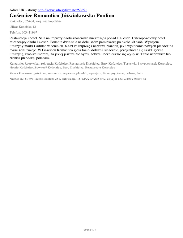 Adres URL strony http://www.adresyfirm.net/53691 Gościniec Romantica Jóźwiakowska Paulina Kościelec, 62-604, woj. wielkopolskie Ulica: Konińska 12 Telefon: 663411997 Restauracja i hotel. Sala na imprezy okolicznościowe mieszcząca ponad 100 osób. Czteropokojowy hotel mieszczący około 14 osób. Ponadto dwie sale na dole, które pomieszczą po około 30 osób. Wynajem limuzyny marki Cadillac w cenie ok. 800zł za imprezę i naprawa plandek, jak i wykonanie nowych plandek na różne konstrukcje. W Gościńcu Romantica zjesz tanio, dobrze i smacznie, przejedziesz się ekskluzywną limuzyną, zrobisz imprezę, na jakiej jeszcze nie byłeś, dobrze i bezpiecznie się wyśpisz. Tanio naprawisz lub zrobisz plandekę, polecam. Kategorie: Rozrywka i rekreacja Kościelec, Restauracje Kościelec, Bary Kościelec, Turystyka i wypoczynek Kościelec, Hotele Kościelec, Żywność Kościelec, Bary Kościelec, Restauracje Kościelec Słowa kluczowe: gościniec, romantica, naprawa, plandek, wynajem, limuzyny, tanio, dobrze, dużo Numer ID: 53691, liczba odsłon: 251, aktywacja: 15/12/2010 06:54:42, edycja: 15/12/2010 06:54:42 Strona 1 / 1