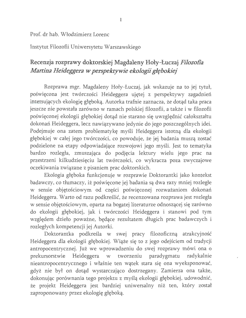 l Prof. dr hab. Włodzimierz Lorenc Instytut Filozofii Uniwersytetu Warszawskiego Recenzja rozprawy doktorskiej Magdaleny Hoły-Łuczaj Filozofia Martina Heideggera w perspektywie ekologii głębokiej Rozprawa mgr. Magdaleny Hoły-Łuczaj, jak wskazuje na to jej tytuł, poświęcona jest twórczości Heideggera ujętej z perspektywy zagadnień intersujących ekologię głęboką. Autorka trafnie zaznacza, że dotąd taka praca jeszcze nie powstała zarówno w ramach polskiej filozofii, a także i w filozofii poświęconej ekologii głębokiej dotąd nie starano się uwzględnić całokształtu dokonań Heideggera, lecz nawiązywano jedynie do jego poszczególnych idei. Podejmuje ona zatem problematykę myśli Heideggera istotną dla ekologii głębokiej w całej jego twórczości, co powoduje, że jej badania muszą zostać podzielone na etapy odpowiadające rozwojowi jego myśli. Jest to tematyka bardzo rozległa, zmuszająca do podjęcia lektury wielu jego prac na przestrzeni kilkudziesięciu lat twórczości, co wykracza poza zwyczajowe oczekiwania związane z pisaniem prac doktorskich. Ekologia głęboka funkcjonuje w rozprawie Doktorantki jako kontekst badawczy, co tłumaczy, iż poświęcone jej badania są dwa razy mniej rozległe w sensie objętościowym od części poświęconej rozważaniom dokonań Heideggera. Warto od razu podkreślić, że recenzowana rozprawa jest rozległa w sensie objętościowym, oparta na bogatej literaturze odnoszącej się zarówno do ekologii głębokiej, jak i twórczości Heideggera i stanowi pod tym względem dzieło poważne, będące rezultatem długich prac badawczych i rozległych kompetencji jej Autorki. Doktorantka podkreśla w swej pracy filozoficzną atrakcyjność Heideggera dla ekologii głębokiej. Wiąże się to z jego odejściem od tradycji antropocentrycznej. Już we wprowadzeniu do swej rozprawy mówi ona o prekursorstwie Heideggera w tworzeniu paradygmatu radykalnie nieantropocentrycznego i właśnie ten wątek stara się ona wyeksponować, gdyż nie był on dotąd wystarczająco dostrzegany. Zamierza ona także, dokonując porównania tego projektu z myślą ekologii głębokiej, udowodnić, że projekt Heideggera jest bardziej uniwersalny niż ten, który został zaproponowany przez ekologię głęboką. L Zapowiedzi Doktorantki zawarte w pierwszych fragmentach jej rozprawy idą nawet zbyt daleko, gdyż przyjrzenie się dokonaniom Heideggera w perspektywie problematyki podejmowanej przez ekologię głęboką pozwala liczyć na ujrzenie tych dokonań w innym świetle, niż jest to możliwe w innych typach lektur; ale gdy na stronie dziewiątej pisze ona, że kontekst tej ekologii umożliwi lepsze rozumienie filozofii Heideggera, zaś na dziesiątej, że w ramach paradygmatu ekofilozoficznego możliwe będzie lepsze wyrażenie sensu jego projektu filozoficznego, to popada, według mnie w pewną przesadę. Perspektywa ekologii głębokiej, ujęta jako klucz do filozofii Heideggera (s. 37), może być z pewnością płodna, ale jedynie w odniesieniu do pewnego zakresu jego dokonań. Problem, jaki Heidegger postawił w swej myśli, począwszy od Bycia i czasu, ma zupełnie odmienny charakter od tego, co związane jest z problematyką poruszaną w ramach ekologii głębokiej. Wychodzi on poza to wszystko, co było przedmiotem zainteresowania dotychczasowej filozofii i z tego względu nawiązanie do perspektywy metafizycznej, obecne zarówno we wspomnianej ekologii, jak i przyjmowanej przez Doktorantkę perspektywie, nie ma przełomowego znaczenia w spojrzeniu na rezultaty myśli niemieckiego myśliciela. Ma natomiast rację w zakończeniu rozprawy, gdy pisze ona, że nawiązanie do ekologii głębokiej umożliwia dostrzeżenie do pewnych wymiarów jego myśli, które dotąd były pomijane. Pozwala na udokumentowanie, że w pracach pisanych po roku 1930 odchodzi on od tradycji antropocentrycznej. Wydaje mi się zatem, że w książkowej wersji rozprawy (to, że zasługuje ona na wydanie książkowe nie ulega dla mnie wątpliwości, choć w tym celu będzie ona wymagała pewnych korekt, które postaram się zasugerować w dalszej części recenzji) te daleko idące zapowiedzi powinny zostać stonowane. Przechodząc do omówienia zawartości rozprawy, pragnę rozpocząć od stwierdzenia, że jest ona dobrze skonstruowana. W kilkunastostronicowym wprowadzeniu wskazany jest problem badawczy, rozważone główne pojęcia, podjęte zostają kwestie metodologiczne oraz omówiona struktura i zakres rozprawy. Doktorantka formułuje tu główną ideę swej rozprawy: Heidegger skłania do reWIZJI pewnych tradycyjnych kategorii 1 przesądów metafizycznych i przedstawiciele ekologii głębokiej nie wykorzystują w pełni potencjału jego myśli dla uzasadnienia centralnych dla swego stanowiska założeń (s. 7). W pewnym sensie Heidegger wyprzedził też ich ujęcia (s. 17). Filozofię Heideggera odczytuje ona w postaci projektu zorientowanego na 3 zasadniczą transformację postawy człowieka wobec otaczającego go świata (s. 20) i ujmuje go jako patrona radykalnego nonantropocentryzmu (s. 174). Heidegger okazuje się prekursorem ekologii głębokiej, gdyż już u niego dokonała się reorientacja miejsca człowieka w uniwersum metafizycznym i etycznym. Z tego względu jej reprezentanci mogliby jeszcze w większym stopniu nawiązać do jego dokonań, zwłaszcza odnośnie do idei egalitaryzmu ekosferycznego i do zagadnienia samorealizacji. Doktorantka od początku rozprawy nie ukrywa swego związku z głównymi ideami ekologii głębokiej. Podjęty przez nią temat osobiście ją angażuje. Dotychczasowe idee ekologii głębokiej wydają się jej nawet zbyt mało radykalne, gdyż koncepcja egalitaryzmu ekosferycznego powiązana jest jeszcze z ideą drabiny bytu przywołującą dawną metafizykę .. Wraz z tą ekologią, a także i Heideggerem poszukuje tego, co leży u źródeł ludzkiego myślenia. Wszystko to powoduje, że jej rozprawa napisana