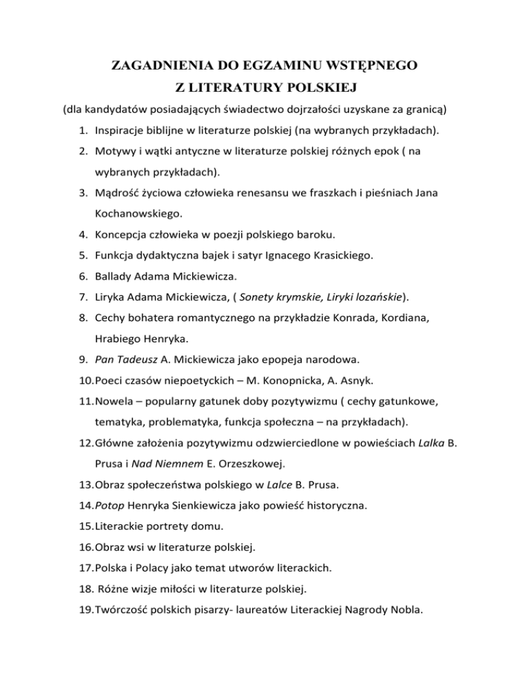 zagadnienia do egzaminu wstępnego z literatury polskiej